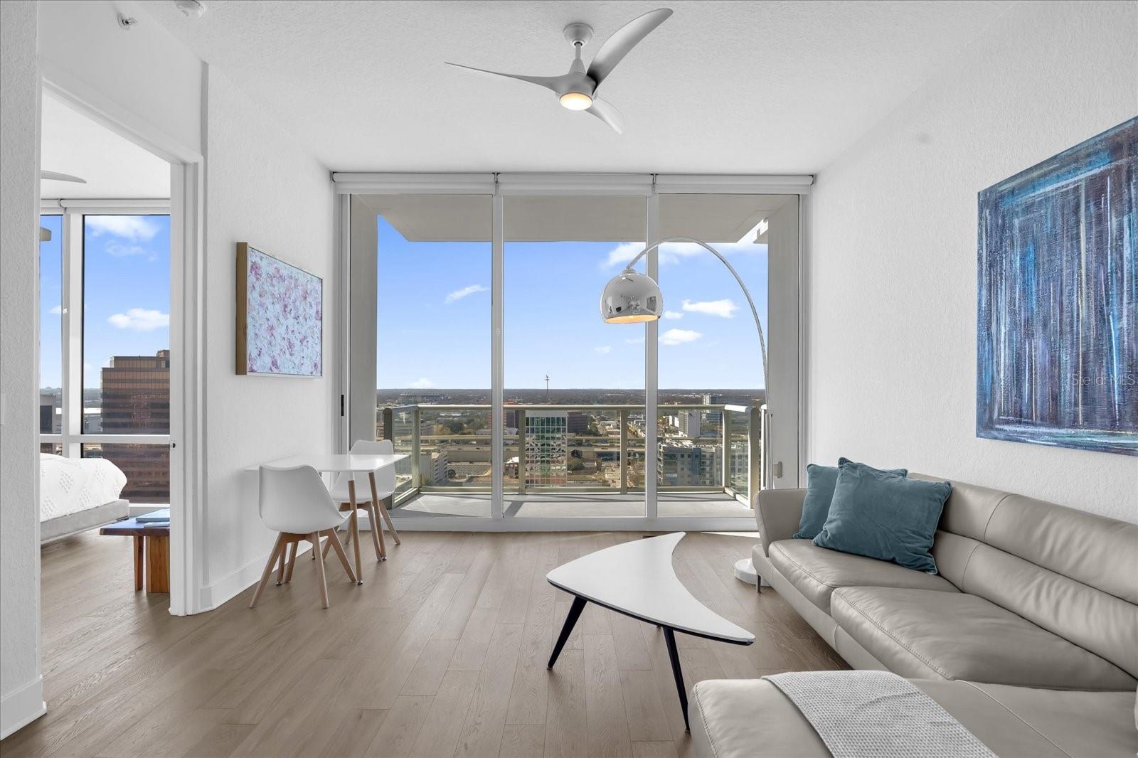 The VUE at Lake Eola - where modern luxury meets unparalleled convenience. Rising 35 stories above the city, this iconic tower offers more than just a place to live - it's a lifestyle. From floor-to-ceiling windows and sweeping views, to cutting-edge technology and world class amenities, every aspect of VUE living is designed to elevate your day-to-day experience. Located on 23rd floor, Unit #2308 (2 bed/2 bath, 1,133 SQ FT) is a thoughtfully designed space. Inside you'll find upgraded wide plank, warm wood flooring throughout - no carpet here! The kitchen features light/bright cabinetry and a textured pale blue tile backsplash that complements the sleek modern design. Great room and master bedroom are equipped with contemporary pull-down blinds that seamlessly blend with the space, while modern ceiling fans in every room add style and comfort. This home comes with 1 PARK SPOT (level 6/#609) inside the garage. Residents enjoy 24/7 security with professional guards from Marksman Security, and the front entrance boasts the only building downtown with VALET PARKING for guests and vendors. Biometric fingerprint access makes entering the building easy with the touch of your finger, eliminating the need to search for key fobs. On 7th floor, recreation and relaxation awaits you. The fitness center is the largest and most fully equipped high-rise in Orlando. The spacious club lounge offers a comfortable place to work, relax of host private events, complete with pool table and a private theater. Lounge around the pool under shade cabanas, or swim laps in the Jr size Olympic pool year-round. A basketball / tennis court rounds out the fitness amenities. Enjoy outdoor dining on the amenities deck, equipped with 2 grills, bistro tables and sofas. Walk everywhere - coffee shops, Publix supermarket, restaurants, and farmers market on Sundays. Make VUE your luxury condo lifestyle!