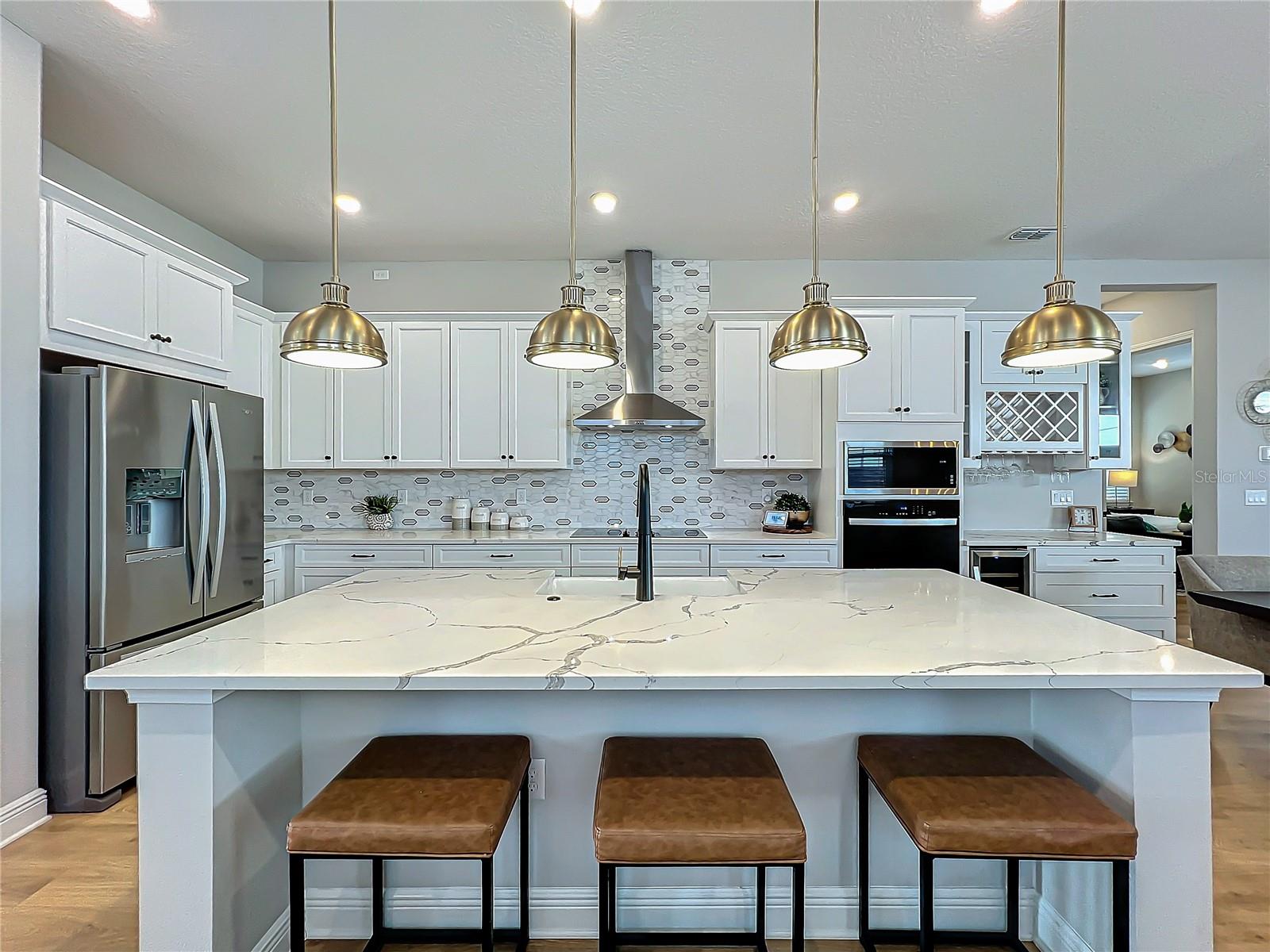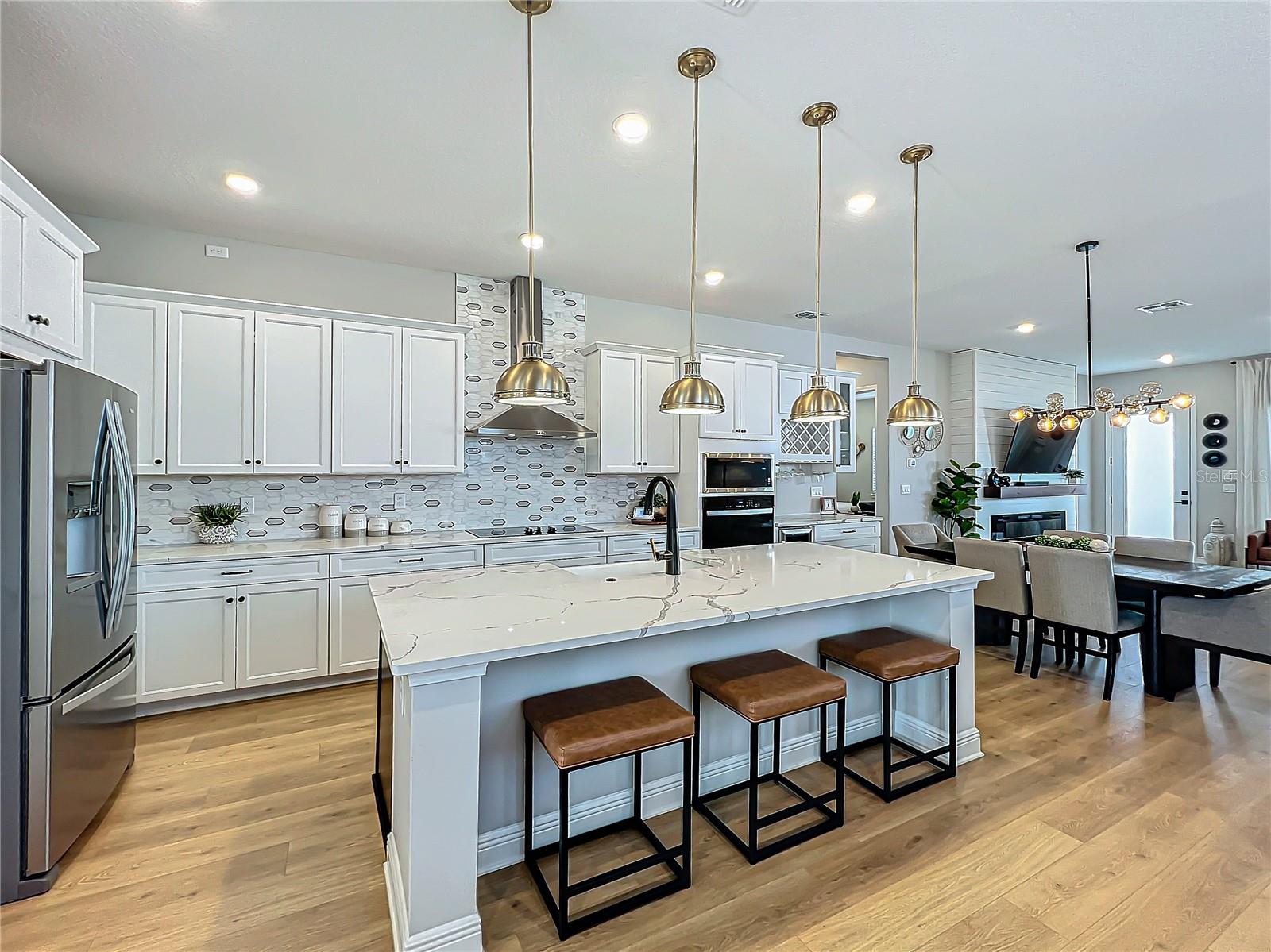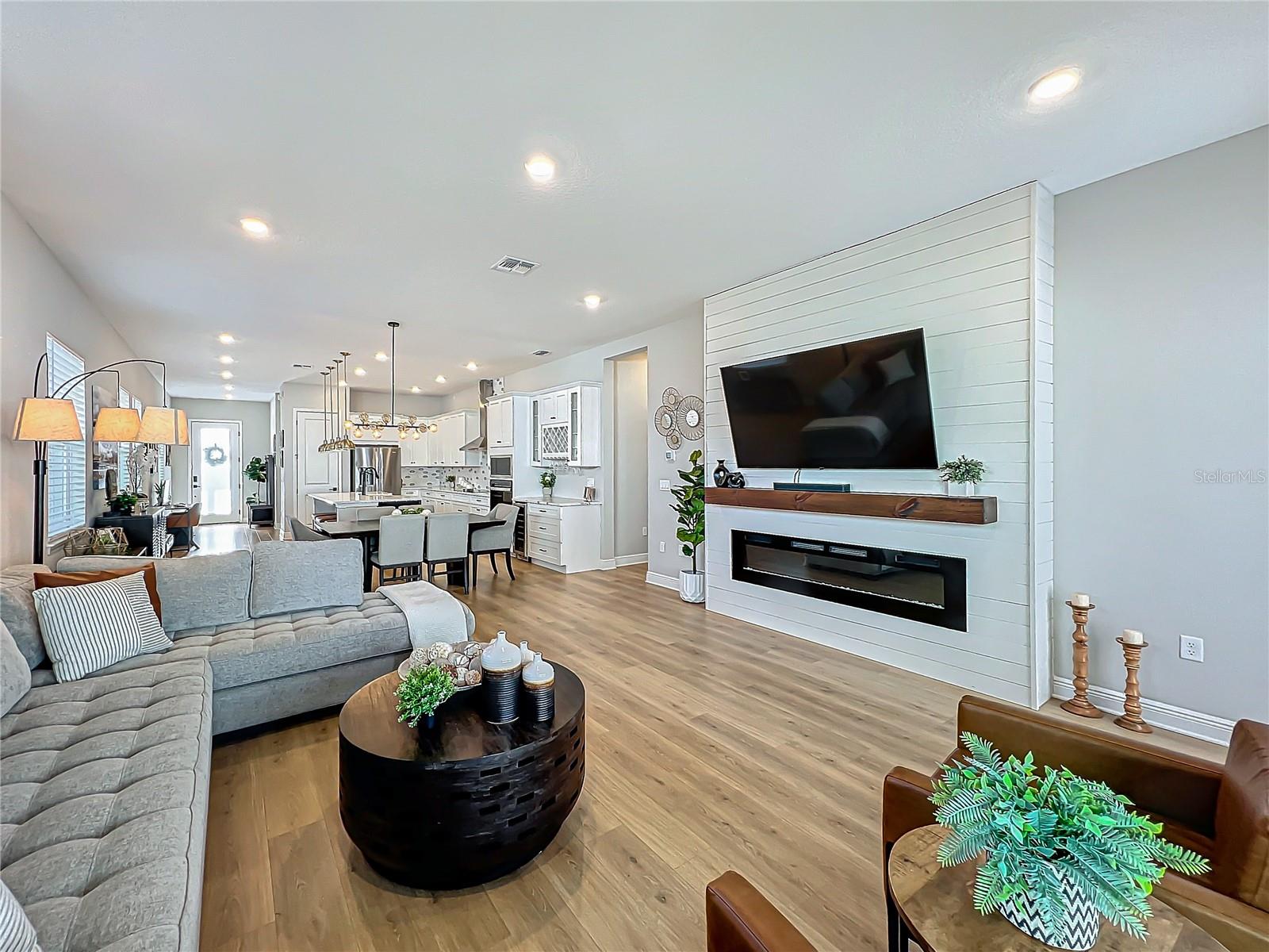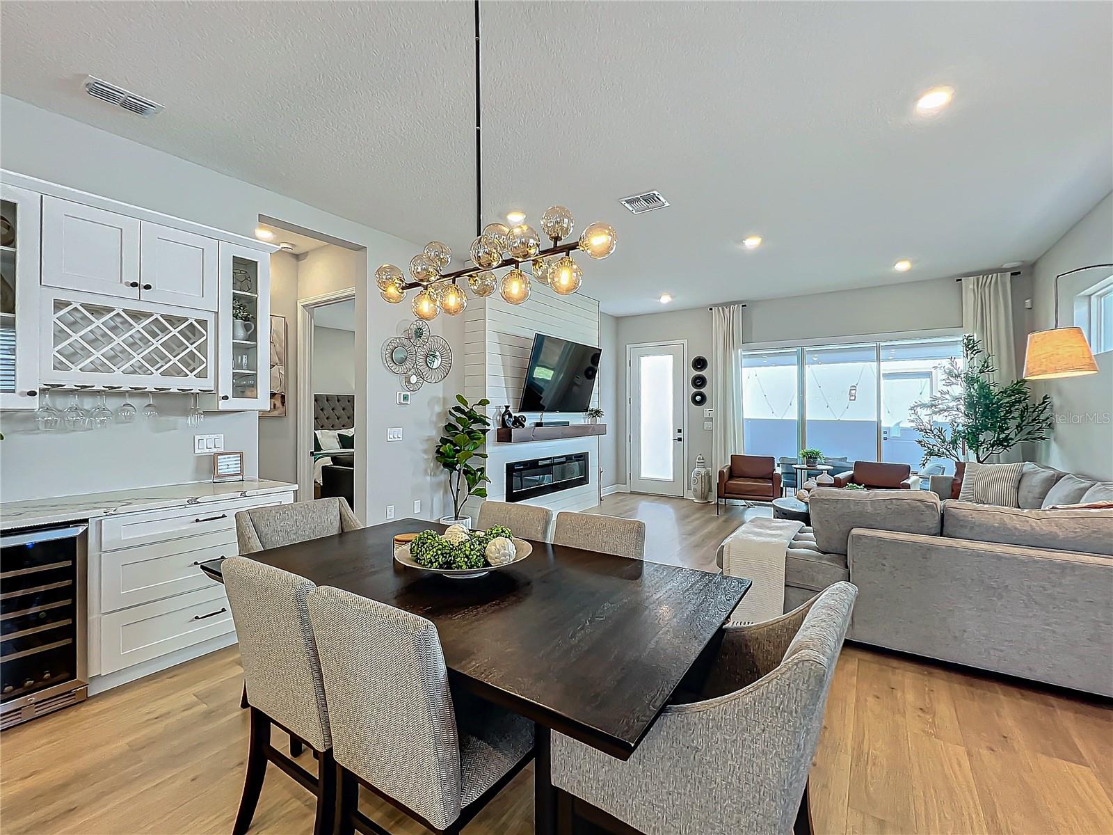 Back on the market! Step into this beautifully upgraded Tanner model by Craft Homes, a truly one-of-a-kind design that combines modern elegance with functionality. The open-concept layout, with laminate flooring throughout, offers an uninterrupted view of the stunning gourmet kitchen. Featuring sleek cabinetry, a porcelain farm sink, stainless steel appliances—including a built-in microwave and oven—quartz countertops, a spacious island, and a dry bar with a wine fridge, this kitchen is a chef's dream. The expansive living area boasts a custom electric fireplace, framed by a stylish mantel. It is bathed in natural light, with a patio door that opens up to a massive paved lanai, perfect for entertaining. The luxurious primary bedroom is designed with rustic charm, featuring barn doors leading to a meticulously designed en-suite bathroom. Here, you'll find an oversized shower and two master closets that conveniently lead to the laundry room. On the opposite side of the home, two generously sized secondary bedrooms and a beautifully appointed bathroom await. Additional features include a premium lot, 12 12-foot ceilings, Energy Star certification, pre-wiring for surround sound, and ample storage throughout. This home is located in the highly sought-after Laureate Park community in Lake Nona (Medical City). The community offers over 44 miles of walking, jogging, and biking trails. Residents can enjoy top-notch amenities, including the Aquatic Center, Fitness Center, and nearby restaurants—just a short walk from their front door!