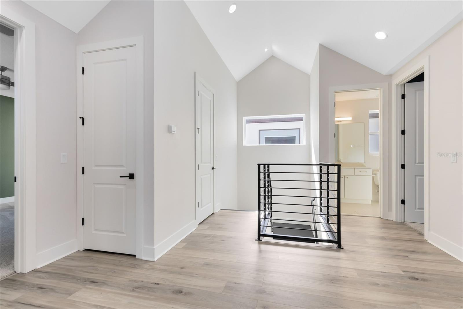 One or more photo(s) has been virtually staged. This award-winning, 4 bed, 4 bath contemporary College Park home designed by Canin Custom Homes and built by Nautilus Homes just 5 years ago will impress even the most discerning buyer. The enticing curb appeal and wide front porch welcome you to relax and soak in the College Park lifestyle. The appealing entryway with sidelight opens into the foyer with a cozy reading den or convenient office if you work from home. Luxurious LVP flooring stretches down the hall and throughout most of the home enhancing the continuity and flow of the well thought out layout. The magnificent great room with its spectacular, tongue and groove vaulted ceiling lets in plenty of natural light. The grand centerpiece of this home is the living room, dining area, and a well-appointed chef's dream of a kitchen. A private courtyard is located off the dining room - perfect for morning coffee or evening wine down. The kitchen features expansive, gleaming white countertops that complement the stainless steel, GE Cafe appliances highlighted by the five-burner gas stove with a stylish range hood. Generous counter space, custom cabinetry, and a walk-in pantry provide all you could want or need and is perfect for entertaining friends or preparing the family meal. From the great room, open the sliding glass doors and relax on your custom lanai on the back deck of your own private oasis of a backyard. The main floor contains two bedrooms, including an opulent primary suite with an eleven-foot-high tray ceiling and a roomy walk-in closet and luxurious ensuite bathroom. The second bedroom on the main floor is the perfect guest room or cozy nursery with its own adjacent bathroom. The second floor contains two more bedrooms, one with its own ensuite bathroom and both with plenty of natural light and walk-in closets. The upstairs also features a flex space bonus room that could serve as a fifth bedroom or upstairs living/rec room that opens to the large front balcony, creating yet another expanded outdoor space for relaxing or entertaining. The College Park lifestyle speaks for itself, and the location cannot be beat. Conveniently located to I-4, half a mile from Princeton Elementary, Princeton Park and Matthews Park, and the College Park community pool. Less than a mile to Advent Health and all the shopping and dining along Edgewater Drive! This home is a golden opportunity for those seeking all the luxury and benefits of new construction without the price tag. The floor plan is a brilliant use of the already generous square footage, and the multitude of outdoor space cannot be beat!