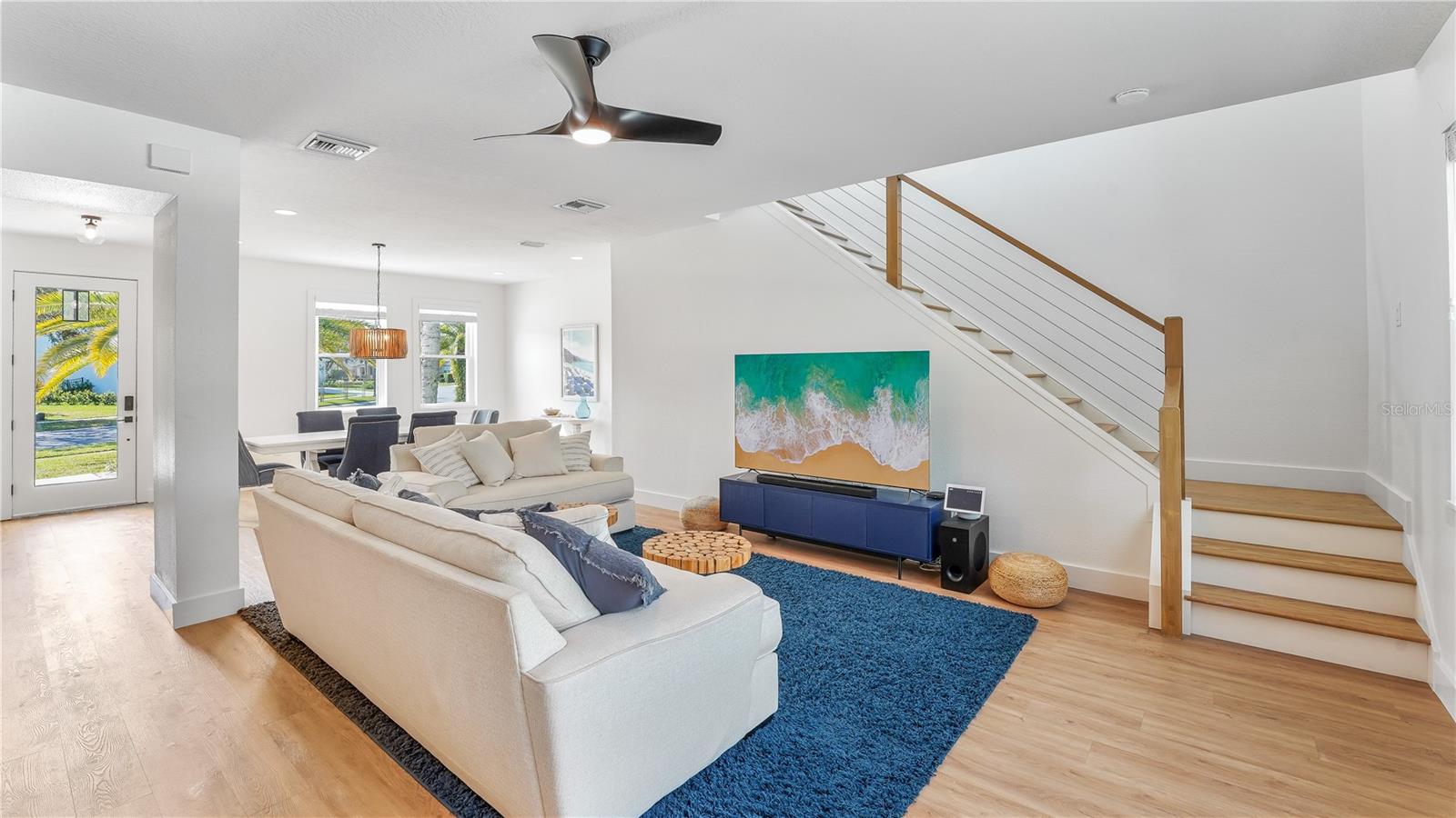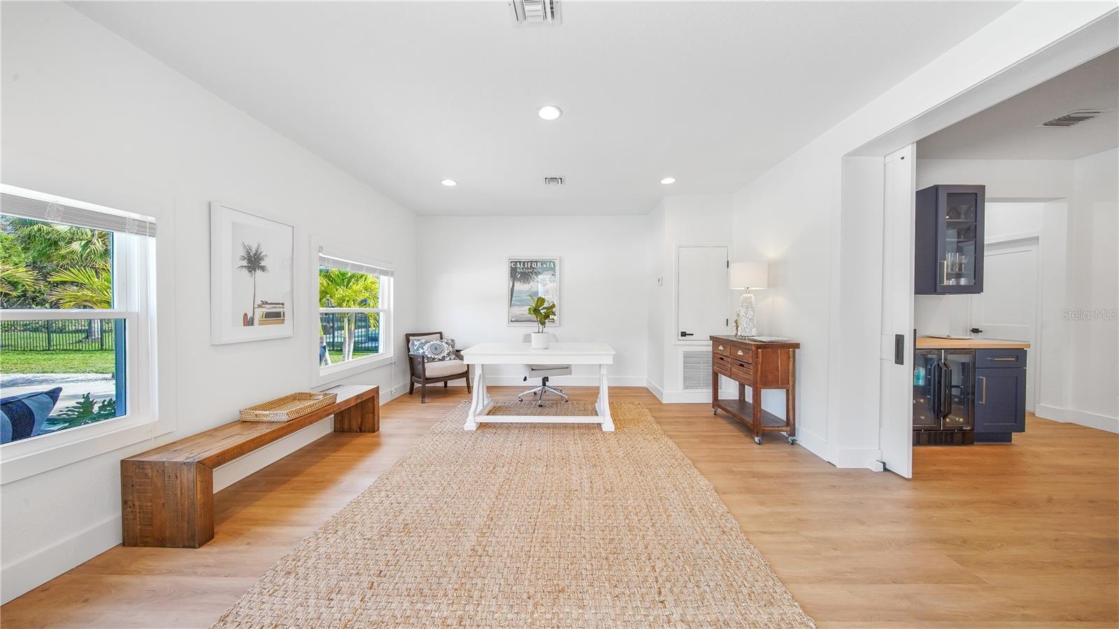 Beautifully renovated and unique two-story pool home located in the sought after Eagle Creek Golf Community in the heart of vibrant Lake Nona! This property offers the perfect blend of modern design and coastal simplicity in 3 spacious bedrooms, 2 full and 1 half bathrooms, and two versatile flex spaces. The bright open concept floor plan provides plenty of room for comfortable living and entertaining with both family and friends. The upscale kitchen was thoughtfully designed with style and function in mind, including a stunning oversized quartz island and dry bar. Views from the kitchen, living room, and Florida room showcase the dreamy backyard and covered lanai. Warm wood toned NuCore luxury vinyl floors run throughout the entire home creating an inviting atmosphere that begs to be lived in. Travertine natural stone decking, recently installed in 2022, surrounds the sparkling pool and lanai perfectly complementing the lush landscaping and creating an outdoor space made for entertaining. This home is move-in ready and truly offers everything you need for a modern and relaxed lifestyle convenient to everything Lake Nona has to offer. Energy efficient features of this home include a hybrid water heater, solar panels (paid in full!), new windows installed 2024, new roof installed 2019, new HVAC system installed 2021/22, and ComforMatic AC unit installed in garage as well as epoxy glaze in 2023! Zoned top-rated Lake Nona schools with access to the public Eagle Creek Golf Club which offers a beautiful 18-hole golf course, clubhouse, pro shop, restaurant and tavern. Recreational amenities for residents include swimming pools, exercise gym, tennis courts, basketball courts, and playgrounds. The central location puts you just minutes from Medical City, Lake Nona Performance Club, Lake Nona Town Center, Boxi Park, Drive Shack, and United States Tennis Association National Training Facility. This home is located 16 minutes from Orlando International Airport (MCO), 30 minutes from Walt Disney World, 30 minutes from Universal Studios Florida Theme Park and 30 minutes from Sea World Orlando. Ready to live a life of comfort, convenience and modern luxury? Call today!