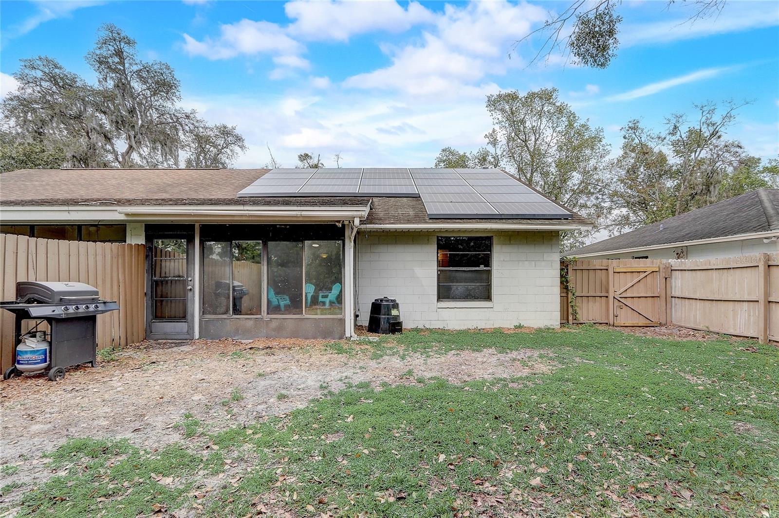Charming 2-Bedroom, 2-Bath with Tesla Solar System : Paid off – Move-In Ready! Immediately available, this 2-bedroom, 2-bathroom duplex is perfectly situated near dining, shopping, entertainment, and major highways including 408, 417, and I-4, offering both convenience and comfort. Inside, enjoy laminate and tile flooring throughout, an open kitchen and dining area, and a spacious great room with high ceilings and skylight. A standout feature is the enclosed porch with AC and heat, providing a versatile bonus room or flex space to fit your needs. The fenced backyard is perfect for pets, while the oversized 1-car garage offers ample storage. Plus, with a Tesla whole-house solar system, you'll enjoy energy efficiency and savings. Located at the end of a quiet street with no drive-through traffic, this home offers privacy and tranquility. This is a must-see to truly appreciate—schedule your showing today!