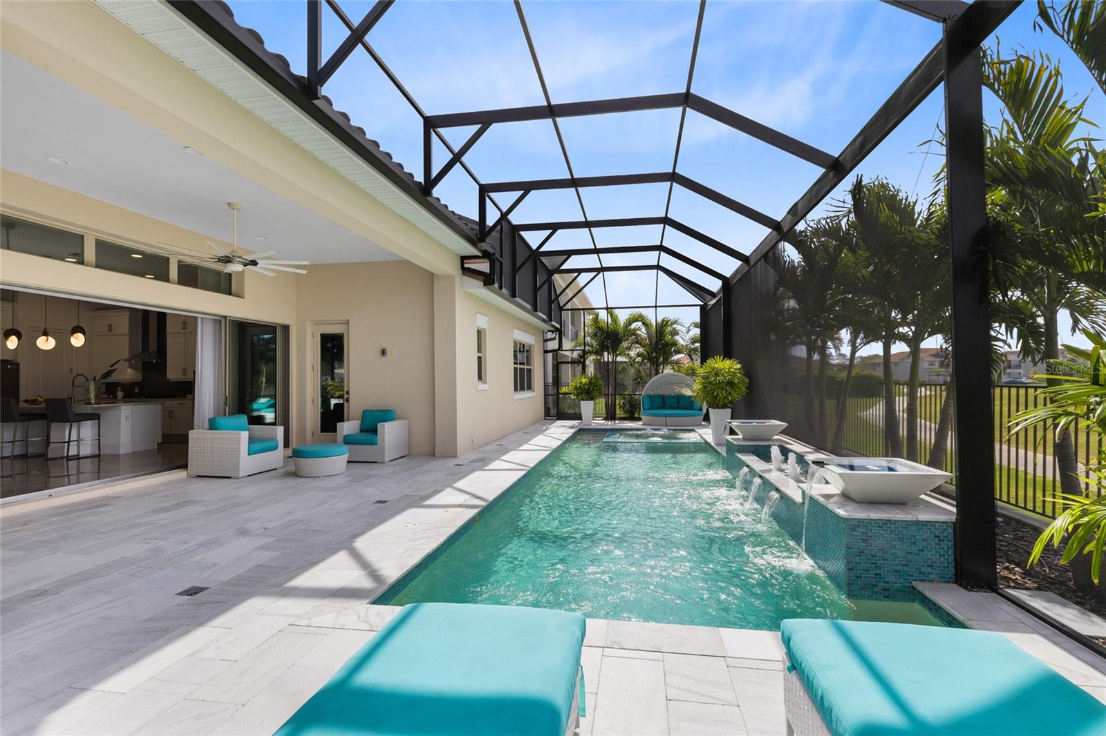 Welcome to an architectural gem in the esteemed Eagle Creek community, crafted by Jones Homes in Lake Nona. This 2021-built residence exudes luxury, with water views, framed by lush landscaping and featuring smart exterior enhancements such as a remotely controlled irrigation system and security lighting. Spanning 3,170 square feet, this home showcases an open floor plan that seamlessly connects the living spaces to the outdoor pool area, creating an expansive atmosphere ideal for entertaining. The residence offers four spacious bedrooms and four elegantly appointed bathrooms. The master suite is a true sanctuary, featuring double doors leading to an exquisite ensuite with a standalone Kohler tub, double shower heads, and a luxurious walk-in closet with custom-built extra-tall storage solutions, providing ample space and organization. The heart of the home is the stunning kitchen, a marvel of modern design and functionality. It features sleek white cabinetry that reaches up to the ceiling, maximizing storage space without compromising style. The large central island, topped with pristine white granite, serves as both a prep area and a gathering spot, complete with stylish seating. State-of-the-art stainless steel appliances, including a built-in oven and a contemporary gas cooktop with a sculptural exhaust hood, cater to every culinary need. The kitchen’s layout flows effortlessly into the dining and living areas, highlighted by elegant pendant lighting and large windows that draw in natural light and offer views of the tranquil outdoor living space. The smart home system extends to the pool, featuring saltwater treatment, heating, jacuzzi jets, and programmable lighting—all controllable via smartphone. The lanai, paved with travertine and pre-plumbed for a BBQ setup, offers a panoramic view through a screen cage, enhancing the outdoor living experience. This smart home features 8MP HD colored security cameras with live and motion-activated 2-way communication accessible via an app, without the need for a subscription, along with a centralized security alarm system ready for service activation. Additional amenities include a three-car garage, a tankless water heater for efficient energy use, and cable-ready installations. The smart light switch system allows for adjustable, programmed schedules for both indoor and outdoor lighting. Eagle Creek Village offers top-tier amenities, including a 24/7 gated entrance, modern recreation center, championship golf course, tennis and pickleball courts, resort-style pools, and scenic trails. Enjoy a prime location near Lake Nona’s Medical City, top dining, shopping, and major highways. This isn’t just a home—it’s a lifestyle of comfort, style, and sophistication. Experience luxury living redefined. Schedule your private tour today!