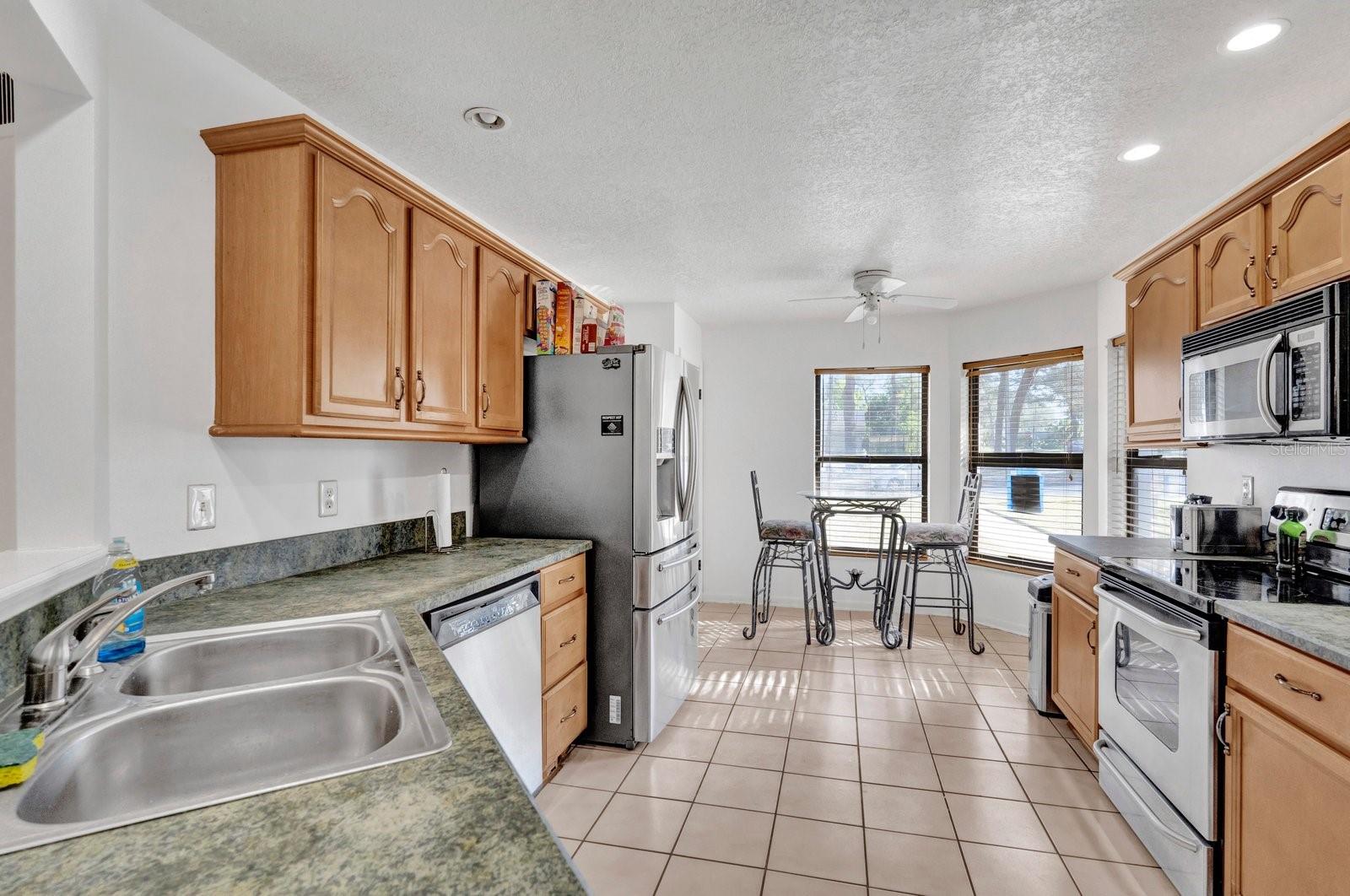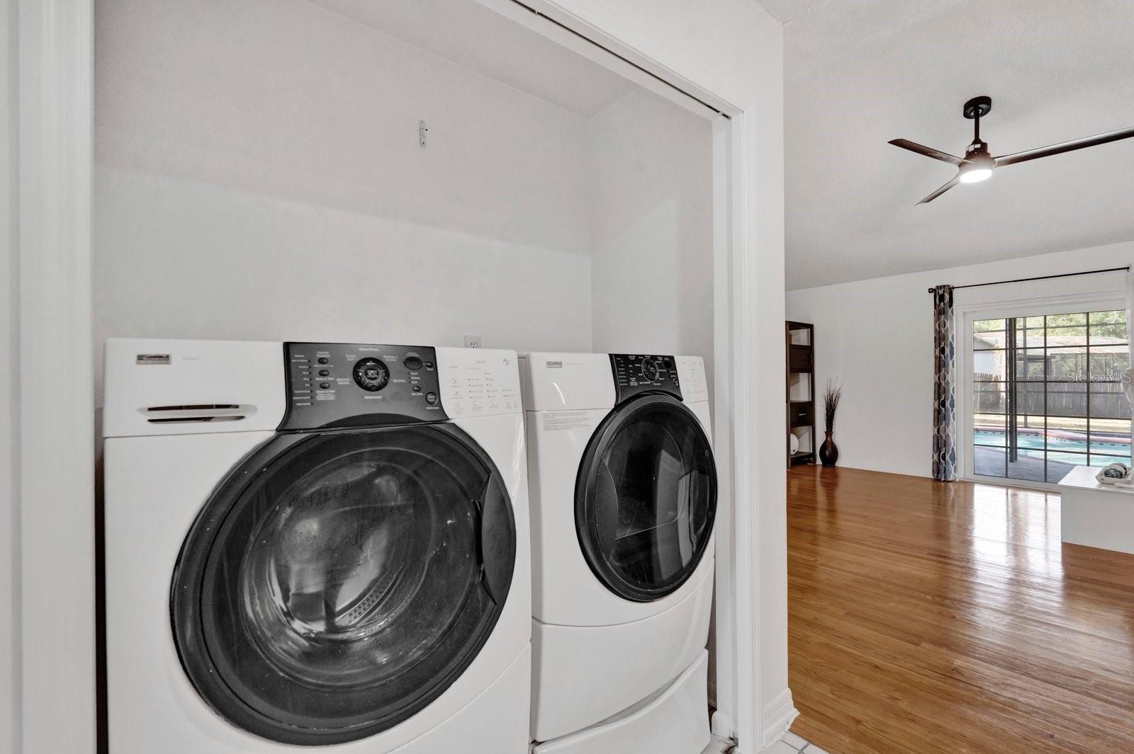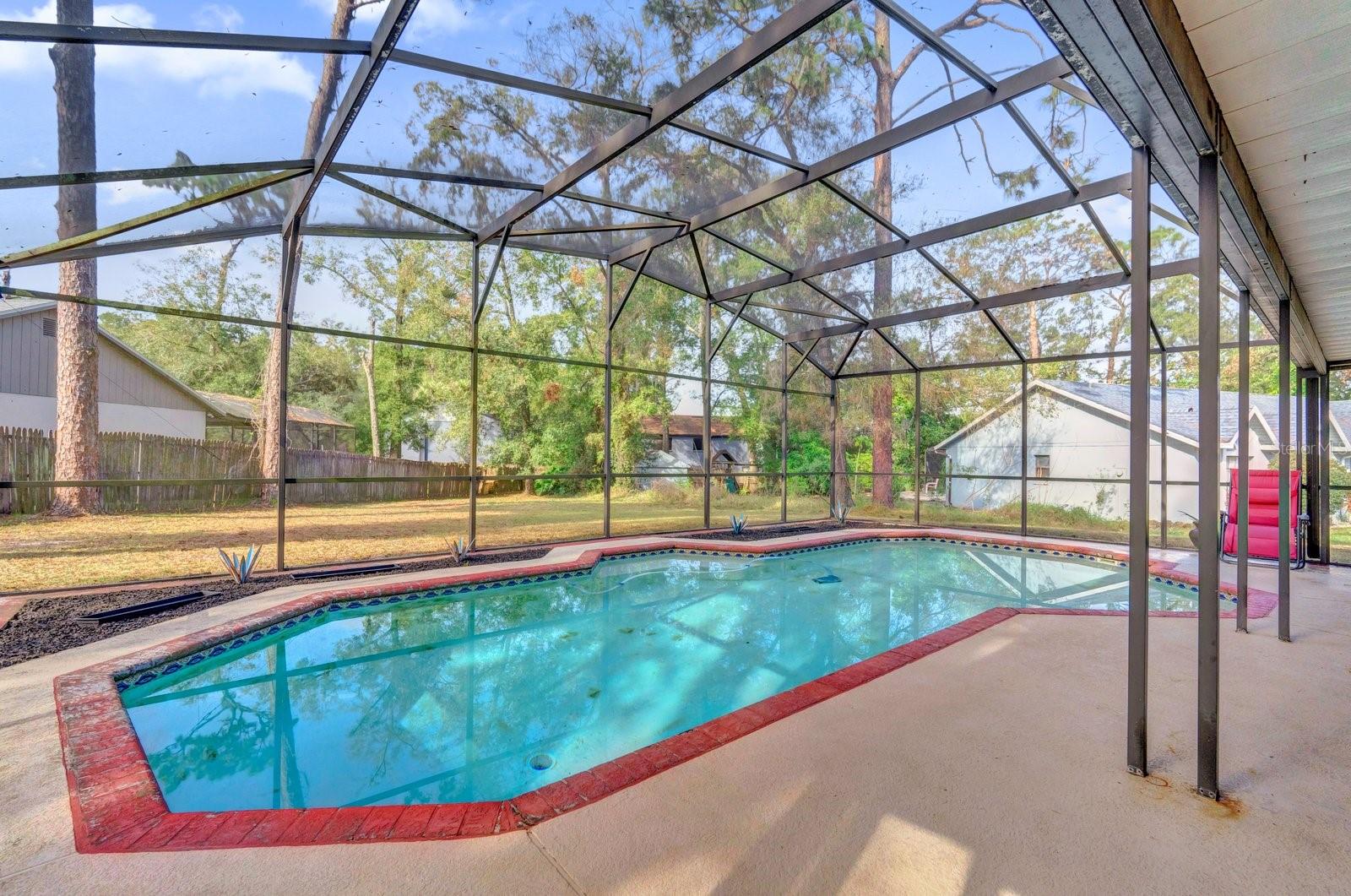 Welcome to this delightful one-story home in the highly sought-after Windsong Estates! Brand New Roof installed in 2025, an open floor plan and a bright, airy living space, this 3-bedroom, 2-bathroom home is the perfect place to create lasting memories. The spacious living room features views of the sparkling swimming pool, offering a relaxing backdrop for everyday life. The cozy kitchen boasts brown cabinets and a charming breakfast nook, ideal for enjoying your morning coffee. Laminate flooring flows seamlessly throughout the home, adding both style and practicality. The bathrooms are thoughtfully designed, including a bathtub with a built-in shower for your convenience. With a 2-car garage and ceiling fans to keep things cool, this home combines comfort and functionality. Located in a friendly neighborhood, you'll have quick access to schools, shopping, parks, and all the amenities you need. This is more than just a house; it's the place where your story begins.