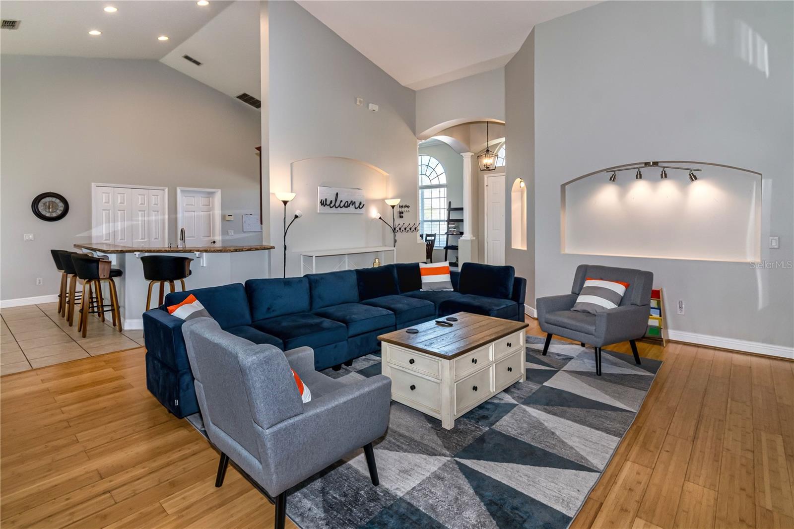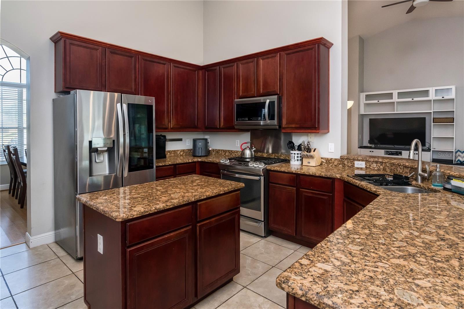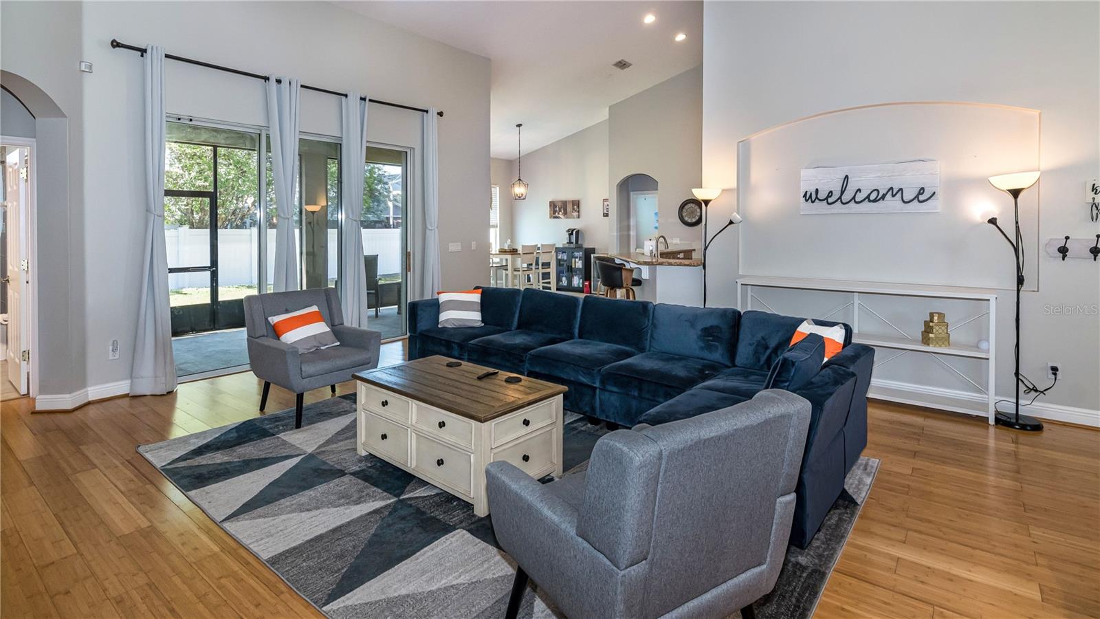 Expect to be impressed with this beautifully appointed home in the desirable Landings at Lake George, a secure, gated community. It starts with great curb appeal – meticulously manicured lawn, lush landscaping, paver driveway and new roof (2024!). Water Heater is new and replaced in 2025. Room for everyone and everything – abundant common living space with 4 bedrooms (3 way split layout) and 3 full baths. Step inside to open spaces designed as living/dining rooms but are versatile to arrange to suit your needs. In the heart of the home, you’ll find a contemporary kitchen which is open to a spacious family room – each making a great gathering space. Kitchen boasts granite counters, island, breakfast bar, abundant raised panel cabinetry, closet pantry and an eat-in nook that can seat a crowd. Primary suite is on one side of home (by the kitchen) – ideal for privacy. The bedroom is large enough for a sitting area or private desk and features a walk-in closet and ensuite bath w/soaker tub, separate shower and split vanity arrangement. Two generous sized bedrooms have access to a full bath, and a third bedroom/full bath are off the family room in the back, making an ideal guest suite. Other notable features: tray ceilings in living room, dining room, & primary suite, recessed niche shelving w/decorative lighting in family room, mitered glass window in kitchen and overhead storage racks in garage. Out back you’ll enjoy a screened lanai – great spot for relaxing or entertaining. Overall ideal location – Within 10 minutes you can be at essential shopping spots (Publix, Lowes, Walmart), and SR 408. You’re only about 15 minutes to the airport and practically around the corner from the wonderful Barber Park where there are ball courts, a fitness path, splash park, picnic spots and more! This home SHINES, both inside and out. Come see all that makes living here so special.