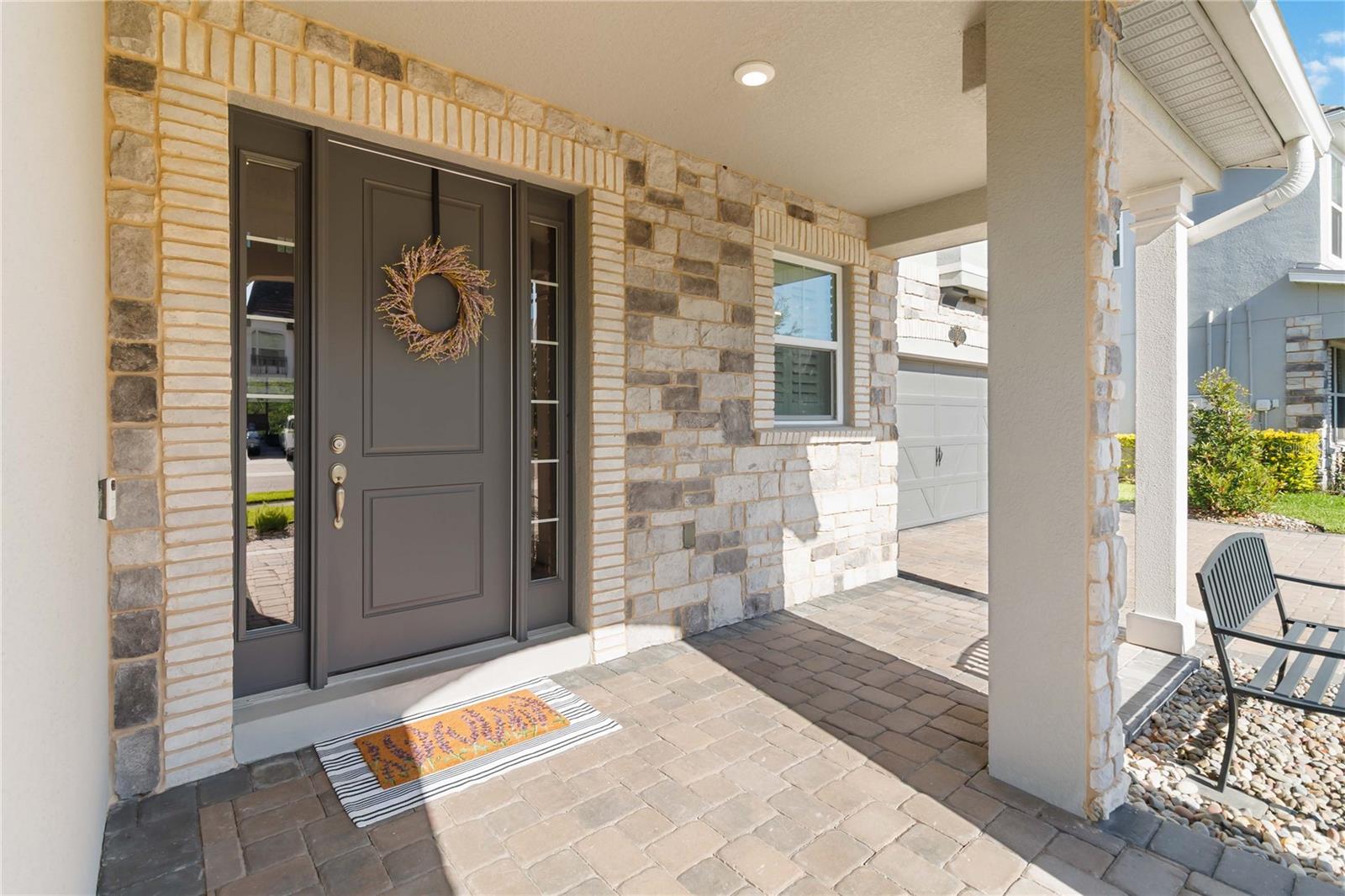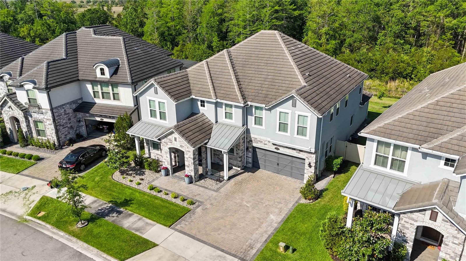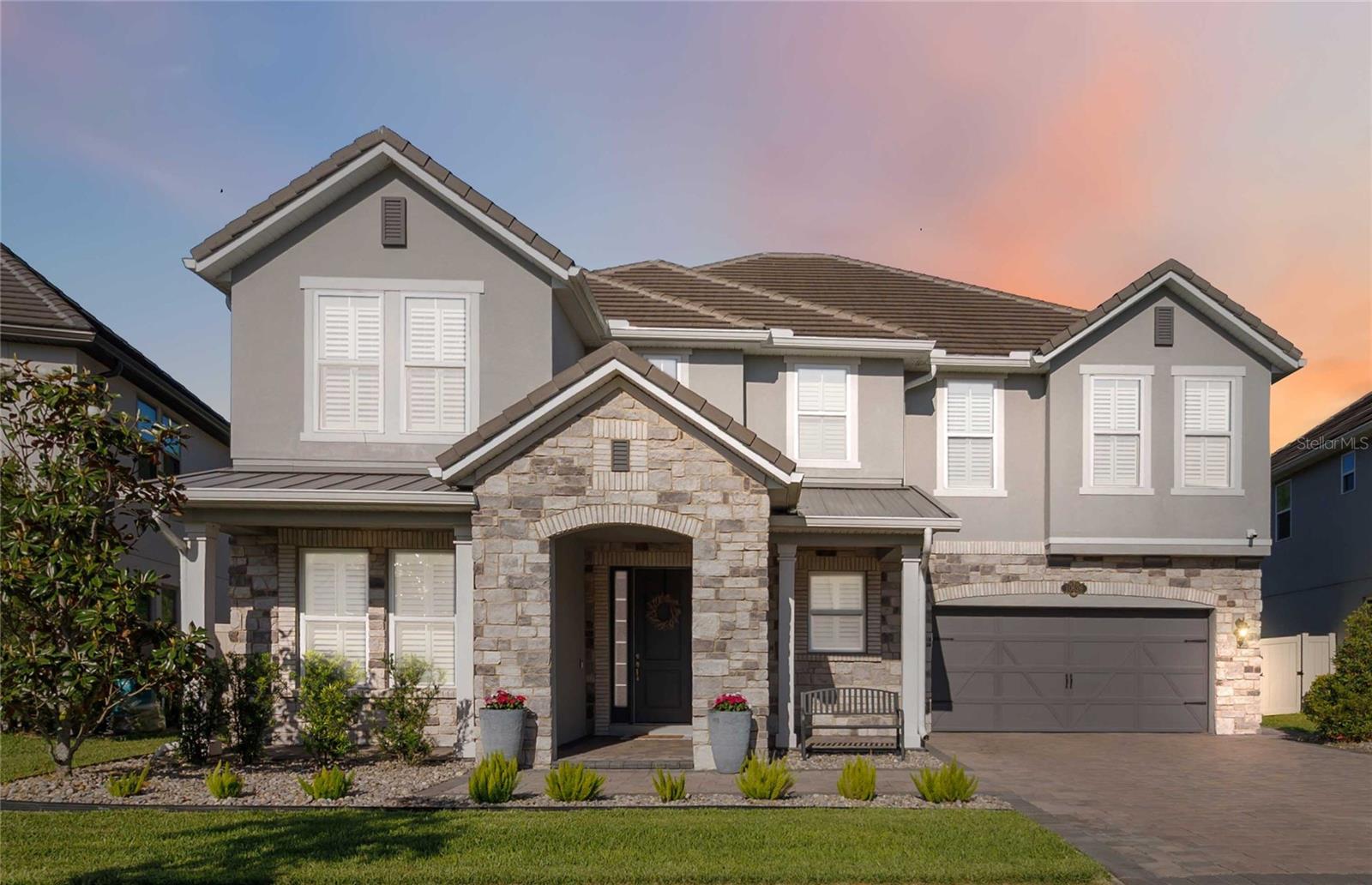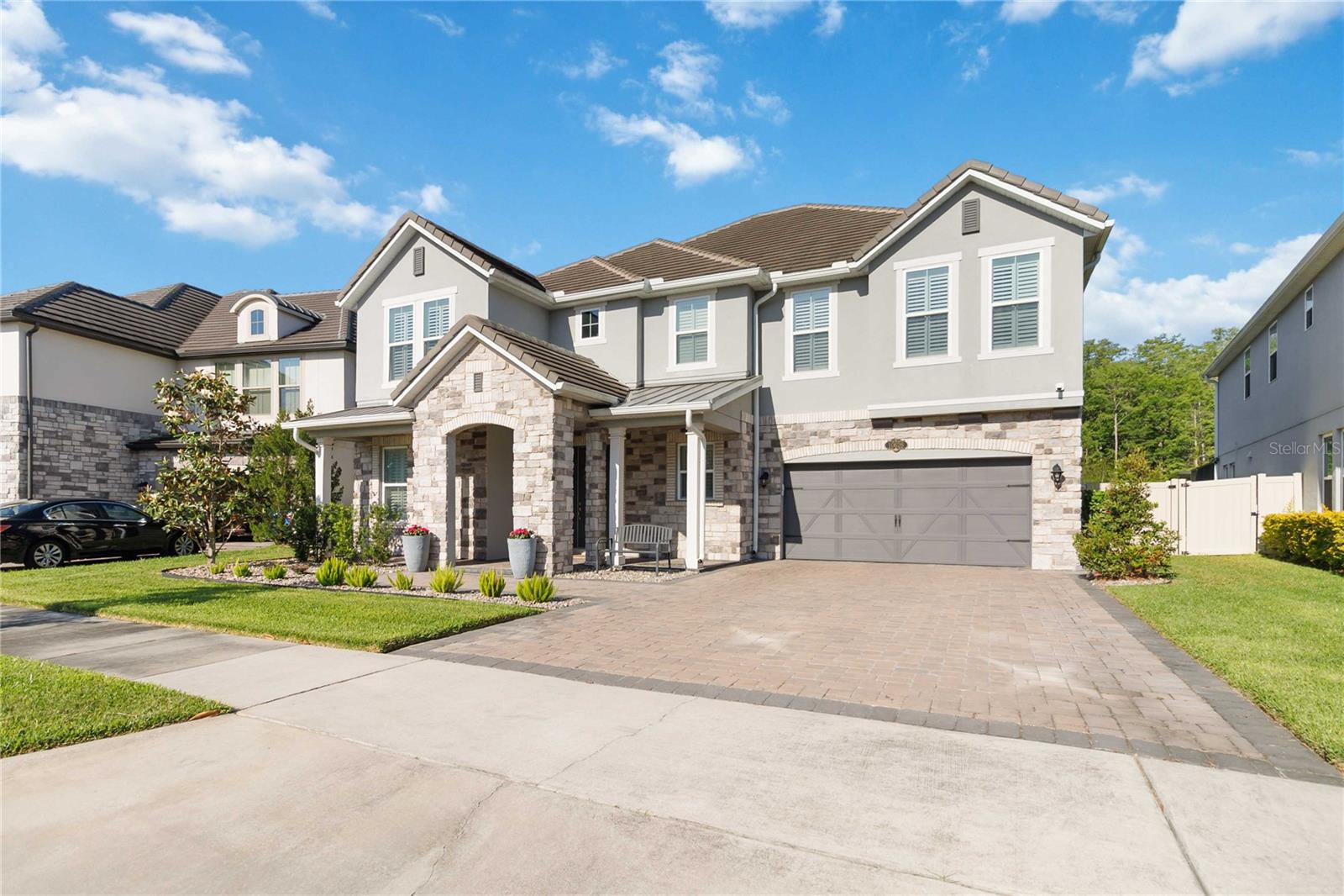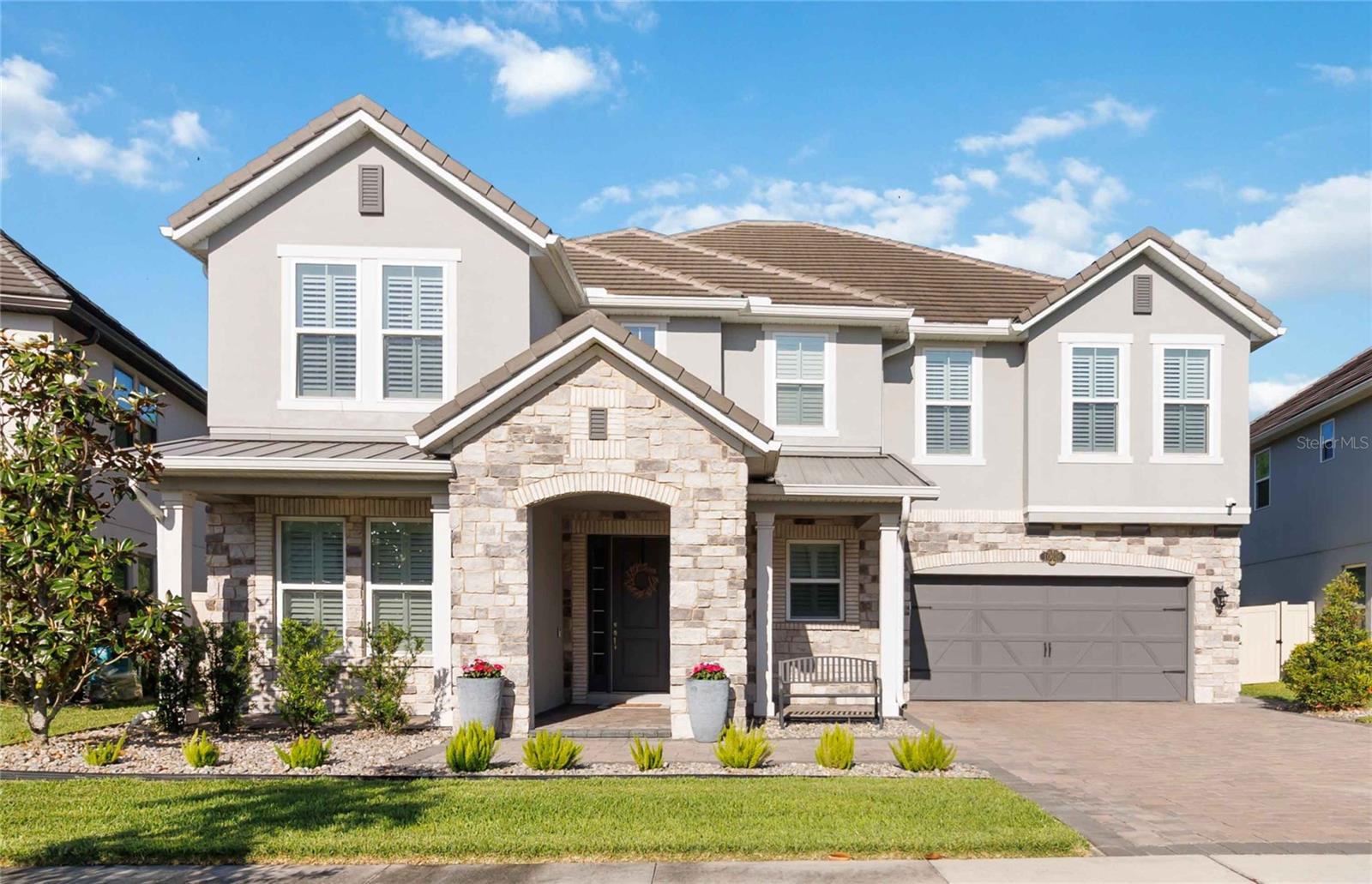 Assumable VA Loan at 2.75% interest! Step into luxury in this impeccably designed home, filled with high-end upgrades and smart home features. From the moment you arrive, the extended paver driveway, stone façade, and manicured landscaping set the stage for quality craftsmanship and stunning curb appeal. A welcoming front porch invites you in with charm and warmth. Located in the gated community of Belle Vie in Lake Nona, this home sits on just under a quarter-acre conservation lot, offering both privacy and peaceful natural views. Enjoy peace of mind with wired exterior cameras, a fenced backyard, a hurricane-rated garage door, Lorex smart doorbell, and a Rain Bird irrigation system keeping your home secure, private, and lush. Inside, the gourmet kitchen is a chef’s dream. Outfitted with KitchenAid appliances, a farmhouse sink, quartz countertops, convection wall oven and microwave, vented range hood, custom tile backsplash, under-cabinet lighting, and a butler’s pantry with a beverage fridge, it blends beauty with function. The home’s interior shines with engineered hardwood floors, plantation shutters, and crown molding in the office, dining room, and owner’s suite. A glass-enclosed office offers a bright, modern workspace with quiet seclusion—perfect for working from home. The main-level owner’s suite is a tranquil retreat featuring custom wood doors, built-in closet shelving, and luxurious comfort. Upstairs, a private en-suite bedroom is perfect for guests or multigenerational living. Entertainment is elevated in the dedicated theater room, complete with a surround sound system and elevated seating riser for a true cinematic experience. Efficiency and connectivity shine with two Carrier A/C units, Nest thermostats, a hybrid water heater, water softener, and a built-in On-Q® Smart Home Hub. Additional highlights include a coated garage floor, keypad garage entry, a laundry room with utility sink and upper cabinets, and thoughtfully placed power outlets in the pantry, closets, and linen storage areas for added convenience. Washer and dryer, bench, and tall planters in the front yard convey with the sale. Please note: Interior cameras and floor-mounted garage shelving do not convey. This home offers the perfect blend of luxury, comfort, smart living, and thoughtful detail—truly a one-of-a-kind property in a prime location. Don’t miss the opportunity to make it yours. Schedule your private showing today!