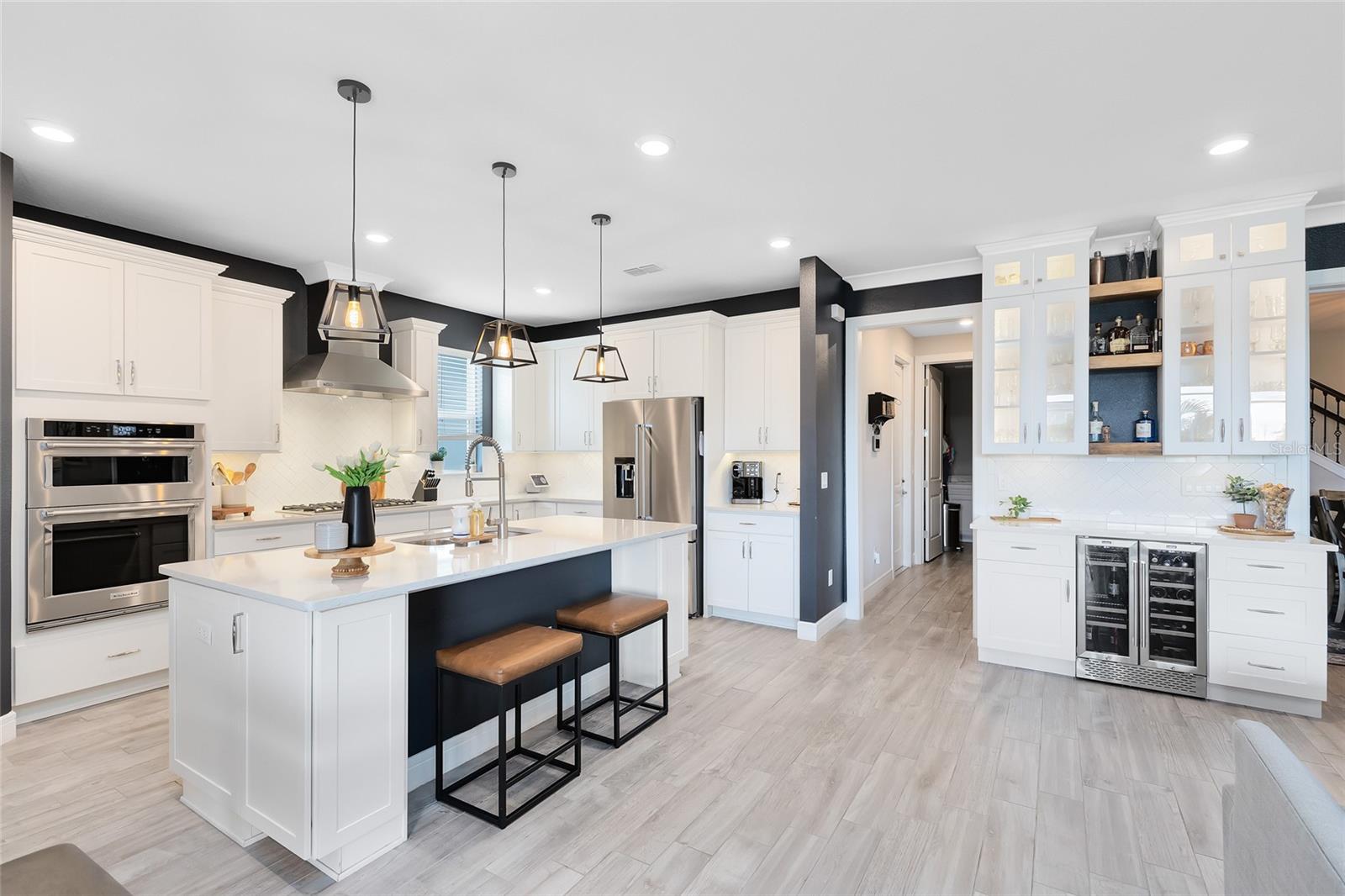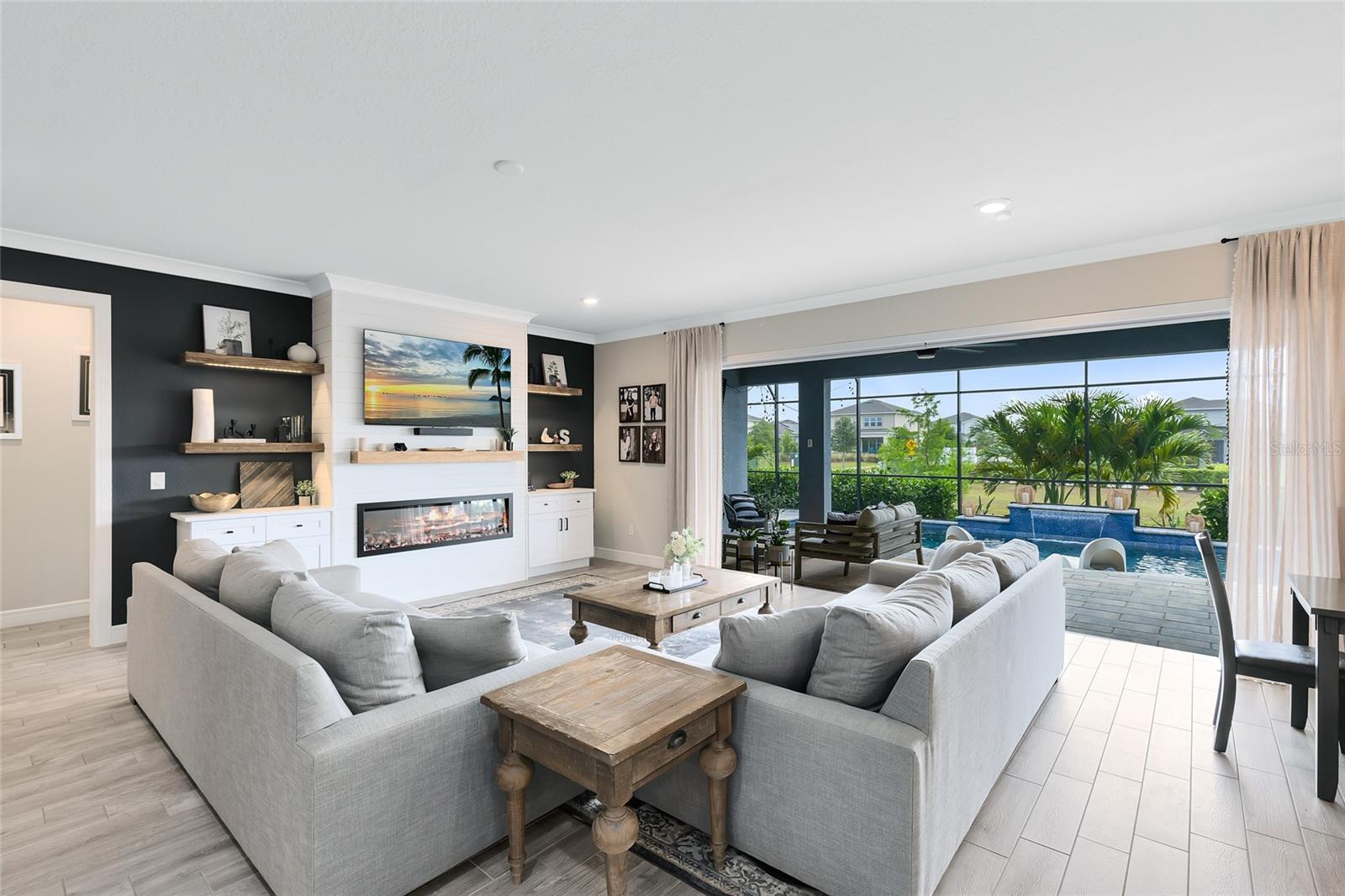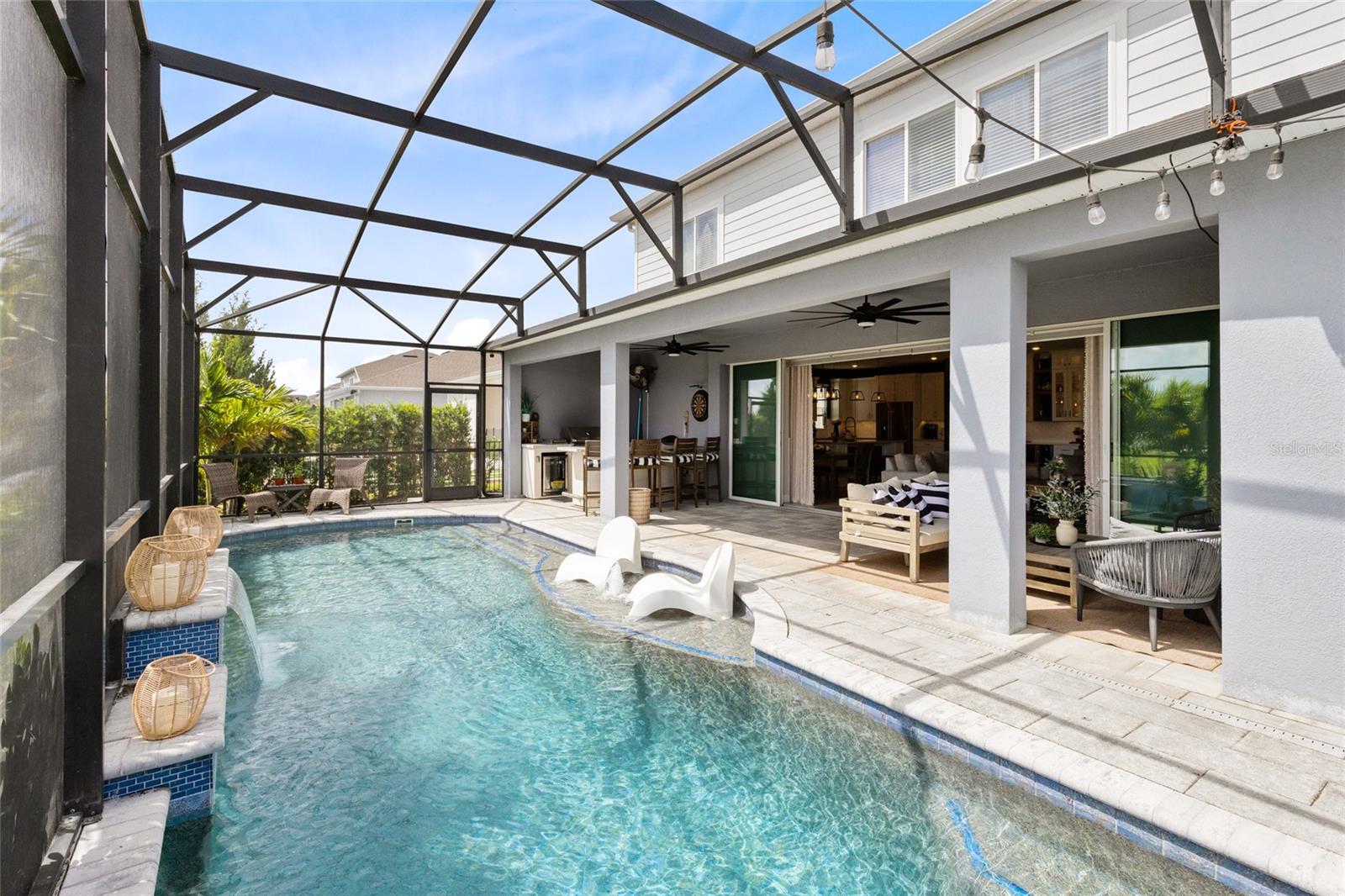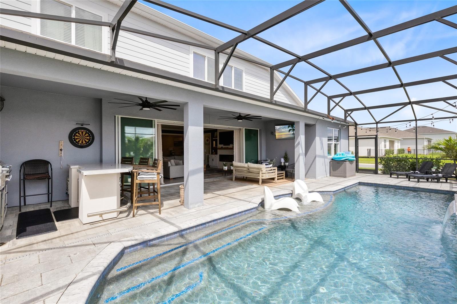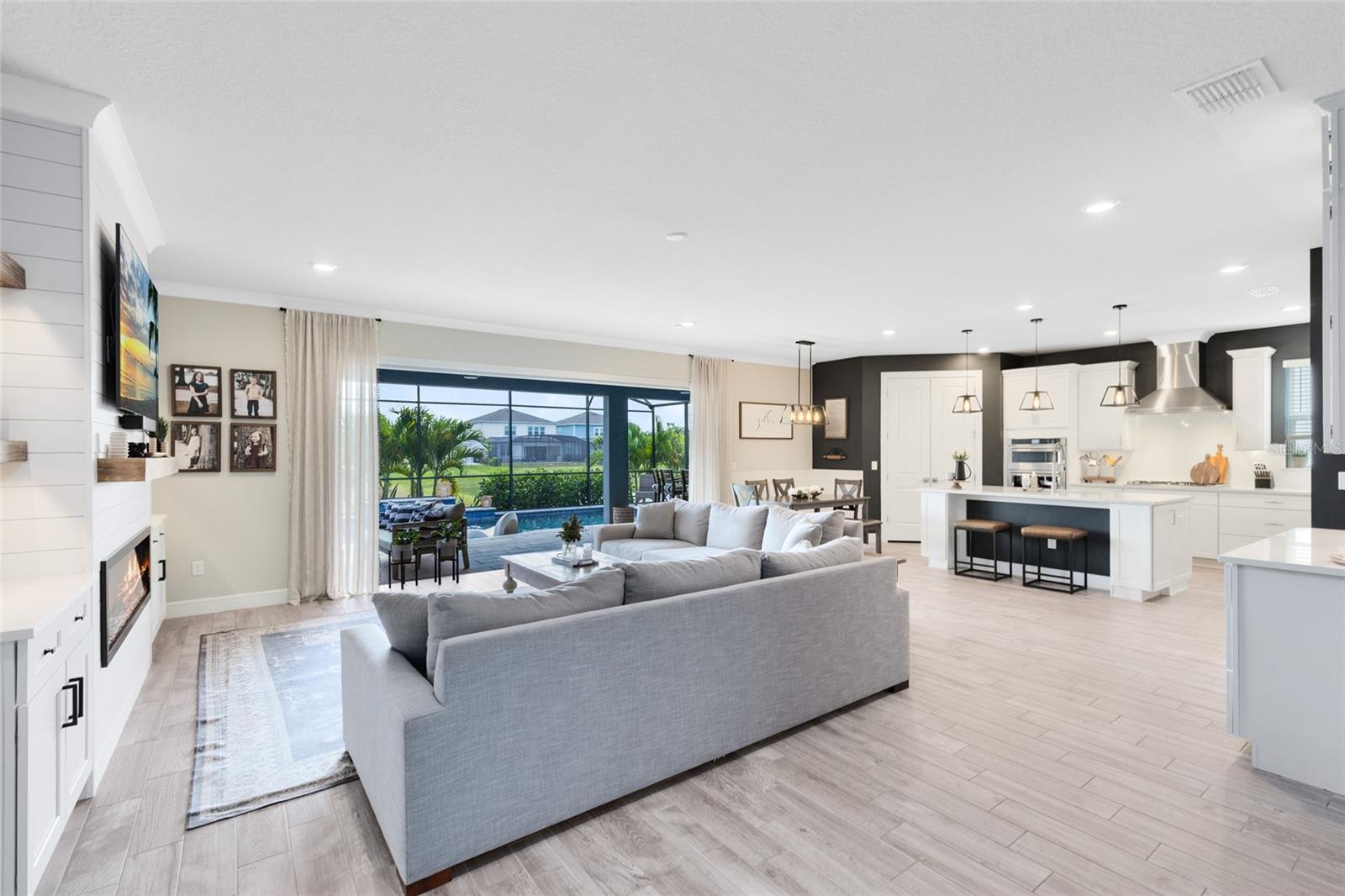 Step into luxury with this extensively upgraded 5-bedroom Easley model with water views, offering over 4,100 sq ft of curated living space on a beautifully landscaped corner lot in the Isles of Lake Nona. Thoughtfully designed for both everyday living and entertaining, this home blends custom craftsmanship with resort-style amenities. From the moment you enter, you're welcomed by crown molding, cased openings, wood-look tile floors, and a bright, open floor plan. The dedicated dining room stuns with a bold accent wall and modern light fixture—perfect for hosting gatherings in style. Just beyond, the gourmet kitchen is equally impressive with granite countertops, a massive island, Viking and KitchenAid appliances, a double oven, under-cabinet lighting, and a custom walk-in pantry with built-ins and wine storage. A sleek dry bar with wine fridge elevates the entertaining experience. The family room features a built-in electric fireplace, floating wood shelves, and expansive 16’ pocket sliders that fully open to a private screened lanai. Outside, enjoy a sparkling pool with sun shelf and waterfall features, a full outdoor kitchen with grill, sink, and burner, and a bar with built-in Bluetooth speakers—all surrounded by lush, upgraded landscaping. The first-floor primary suite offers a peaceful retreat with a tray ceiling, accent wall, and spa-like bathroom with dual vanities, large walk-in shower, and a fully customized closet. Upstairs includes a large loft with an 85” TV (included), custom closets in every room, and a versatile bonus room currently used as a home gym. Additional highlights include a dedicated office with floor-to-ceiling built-ins, a 3-car tandem garage, tankless water heater, and zoned A/C. Enjoy the gated Isles of Lake Nona lifestyle with access to a resort-style pool, clubhouse, fitness center, tennis courts, playgrounds, and walking trails—all minutes from top-rated schools. Ideally located near Lake Nona’s Medical City, premier dining, shopping, and major highways. Less than 20 minutes to MCO Airport and the new USTA training center, and just a short drive to top theme parks and beaches. This isn’t just a home—it’s a lifestyle of comfort, style, and sophistication. Experience luxury living redefined. Schedule your private tour today!