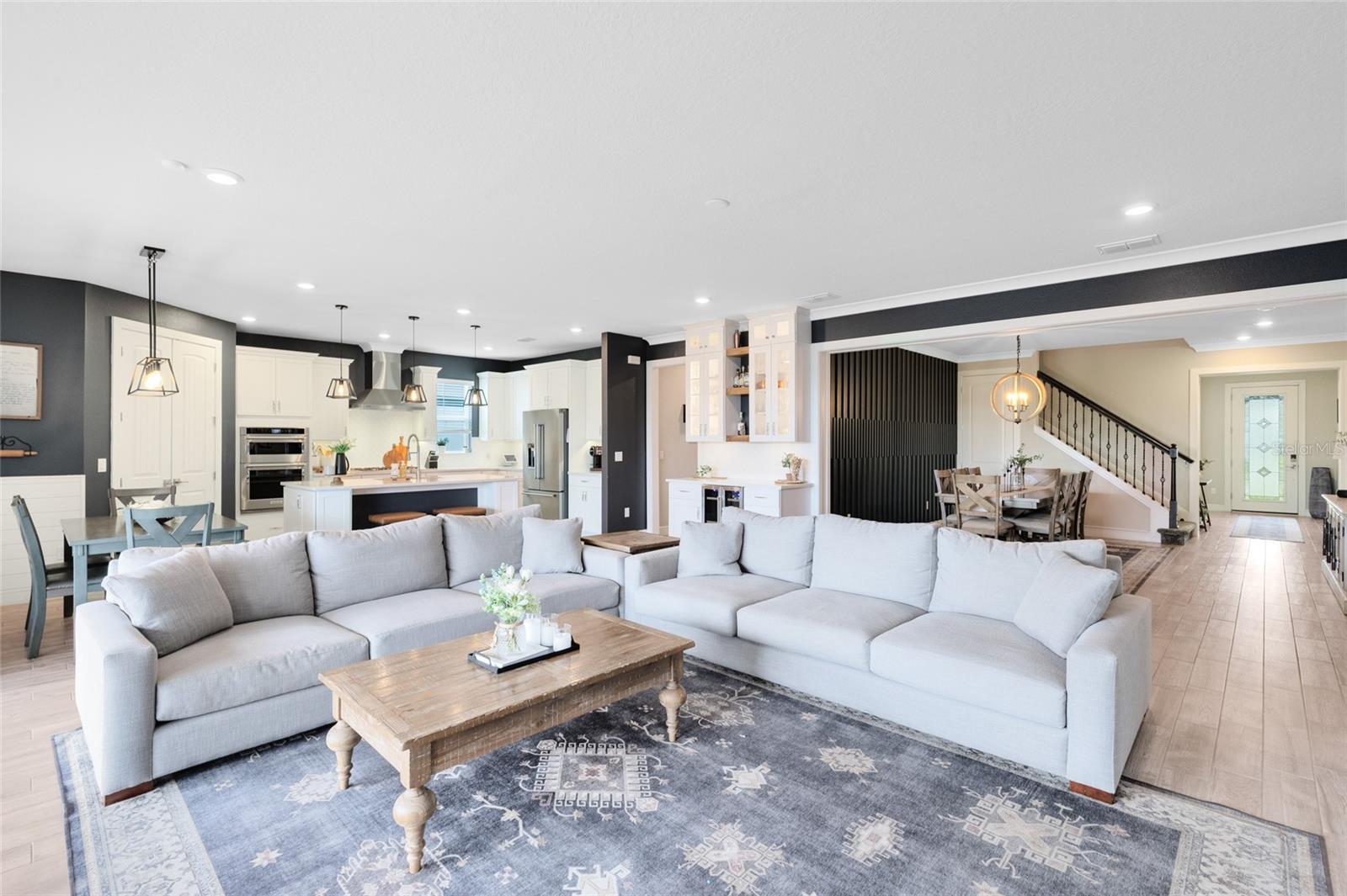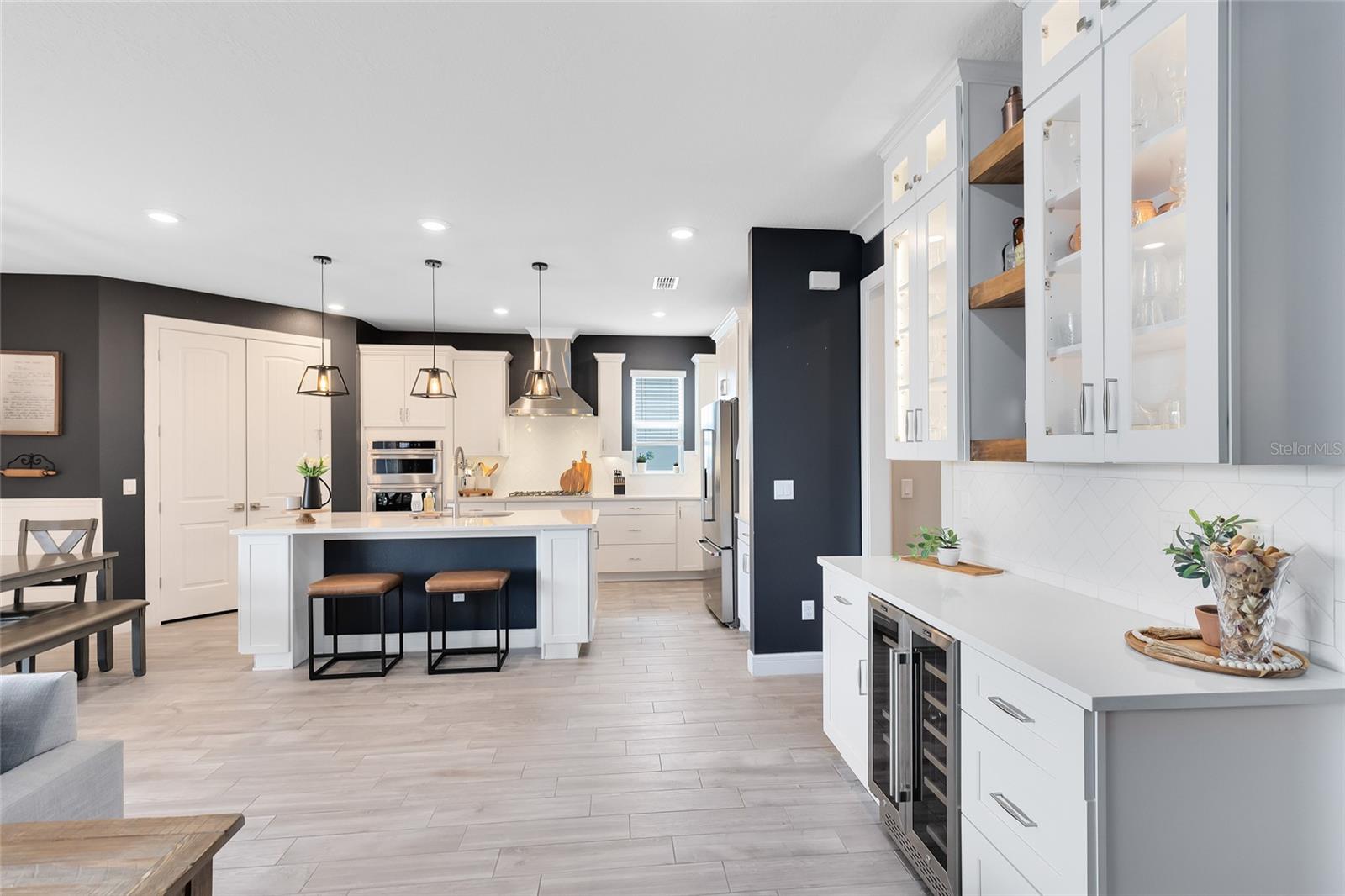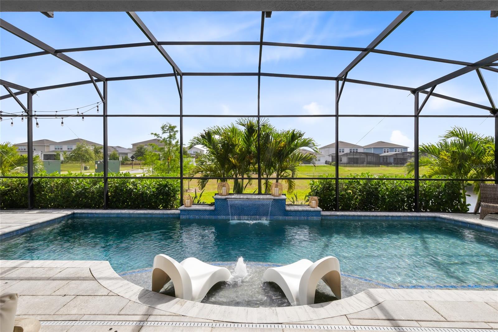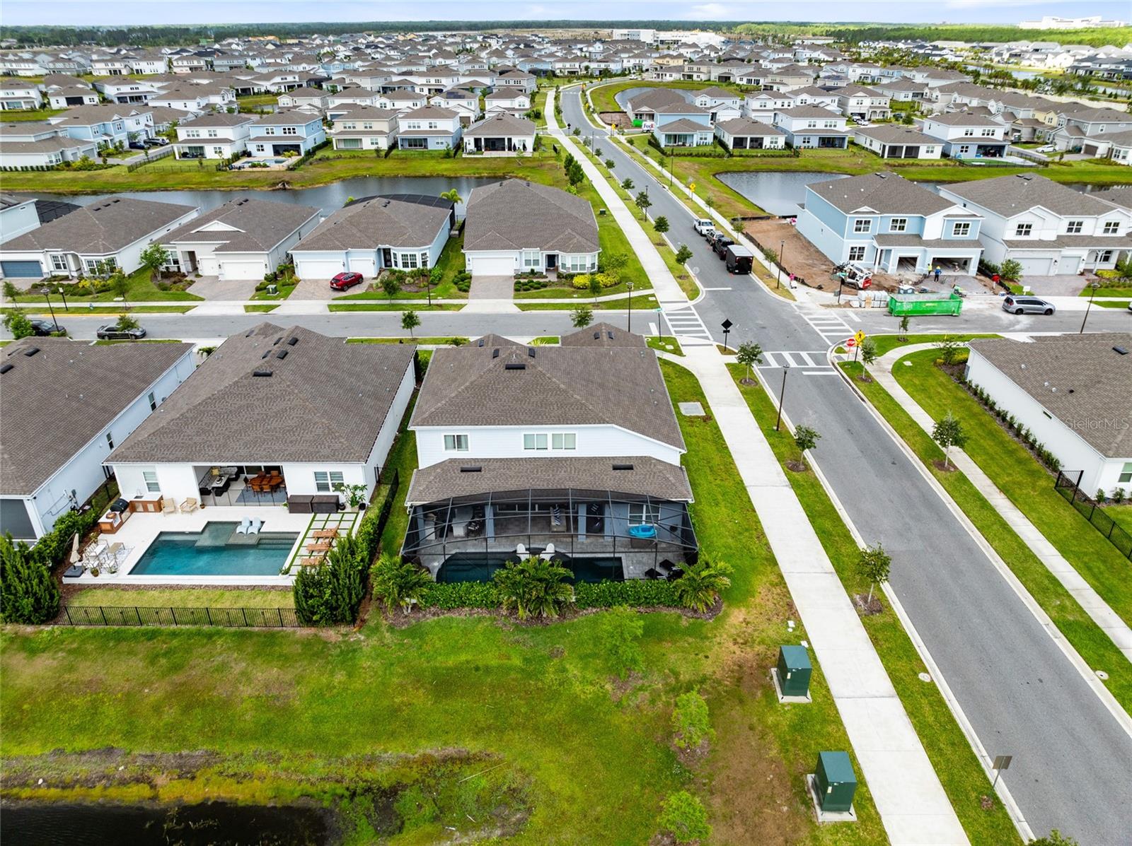 Step into luxury with this extensively upgraded 5-bedroom Easley model with water views, offering over 4,100 sq ft of curated living space on a beautifully landscaped corner lot in the Isles of Lake Nona. Thoughtfully designed for both everyday living and entertaining, this home blends custom craftsmanship with resort-style amenities. From the moment you enter, you're welcomed by crown molding, cased openings, wood-look tile floors, and a bright, open floor plan. The dedicated dining room stuns with a bold accent wall and modern light fixture—perfect for hosting gatherings in style. Just beyond, the gourmet kitchen is equally impressive with granite countertops, a massive island, Viking and KitchenAid appliances, a double oven, under-cabinet lighting, and a custom walk-in pantry with built-ins and wine storage. A sleek dry bar with wine fridge elevates the entertaining experience. The family room features a built-in electric fireplace, floating wood shelves, and expansive 16’ pocket sliders that fully open to a private screened lanai. Outside, enjoy a sparkling pool with sun shelf and waterfall features, a full outdoor kitchen with grill, sink, and burner, and a bar with built-in Bluetooth speakers—all surrounded by lush, upgraded landscaping. The first-floor primary suite offers a peaceful retreat with a tray ceiling, accent wall, and spa-like bathroom with dual vanities, large walk-in shower, and a fully customized closet. Upstairs includes a large loft with an 85” TV (included), custom closets in every room, and a versatile bonus room currently used as a home gym. Additional highlights include a dedicated office with floor-to-ceiling built-ins, a 3-car tandem garage, tankless water heater, and zoned A/C. Enjoy the gated Isles of Lake Nona lifestyle with access to a resort-style pool, clubhouse, fitness center, tennis courts, playgrounds, and walking trails—all minutes from top-rated schools. Ideally located near Lake Nona’s Medical City, premier dining, shopping, and major highways. Less than 20 minutes to MCO Airport and the new USTA training center, and just a short drive to top theme parks and beaches. This isn’t just a home—it’s a lifestyle of comfort, style, and sophistication. Experience luxury living redefined. Schedule your private tour today!