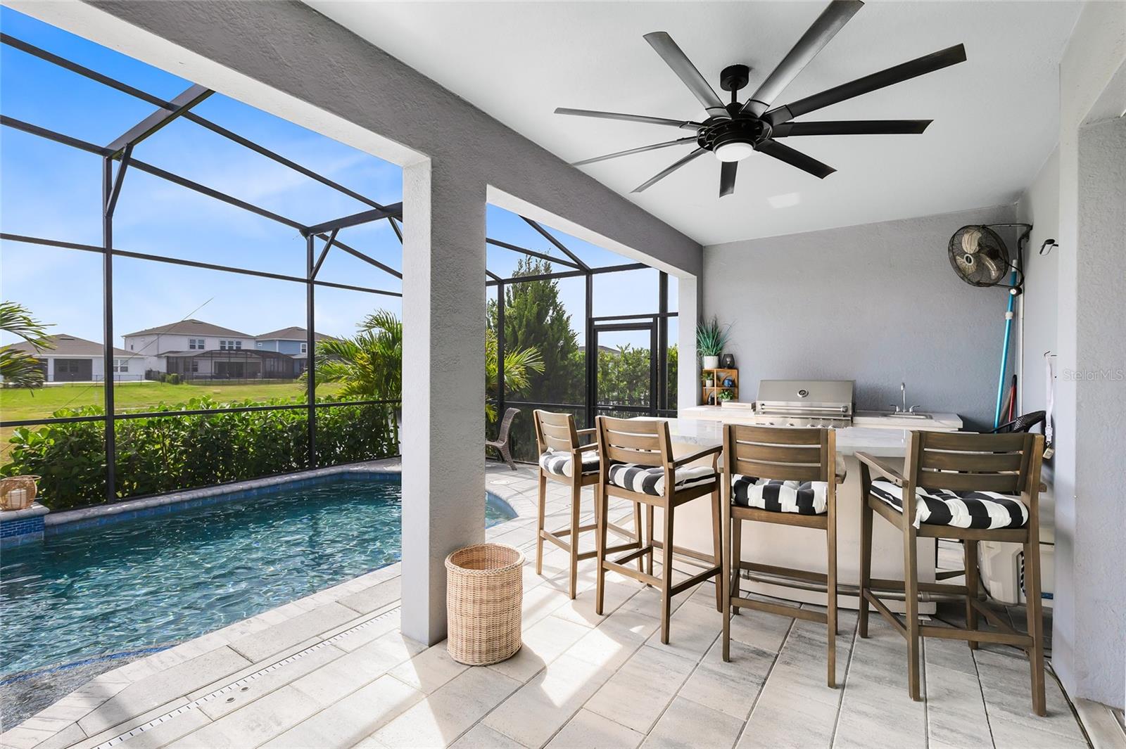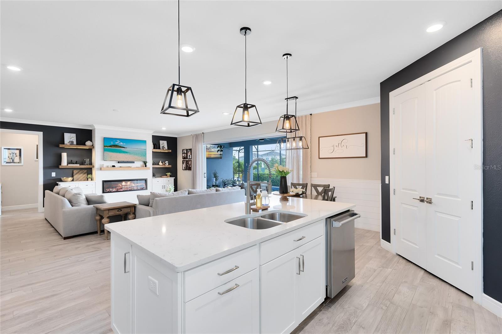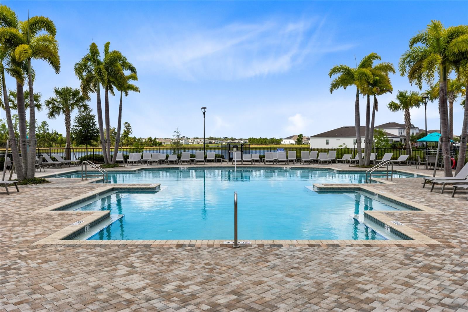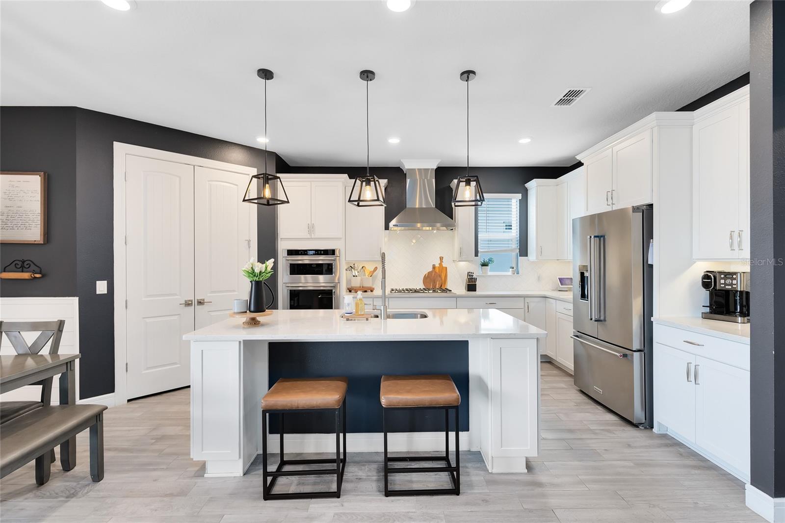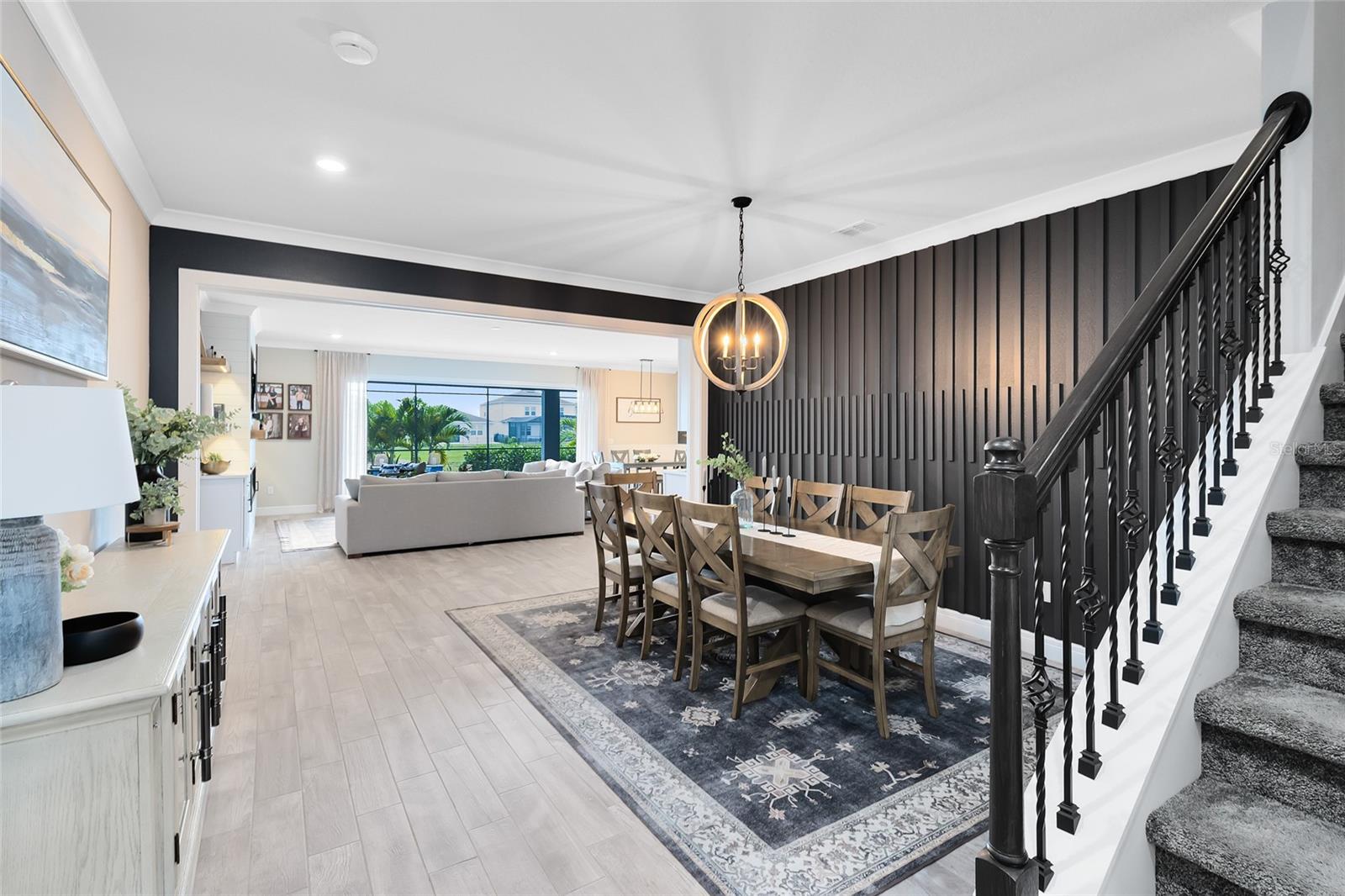 Step into luxury with this extensively upgraded 5-bedroom Easley model with water views, offering over 4,100 sq ft of curated living space on a beautifully landscaped corner lot in the Isles of Lake Nona. Thoughtfully designed for both everyday living and entertaining, this home blends custom craftsmanship with resort-style amenities. From the moment you enter, you're welcomed by crown molding, cased openings, wood-look tile floors, and a bright, open floor plan. The dedicated dining room stuns with a bold accent wall and modern light fixture—perfect for hosting gatherings in style. Just beyond, the gourmet kitchen is equally impressive with granite countertops, a massive island, Viking and KitchenAid appliances, a double oven, under-cabinet lighting, and a custom walk-in pantry with built-ins and wine storage. A sleek dry bar with wine fridge elevates the entertaining experience. The family room features a built-in electric fireplace, floating wood shelves, and expansive 16’ pocket sliders that fully open to a private screened lanai. Outside, enjoy a sparkling pool with sun shelf and waterfall features, a full outdoor kitchen with grill, sink, and burner, and a bar with built-in Bluetooth speakers—all surrounded by lush, upgraded landscaping. The first-floor primary suite offers a peaceful retreat with a tray ceiling, accent wall, and spa-like bathroom with dual vanities, large walk-in shower, and a fully customized closet. Upstairs includes a large loft with an 85” TV (included), custom closets in every room, and a versatile bonus room currently used as a home gym. Additional highlights include a dedicated office with floor-to-ceiling built-ins, a 3-car tandem garage, tankless water heater, and zoned A/C. Enjoy the gated Isles of Lake Nona lifestyle with access to a resort-style pool, clubhouse, fitness center, tennis courts, playgrounds, and walking trails—all minutes from top-rated schools. Ideally located near Lake Nona’s Medical City, premier dining, shopping, and major highways. Less than 20 minutes to MCO Airport and the new USTA training center, and just a short drive to top theme parks and beaches. This isn’t just a home—it’s a lifestyle of comfort, style, and sophistication. Experience luxury living redefined. Schedule your private tour today!