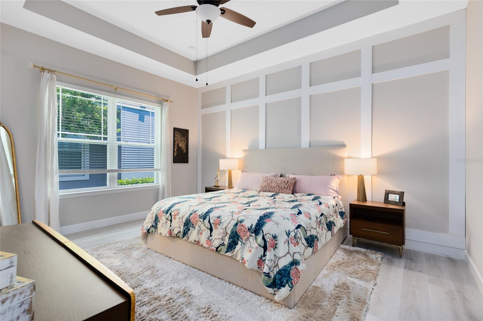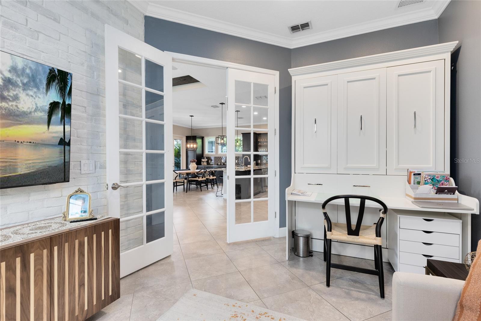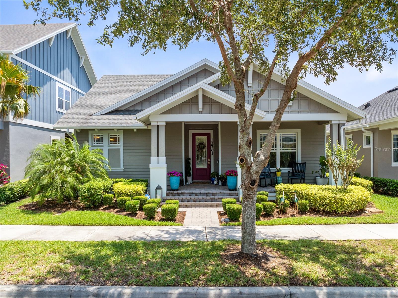 This upgraded one-story Craftsman-style home in the heart of Lake Nona’s Laureate Park offers standout curb appeal with a welcoming front porch and lush landscaping. Inside, you’ll find 3 bedrooms, 2 bathrooms, PLUS a dedicated OFFICE behind French doors. The open layout is anchored by a stunning living room with a custom wood-accent wall, tray ceiling with exposed beams, crown molding, and integrated Bluetooth ceiling speakers. Plantation shutters line the windows, flooding the space with natural light and warmth—perfect for relaxing or entertaining. The chef’s kitchen is both stylish and functional—featuring espresso cabinetry, granite countertops, glass subway tile, stainless steel appliances, a built-in oven, and an electric cooktop. A large island with seating and a built-in dry bar with glass-front cabinets make entertaining effortless. The adjacent dining area offers seamless flow to the screened lanai through French doors. The primary suite is a peaceful retreat with an accent wall, tray ceiling, and a spa-like bath featuring dual vanities, a makeup station, and a walk-in shower with double showerheads. The custom walk-in closet offers smart storage with built-in shelving and drawers. Need a flex space? The home office features a whitewashed brick accent wall, built-in desk, and plenty of natural light—perfect for work or relaxation. Step outside to your private backyard escape. The screened lanai boasts a full summer kitchen with granite counters, stainless steel grill, sink, and TV setup. Just beyond, the extended paver patio and firepit seating area are ideal for entertaining or unwinding in the evenings. Laureate Park isn’t just a neighborhood—it’s a lifestyle. Dive into resort-style living with access to the Aquatic Center, LP Fit gym, scenic parks, and over 44 miles of trails. Ideally located in Lake Nona, you're just minutes from Medical City, the VA Hospital, Nemours, top dining, shopping, and the Lake Nona Town Center. Enjoy quick access to major highways, Orlando International Airport, the USTA National Campus, and world-renowned theme parks and beaches. This home offers the perfect blend of luxury, space, and community. Come experience elevated living—schedule your private tour today!