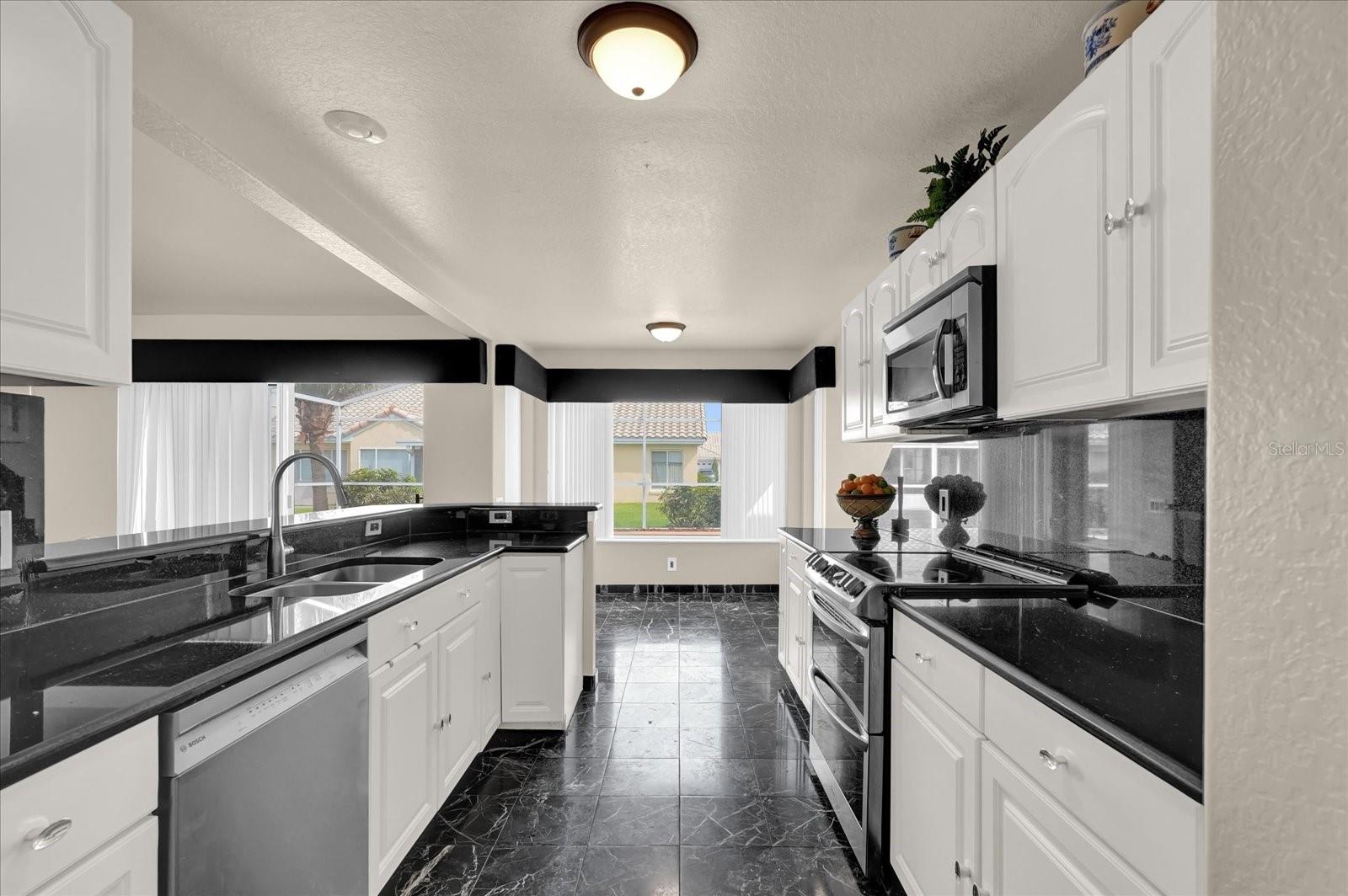 GOLF COMMUNITY - Discover the perfect blend of luxury and comfort in this stunning 3-bedroom, 2-bath pool home with spa, in the sought-after, manned guard-gated VENTURA COUNTRY CLUB. This beautifully maintained residence features an open-concept floor plan with soaring vaulted ceilings, marble floors in the main areas, new carpet in all bedrooms and freshly painted interior and exterior. The large formal living room, with French doors, offers flexible space that could be converted into a 4th bedroom or a private home office. The formal dining room has tray ceilings and is open to the family room. The kitchen is outfitted with stainless steel appliances, granite countertops, Breakfast bar, closet pantry and breakfast nook with views of the pool and spa. The kitchen overlooks the family room which has a cozy wood burning fireplace. The home also features an inside laundry room. This split bedroom floor plan offers a spacious primary bedroom with vaulted ceilings, an En-suite bath including a dual vanity, soaking tub, separate shower with a Jolie shower head and a oversized walk-in closet. This home is located in a lush golf course community with a newly renovated 18-hole golf course, and offers access to an Olympic-sized pool, a fitness center, clubhouse with full-service restaurant/bar, banquet facilities, and a wide range of sports amenities, including lighted tennis and pickleball courts, basketball courts, and scenic walking, biking and jogging paths. Families will love the playground and lakefront park with tranquil views. All of this, just minutes from downtown Orlando, Orlando International Airport, and easy access to shopping, dining, local attractions and major highways. This is Resort-Style Florida living at its finest—schedule your private tour today!