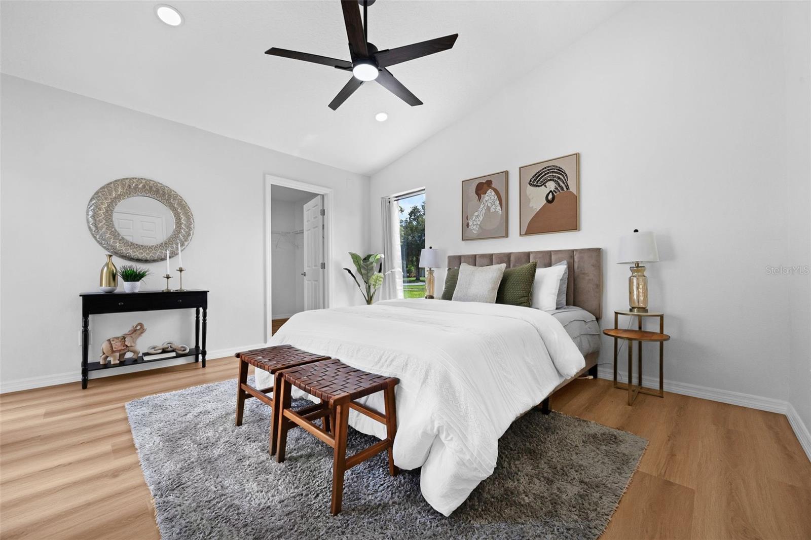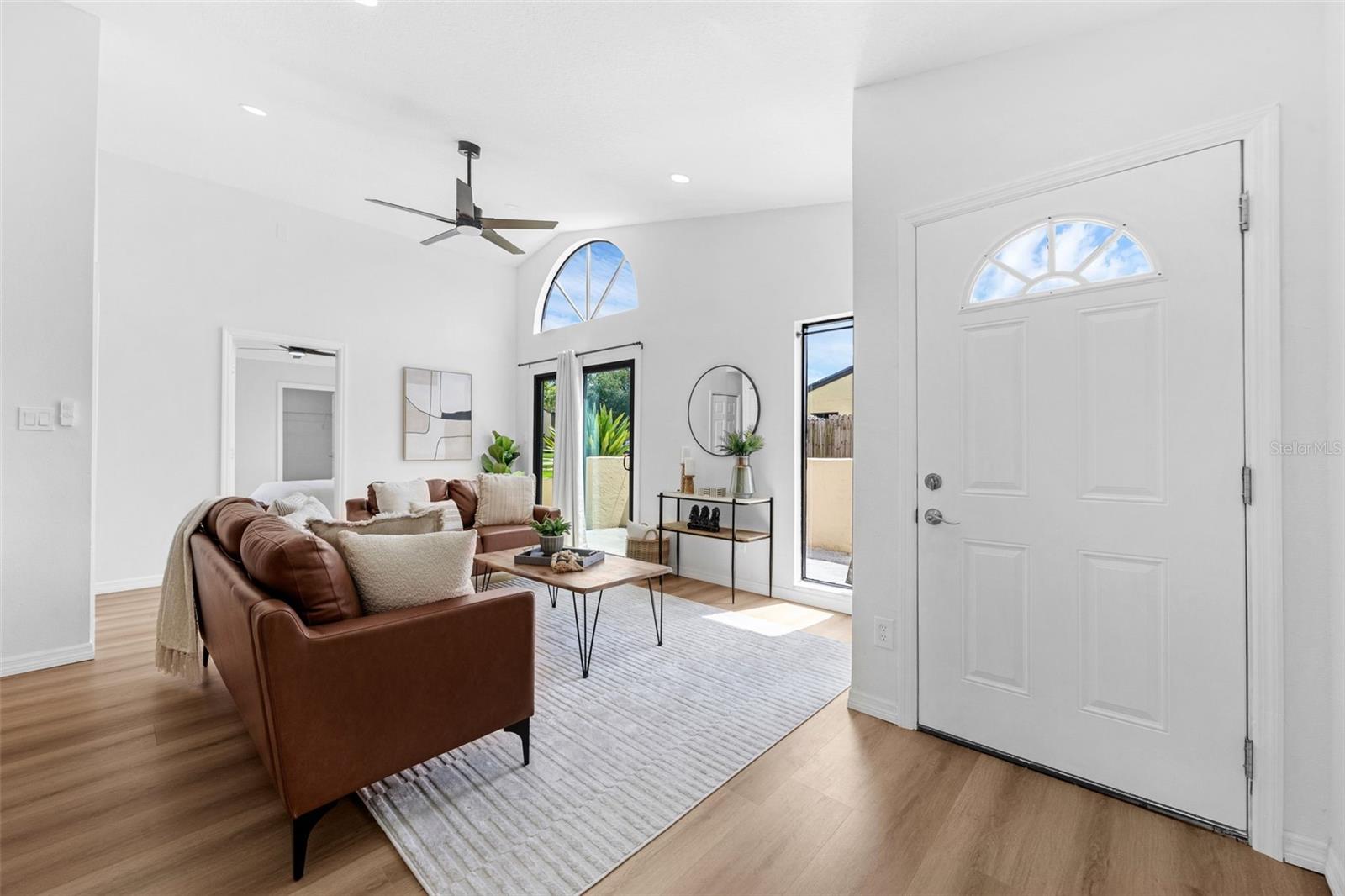 Welcome to this beautiful Completely Renovated 3 bedroom 2 bathroom property featuring a BONUS FLEX ROOM with a Skylight a NEW Roof 2021, AC 2017, Brand-New Flooring & Large pane sliding doors and wall to wall windows throughout the property that give this home a bright and airy feel allowing the natural light to flow all around! 739 Golden Sunshine Circle is move in ready and has been renovated from the ground up, showcasing 14-foot ceilings, and all-new luxury vinyl laminate flooring. Four sets of sliding doors and a skylight in one bedroom add even more brightness and an airy feel. Inside, you’ll find recessed lighting throughout and energy-efficient ceiling fans in every room. The primary suite delights with its own courtyard access and a spacious walk-in closet, while a guest room opens directly to the fenced backyard. The designer kitchen features quartz countertops, soft-close glass-front cabinets with under-cabinet lighting, and new stainless steel appliances, along with sliding doors to a private courtyard. Both bathrooms are fully updated and include sleek LED-lit mirrors. Outdoors, enjoy a large fenced backyard with an open covered porch and a big driveway in the front with ample parking. Situated in the heart of Orlando, this home offers quick access to SR-408, I-4, and SR-417, and is close to Engelwood Elementary, Stonewall Jackson Middle, and Colonial High, making commuting and schooling convenient.