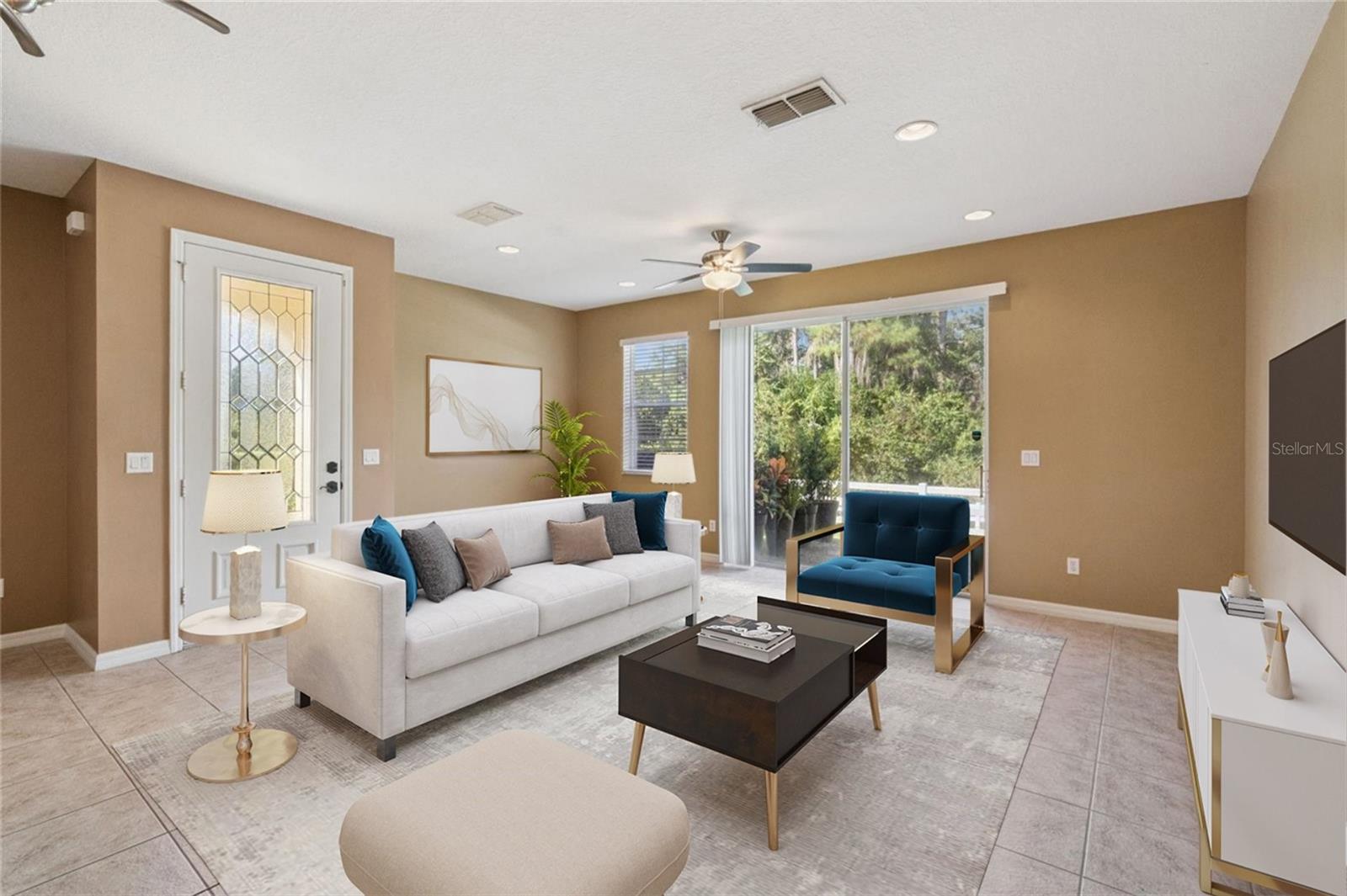 This spacious, private, end-unit townhome features recent upgrades including new carpet and fresh paint and new AC in 2024. The downstairs boasts an open floor plan, an upgraded kitchen with granite countertops and stainless steel appliances, a convenient half bath, and an oversized garage. Enjoy serene moments on the private patio with a picturesque lake view. Upstairs, you'll find a built-in computer alcove, a dedicated laundry area, and three bedrooms. The master suite offers a private bath with a soaking tub and a separate shower. Two additional guest rooms share a second full bath. The location is ideal, offering easy access to all the major attractions, exceptional restaurants, and world-class shopping. Please let me know if you have any questions or would like to schedule a viewing. One or more photos are Virtual Staged.