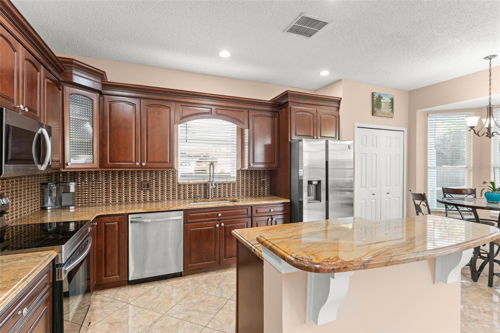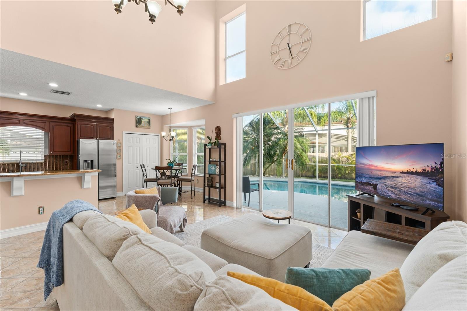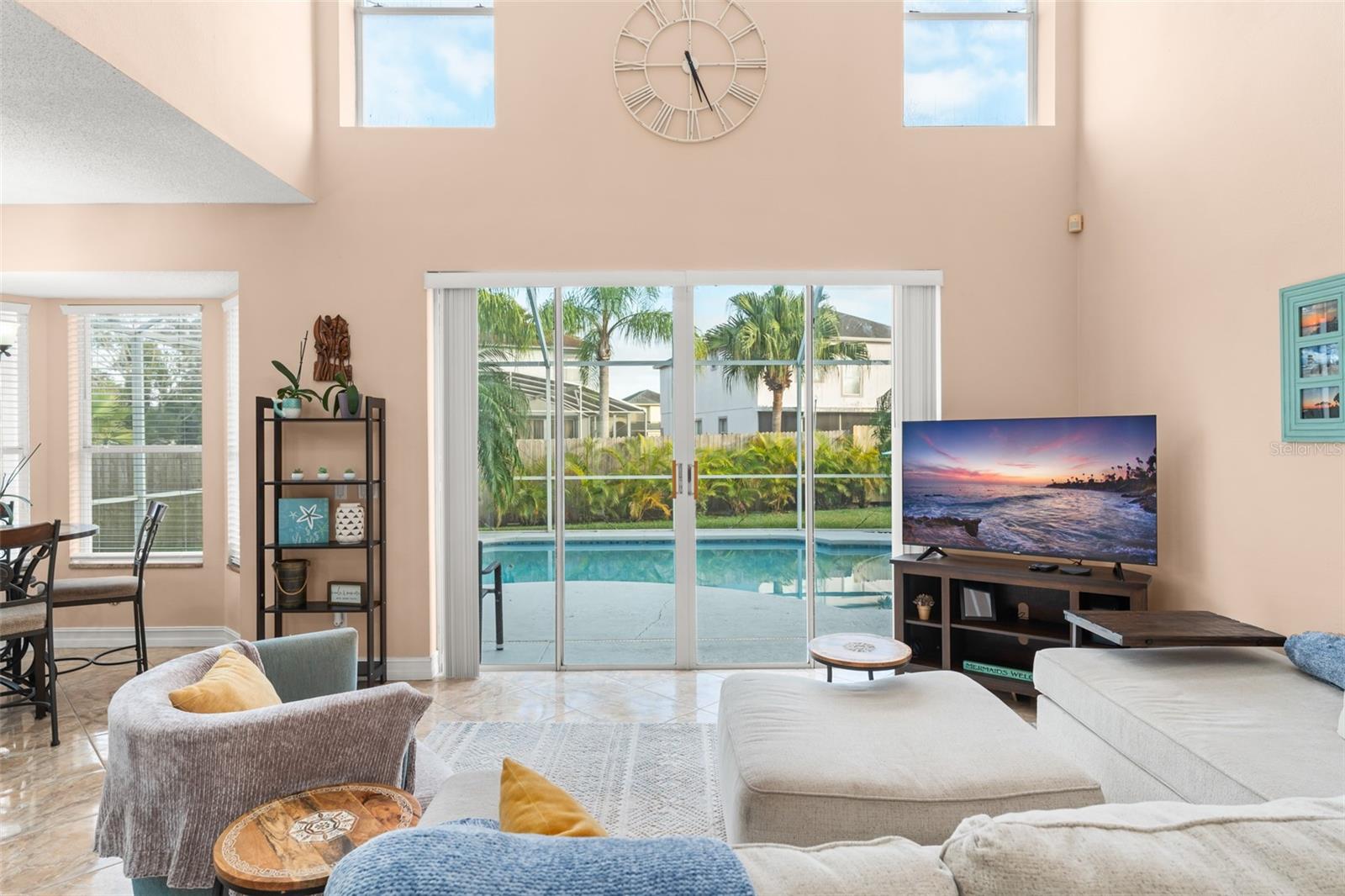 Welcome to one of the most unique and sought-after floor plans in the Eastwood community. This beautiful pool home offers 4 bedrooms and 4 full bathrooms, 3 of the bedrooms feature their own private en suite bathrooms for exceptional comfort and privacy. From the moment you step inside, you’re greeted by soaring ceilings, abundant natural light, and stunning views of the resurfaced pool, swaying palm trees and fully fenced, manicured backyard. The main floor features a spacious living room and formal dining room, flowing seamlessly into the open-concept kitchen and family room. A first-floor bedroom with a closet and a full bathroom next door makes the perfect guest room or home office. The family room overlooks the screened patio, with views of the newly remodeled pool, complete with a shallow sun shelf ideal for year-round relaxation. The kitchen offers a beautiful island, a window over the sink, and new stainless steel appliances. The laundry room is conveniently located off the garage entrance and includes plumbing for a utility sink. Upstairs, escape to the oversized Primary Suite, featuring dual walk-in closets and a stunning, spa-like en suite bathroom. Two additional oversized bedrooms, each with its own private bathroom, provide comfortable accommodations for family or guests. Recent major updates include: Newer roof, new HVAC, gas water heater, pool resurfacing/remodel, privacy fencing, stainless steel appliances and new energy efficient windows upstairs. Residents of Eastwood enjoy biking trails, a community pool, and the convenience of a neighborhood elementary school. All of this comes in a prime location— The HOA fee includes Xfinity internet and cable, located just minutes from downtown Orlando, Lake Nona/Medical City, Orlando International Airport, UCF, Valencia College, Lockheed Martin, and the endless shopping and dining at Waterford Lakes Town Center. This move-in-ready home offers everything you’re looking for: spacious living, stylish upgrades, and a private backyard retreat—all in a highly desirable community close to top-rated schools, shopping, and dining.”