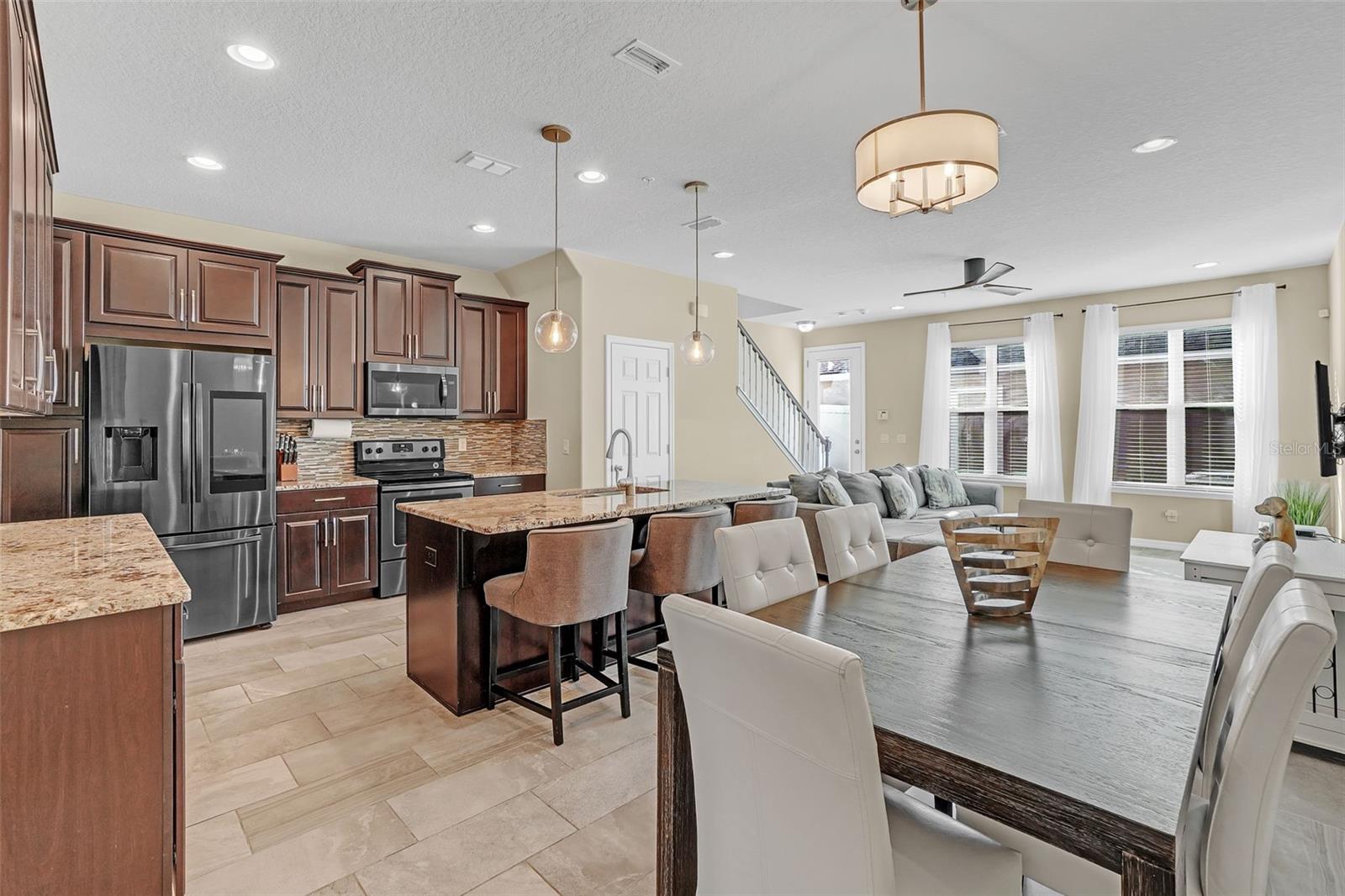 One or more photo(s) has been virtually staged. Welcome home to 8626 Vedder Ln, a beautifully maintained two-story townhouse located in the highly desirable Randal Park community in the heart of Lake Nona. This 3-bedroom, 2.5-bath residence offers an open, light-filled floor plan, keyless door entry (2024), and serene conservation views with no rear neighbors, creating a quiet and private retreat. Upon entering, you are welcomed by a spacious formal dining area, currently used as a home office, highlighted by an elegant chandelier (2018). Just off the entry is a convenient half bath. The home flows seamlessly into the heart of the property—the kitchen, which is bathed in natural light and enhanced by stylish pendant lighting (2018) above the island. The kitchen features ample cabinetry, a large closet pantry, granite countertops, tile backsplash, stainless steel appliances, a breakfast bar, and a cozy dinette area, making it ideal for both everyday living and entertaining. Toward the rear of the home, the inviting living room provides a relaxing space and is complemented by a ceiling fan (2018). Upstairs, you’ll find mostly carpeted flooring, two additional bedrooms, each equipped with ceiling fans (2017), and a full bathroom. The primary suite serves as a peaceful retreat, featuring tray ceilings, plush carpet, and an en suite bathroom with ceramic tile flooring, dual sinks with granite countertops, a garden tub, and a separate shower stall. Comfort is enhanced throughout the home with a Nest thermostat (2016). Step outside through the back door onto your paver-stone covered patio/breezeway, an ideal space for enjoying Florida evenings or hosting weekend gatherings. The detached garage offers easy access and added convenience. Residents of Randal Park enjoy a vibrant community with planned activities throughout the year, great schools, and unbeatable proximity to SR 417, SR 528, Orlando International Airport, hospitals, shopping, and dining. Community amenities include a resort-style swimming pool, fitness center, playgrounds, scenic nature trails with relaxing water views, and numerous green spaces. With its open floor plan, abundant natural light, thoughtful upgrades, and tranquil conservation setting, this home offers the perfect blend of comfort, convenience, and Lake Nona lifestyle living. Home is zoned for Innovation High School.