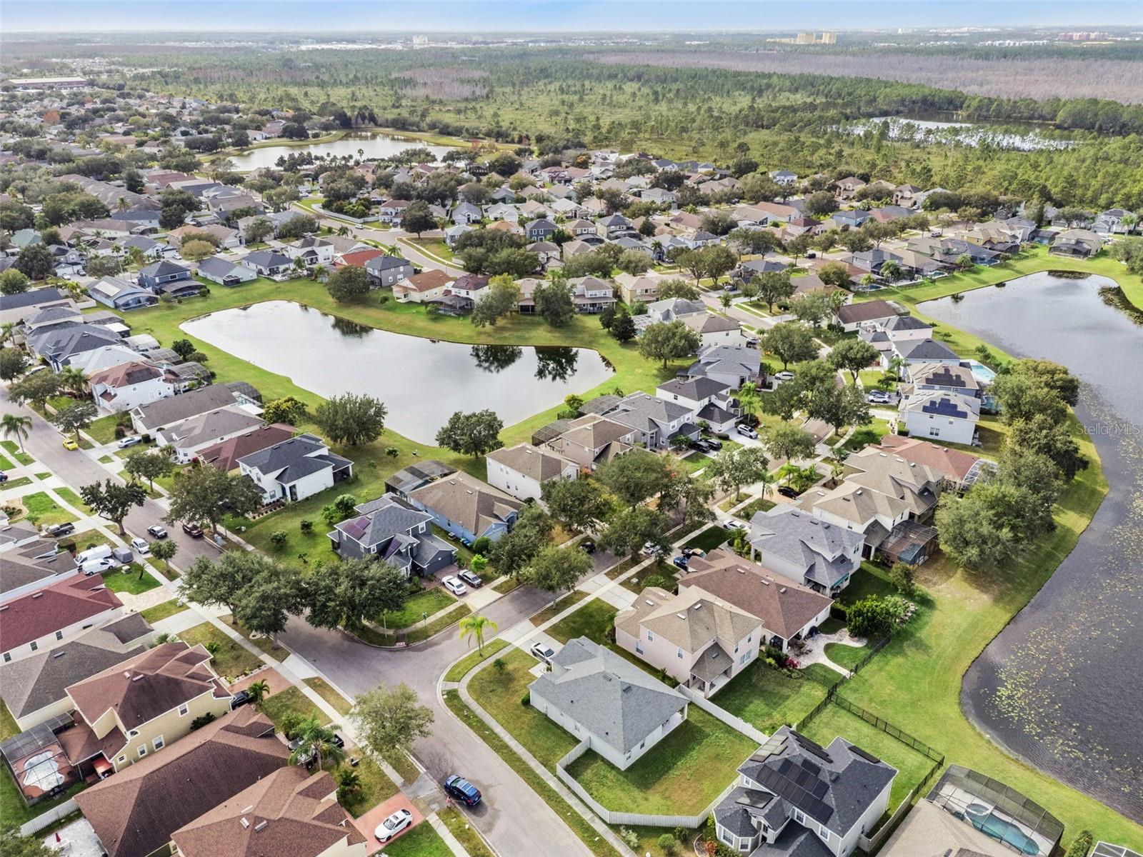 Located in the Palma Vista community at Hunters Creek, this beautifully maintained, move-in-ready home sits on a premier pond-front lot with serene water views and outstanding curb appeal. This two-story single-family residence is nestled within the highly desired Hunters Creek community and has been lovingly cared for, showcasing a spacious and open floor plan designed for modern living. The well-maintained yard features attractive landscaping, a fenced backyard, an irrigation system, and a covered lanai that overlooks the tranquil pond—perfect for relaxing or entertaining. Upon entering, you are welcomed by a formal living room and formal dining room combination at the front of the home, while the great room is positioned at the rear with sliding glass doors and large windows that frame the peaceful pond view. The updated kitchen features granite countertops, a tiled backsplash, breakfast bar, stainless steel appliances, closet pantry, and a dinette area with views of the patio and pond. Laminate flooring runs throughout the main floor for easy maintenance, and the home is light and bright with high ceilings, recessed lighting, and abundant natural light. The main floor includes one bedroom, ideal for guests or a home office. A beautiful new wrought iron stair railing highlights the U-shaped staircase with landing, leading upstairs to a loft that overlooks the main floor. The second floor offers a spacious primary suite with tray ceiling, walk-in closet, and a large en-suite bathroom featuring dual sinks, granite countertops, a garden tub, and a separate shower stall. Three additional bedrooms and the loft space complete the upper level, making this a generous five-bedroom home with flexible living areas. Additional features include a brand-new roof being installed by the seller, two AC units installed in 2021, a hot water heater approximately two years old, ceiling fans throughout, epoxy-coated garage floor, garage door opener, laundry room on the main floor and all appliances conveying—including the washer and dryer. This home is centrally located near shopping, dining, and major access roads and is zoned for top-rated schools. Hunters Creek is a sought-after community, offering three parks, dog parks, tennis, basketball and soccer sports fields, all with a low HOA and no CDD. This is a gorgeous, well-cared-for home on a premium lot—ready for its next owner to enjoy.