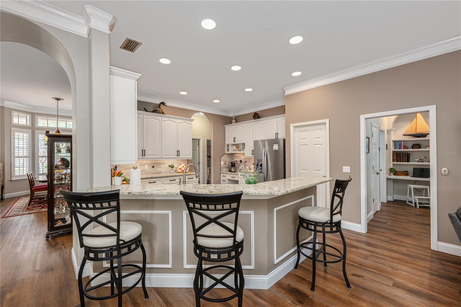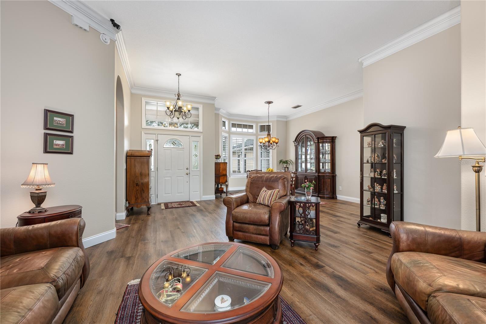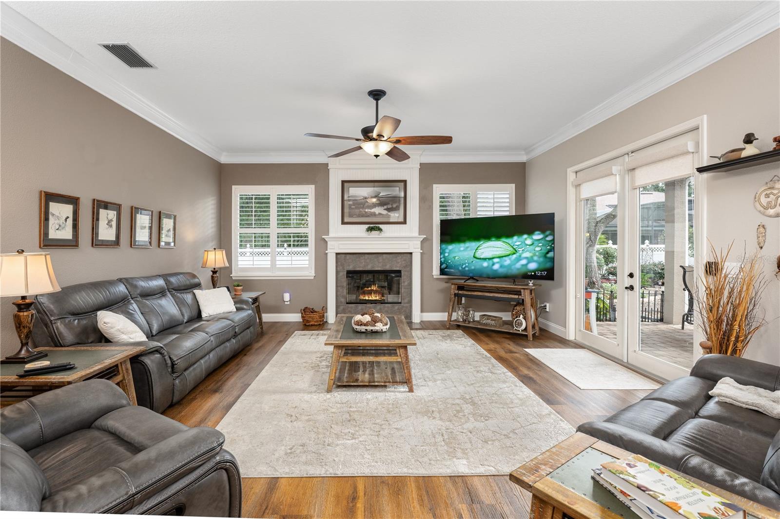 Welcome to 4437 Little Water Street, an impeccably maintained 5-bedroom, 4- bathroom custom-built home with a 3-car garage, featuring a desirable split and open floor plan situated on an oversized 0.37-acre lot, ideal for both everyday living and entertaining—with ample room to add a pool if desired. From the moment you step inside, you’ll notice the timeless finishes carried throughout the entire home, including 9-foot ceilings, crown molding, luxury vinyl flooring, and plantation shutters, creating a cohesive, elegant feel in every room. Step into the home and you are greeted by a bright formal living and dining area, setting an inviting first impression. Immediately to the right, the primary suite is thoughtfully separated from the rest of the home, ensuring true peace and quiet. This private retreat features direct access to the backyard through French doors, a walk- in closet, and a serene atmosphere perfect for unwinding after a long day. Continue into the heart of the home where the open layout is filled with abundant natural light. The spacious eat-in kitchen flows seamlessly into the main living and den area and is equipped with a gas stove, generous counter space, a walk-in pantry, and plenty of room to gather. A wood-burning fireplace adds warmth and character, making this space ideal for both relaxing and entertaining. French doors from the kitchen/den area and the main living room provide effortless access to the patio, enhancing indoor-outdoor living. Designed with today’s lifestyle in mind, the home includes a dedicated home office spacious enough for two people to work comfortably, as well as a separate home gym, providing the perfect balance of productivity and wellness without ever leaving home. A separate in-law suite, complete with its own workspace, full bathroom, and walk-in closet, offers exceptional flexibility for multi-generational living, guests, or extended stays. Step outside to your private backyard oasis, beautifully landscaped with gorgeous, mature plants that create a tranquil, garden-like setting. The yard is fully fenced for privacy, and the spacious patio is accessible through **three separate sets of French doors—from the primary bedroom, living room, and kitchen/den area—**making it ideal for entertaining or everyday enjoyment. With eastern exposure, the patio is protected from the hot afternoon Florida sun, allowing for comfortable outdoor living throughout the day. The generous lot size offers plenty of room for a future pool while still maintaining green space. A long driveway and side-entry garage further enhance curb appeal and functionality. In addition to abundant living space, the home offers substantial attic storage with plywood flooring, providing excellent storage and organization options rarely found. The home was completely re-plumbed in 2013. Additional recent mechanical updates include a brand-new roof (2025), brand-new AC with 3-zone climate control