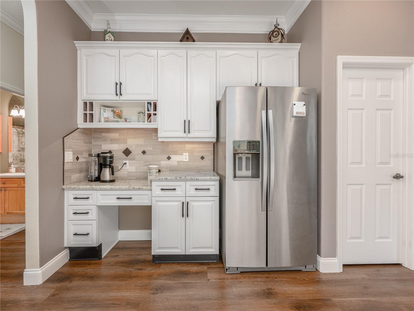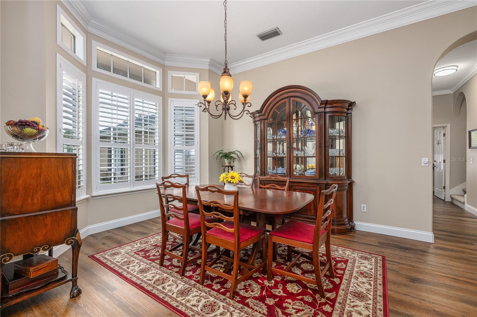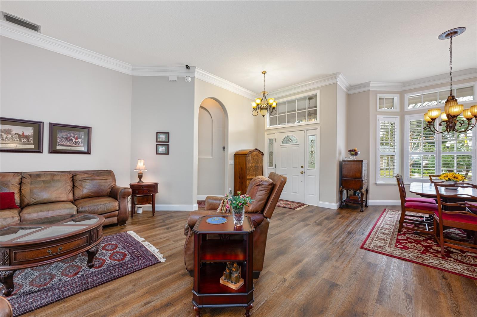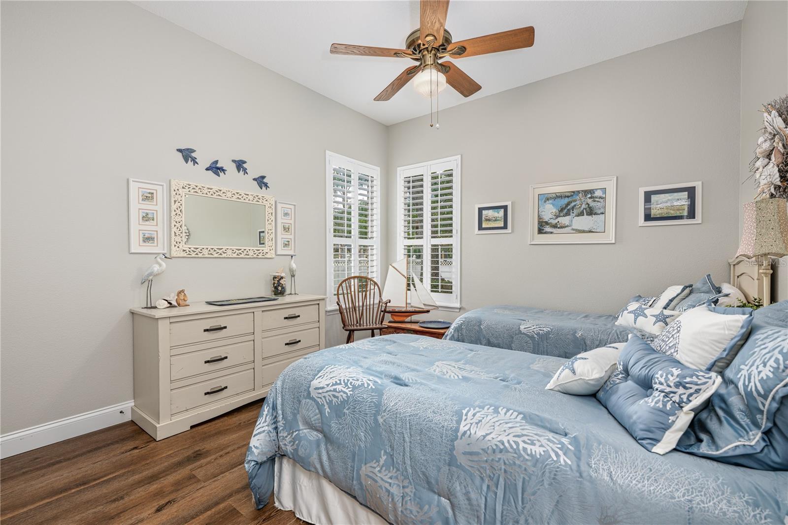 Welcome to 4437 Little Water Street, an impeccably maintained 5-bedroom, 4- bathroom custom-built home with a 3-car garage, featuring a desirable split and open floor plan situated on an oversized 0.37-acre lot, ideal for both everyday living and entertaining—with ample room to add a pool if desired. From the moment you step inside, you’ll notice the timeless finishes carried throughout the entire home, including 9-foot ceilings, crown molding, luxury vinyl flooring, and plantation shutters, creating a cohesive, elegant feel in every room. Step into the home and you are greeted by a bright formal living and dining area, setting an inviting first impression. Immediately to the right, the primary suite is thoughtfully separated from the rest of the home, ensuring true peace and quiet. This private retreat features direct access to the backyard through French doors, a walk- in closet, and a serene atmosphere perfect for unwinding after a long day. Continue into the heart of the home where the open layout is filled with abundant natural light. The spacious eat-in kitchen flows seamlessly into the main living and den area and is equipped with a gas stove, generous counter space, a walk-in pantry, and plenty of room to gather. A wood-burning fireplace adds warmth and character, making this space ideal for both relaxing and entertaining. French doors from the kitchen/den area and the main living room provide effortless access to the patio, enhancing indoor-outdoor living. Designed with today’s lifestyle in mind, the home includes a dedicated home office spacious enough for two people to work comfortably, as well as a separate home gym, providing the perfect balance of productivity and wellness without ever leaving home. A separate in-law suite, complete with its own workspace, full bathroom, and walk-in closet, offers exceptional flexibility for multi-generational living, guests, or extended stays. Step outside to your private backyard oasis, beautifully landscaped with gorgeous, mature plants that create a tranquil, garden-like setting. The yard is fully fenced for privacy, and the spacious patio is accessible through **three separate sets of French doors—from the primary bedroom, living room, and kitchen/den area—**making it ideal for entertaining or everyday enjoyment. With eastern exposure, the patio is protected from the hot afternoon Florida sun, allowing for comfortable outdoor living throughout the day. The generous lot size offers plenty of room for a future pool while still maintaining green space. A long driveway and side-entry garage further enhance curb appeal and functionality. In addition to abundant living space, the home offers substantial attic storage with plywood flooring, providing excellent storage and organization options rarely found. The home was completely re-plumbed in 2013. Additional recent mechanical updates include a brand-new roof (2025), brand-new AC with 3-zone climate control