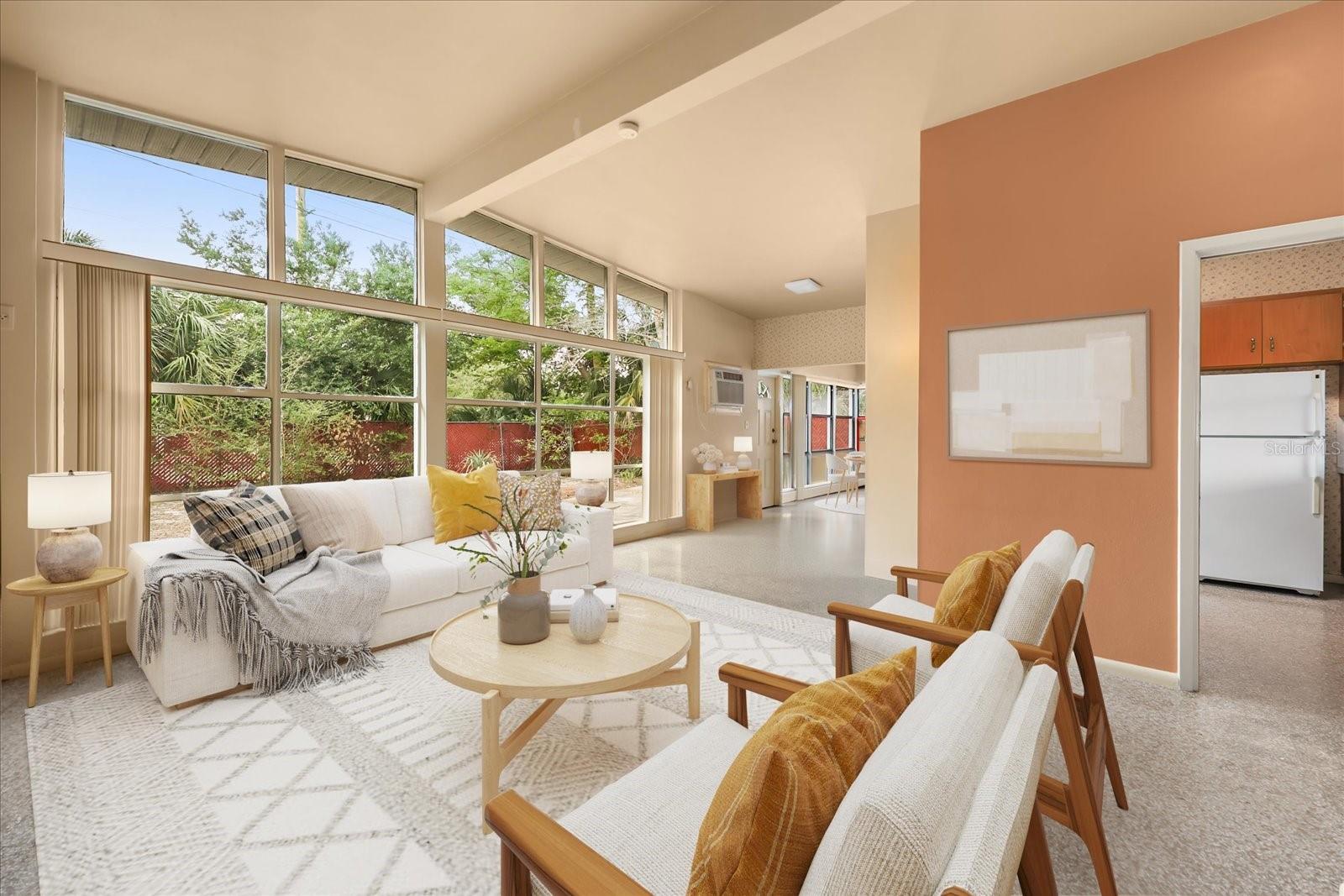 One or more photo(s) has been virtually staged. Mid-Century Modern enthusiasts—this one is for you! Welcome to 3506 Pelican Lane, showcasing the signature elements of true mid-century design: floor-to-ceiling windows that flood the home with natural light, a seamless open floor plan, and original terrazzo flooring that flows throughout. Whether you choose to enhance its vintage charm or thoughtfully modernize, the possibilities here are endless. Lovingly owned since the 1950s, this 3-bedroom, 2-bath home is now ready for its next chapter. As you step inside, you’re immediately welcomed into a bright, open space that blends the living, dining, and family rooms—true to mid-century modern design. Just off to the right, the kitchen remains in its original layout, offering a nod to the home’s architectural roots. Expansive windows line the space allowing natural light to pour in , complemented by the terrazzo flooring that runs seamlessly throughout the entire home. To the left, you’ll find all three bedrooms grouped together, along with the home’s bathrooms—providing a functional layout that offers both privacy and convenience. From the main living area, you’ll enjoy direct access to the outdoor space—perfectly sized to be low maintenance but with just enough room to create your own garden, entertain, or design a private retreat that fits your lifestyle. Located in the highly sought-after Audubon Park, you’ll be in the heart of Orlando’s most vibrant and beloved communities. Just minutes from Baldwin Park and Winter Park, enjoy easy access to boutique shopping, local dining, scenic parks, and lakeside living. Spend your weekends exploring the Audubon Park Garden District, known for its charming mix of locally owned shops, farm-to-table restaurants, craft breweries, and community events that make this neighborhood truly special. If you’ve been waiting for an authentic mid-century home in a prime location at a pricepoint that is within reach—this is your opportunity. Schedule your showing today!