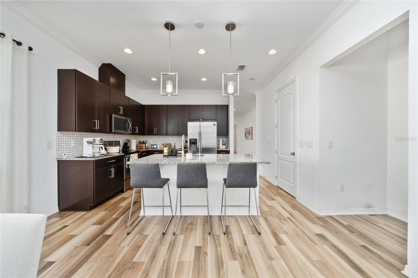 Located within the exclusive, guard-gated community of Eagle Creek, this elegant residence at 10257 Henbury Street offers a refined interpretation of modern living in Lake Nona. Built in 2018 and impeccably cared for, the home spans 2,158 square feet and features four bedrooms and three full bathrooms, thoughtfully arranged to balance privacy, comfort, and style. The exterior immediately makes a statement with its classic brick elevation, tile roof, and beautifully paved driveway, setting a tone of understated sophistication. Upon entry, custom double doors open to a bright and welcoming interior, where wood-look tile flooring extends throughout, enhancing both durability and design continuity. Near the entrance, a versatile guest bedroom filled with natural light offers endless possibilities—perfect as a private suite, executive office, or additional living space. Flowing beyond, the home opens into gracious formal living and dining areas, ideal for hosting or everyday enjoyment. The main living space unfolds into an open kitchen and family room, designed for both entertaining and daily living. The kitchen is elegantly appointed with stainless steel appliances, sleek dark cabinetry, granite countertops, designer tile backsplash, and a generous center island, creating a space that is as functional as it is visually striking. Tucked away for added privacy, the primary suite provides a peaceful escape, complete with a tray ceiling, expansive walk-in closet, and a spa-style bathroom featuring dual vanities, a soaking tub, and a separate walk-in shower. Two additional bedrooms share a well-designed full bath, offering flexibility for family or guests. Outdoors, the fully enclosed backyard and brick-paved patio provide a serene setting for outdoor dining, entertaining, or quiet relaxation. Eagle Creek residents enjoy access to an impressive array of resort-inspired amenities, including a championship golf course, upscale clubhouse with dining, resort-style pool, modern fitness center, tennis and basketball courts, playgrounds, and dog park. The community is zoned for A-Rated schools and is ideally positioned just minutes from Lake Nona Medical City and Orlando International Airport, offering seamless connectivity to world-class healthcare, innovation, and global travel. This turnkey home delivers a rare combination of elegance, lifestyle, and location—an exceptional offering in one of Lake Nona’s most sought-after communities.