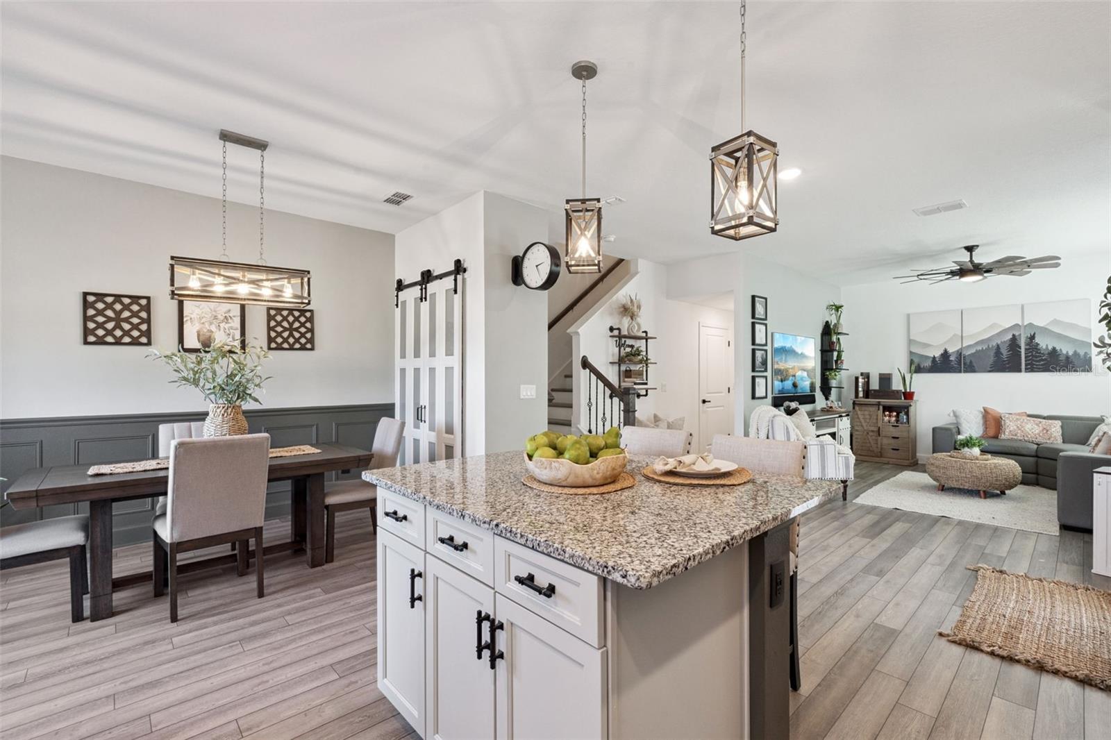 WELCOME HOME to YOUR beautifully upgraded 2023 3 Bedroom, 2.5 bathroom townhome where comfort, style, and thoughtful design shine from the moment you arrive. The EXTENDED PAVER DRIVEWAY and charming ENTRY immediately invite you in and set the stage for everything this home has to offer. Thoughtful details begin immediately with EXTENDEN PAVERS along the WALKWAY and continue through the BACKYARD, where an OVERSIZED PATIO overlooks a PEACEFUL POND VIEW. Entering from the side of the home, you are greeted by lush, WELL MAINTAINED LANDSCAPE. Inside, LUXURY VINYL FLOORING flows throughout the entire home, including the stairwell and second floor, creating a seamless and modern feel. Although built in 2023, this home has been further enhanced with carefully selected upgrades, including DESIGNER CEILING FANS, updated LIGHT FIXTURES, and UPGRADED BATHROOMS. The OPEN CONCEPT main living area overlooks the kitchen, which features a LARGE ISLAND with NEW PENDANT LIGHTING, STAINLESS STEEL APPLIANCES, and FRENCH DOORS that open to the EXPANSIVE PAVER PATIO with a tranquil WATER VIEW. The dining area showcases CUSTOM WOODWORK and a pantry with beautifully CRAFTED CUSTOM BARN DOORS. A fully renovated half bathroom is also located downstairs and features a CUSTOM VANITY, MIRROR, and DETAILED WOODWORK. Upstairs, the oversized primary suite offers a spacious WALK-IN closet and a luxurious bathroom with DUAL SINKS, UPGRADED LIGHTING AND MIRRORS, a WALK-IN SHOWER with UPGRADED TILE and a PRIVATE WATER CLOSET with a NEW SMART TOILET. Two additional bedrooms are situated on the opposite side of the home and share a full bathroom with a TUB AND SHOWER COMBINATION, UPGRADED MIRROR, LIGHT FIXTURE, and UPDATED PLUMPING FIXTURES. The UPSTAIRS LAUNDRY ROOM includes matching tile flooring and convenient shelving. PLANTATION SHUTTERS adorn every window throughout the home, adding both style and privacy. Every detail of this home has been thoughtfully designed and IMPECCABLY MAINTAINED! Schedule your private showing today, this is truly a must see property. Enjoy biking trails, a community pool, dog park, and playground area. All of this in a prime location just minutes from downtown Orlando, Lake Nona/Medical City, Orlando International Airport, UCF, Valencia College, Lockheed Martin, and Waterford Lakes Town Center with its endless shopping and dining options. This move-in ready home offers the lifestyle you’ve been searching for—spacious living, bringing stylish updates.