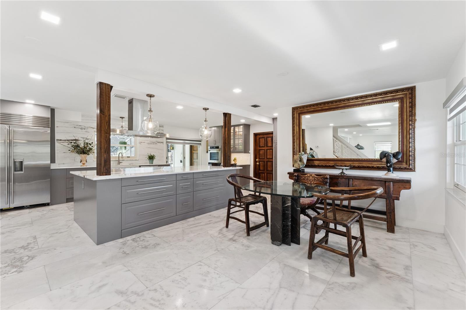 Location, Location, Location! Right in the heart of Dr.Phillips in convenient and highly desirable, gated, Orange Tree Country Club, visit this one-of-a-kind, 'Deep South' inspired & RENOVATED two-story, custom home! Numerous modern upgrades and renovations include: imported 'old world' custom doors, rectangular-cut Marble floors throughout the OPEN Plan main floor Foyer, Living room with custom mantle/hearth fireplace, dedicated Dining space, SHOWCASE Kitchen & Island with Waterfall pattern marble & backsplash, bar seating, custom sliding doors, Modern grey custom cabinets with many drawers, Farmhouse sink, custom pendants, ZLINE gas range (propane), ZLINE convection wall oven with air-fry, SUB-ZERO fridge, ZLINE center range hood & Bosch dishwasher! Great NATURAL light and flow, ideal for entertaining, plus a convenient full bath. Bamboo stairs with wrought iron railings, and all bedrooms also in Bamboo. The Primary renovated suite has a walk-in closet, gorgeous bath with Barn door, French doors to the dual access lengthy full front covered porch with wrought iron railings. Guest bedrooms modern closets, modern bath and one en suite. Large covered Lanai overlooks the large free-form pool with saltwater system and solar heating, plus resurfaced deck. An AMAZINGLY Huge rear yard, fully fenced, well for irrigation, oversized rear access 2-car garage and large concrete slab for entertaining, vehicles or kids play. Roof (2018), Garage Door (2022), AC (2017), New Electric panel, New 'Anderson' windows including French doors with warranties. Orange Tree is wonderful golf community with memberships based on availability. The convenience is unparalleled to schools, YMCA, Sand Lake shopping and restaurants