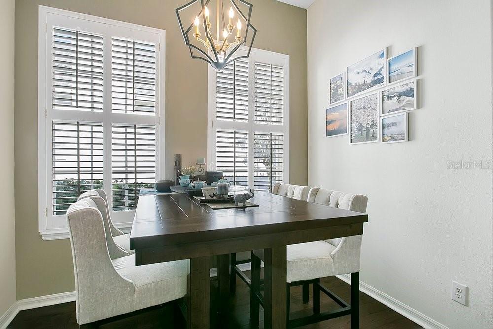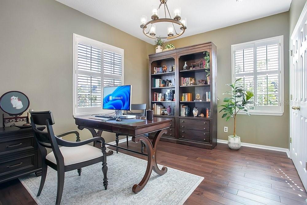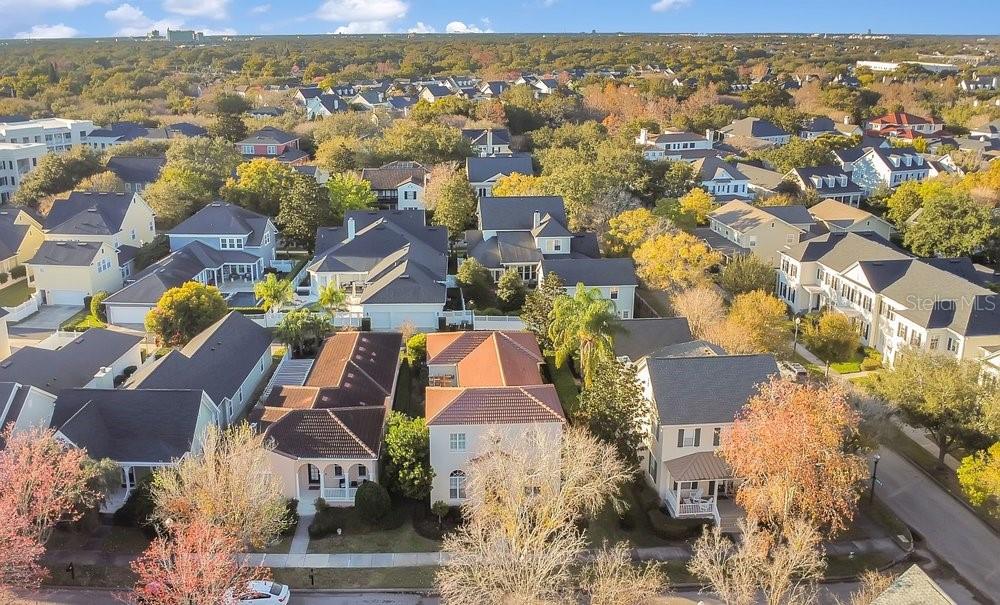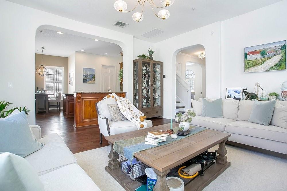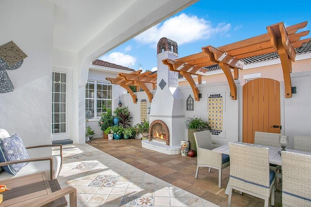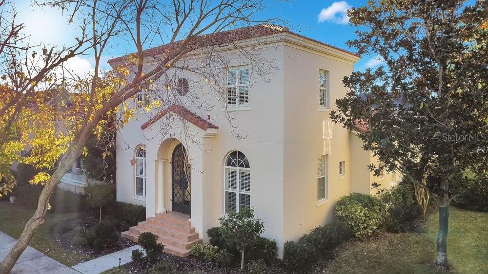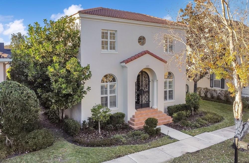 TIMELESS MEDITERRANEAN TWO-STORY home with PRIMARY BEDROOM ON FIRST FLOOR. Come see this 3-bedroom, 2.5 bath home situated in phase one of Baldwin Park on quiet Trapp Ln. Warm details flow throughout, from the wrought iron entry to the Spanish Mission courtyard with a wood burning fireplace. The 2386 sq. ft. layout offers a formal living room, dining room, office nook and a downstairs primary suite with an updated bath and roomy walk in closet. Features include wood floors in the entire home, granite counters, upgraded cabinets, stainless steel appliances and shutters throughout. A coffee bar links the kitchen and dining room, and the private courtyard creates a quiet hideaway for relaxing or hosting. The oversized 3 car garage adds generous storage. Just steps from the Fox Mews, Enders Park and Village Center favorites including restaurants, shops and daily conveniences. Quick access to nearby districts, parks, airports and well known golf courses.