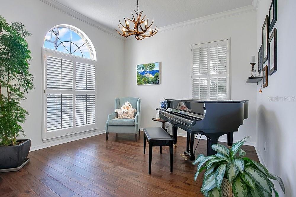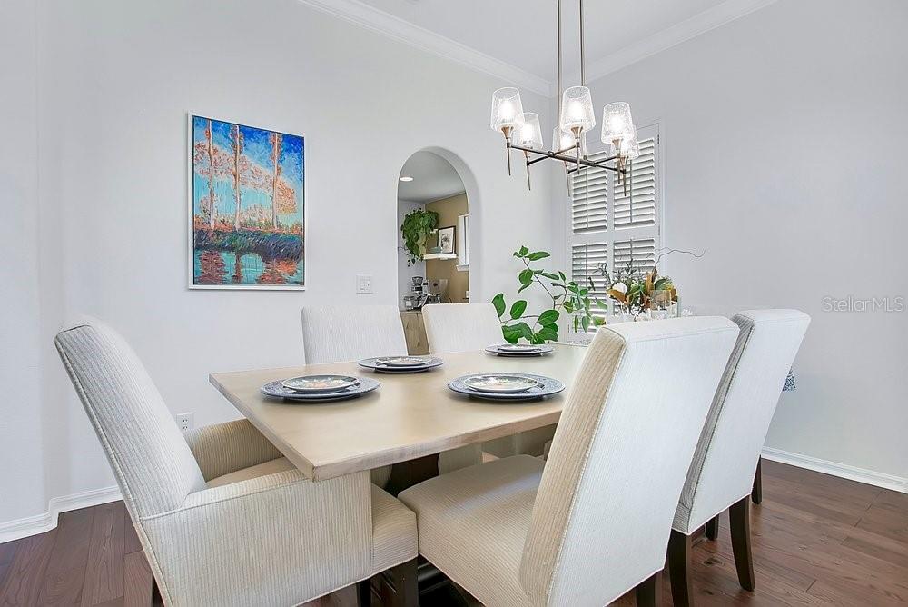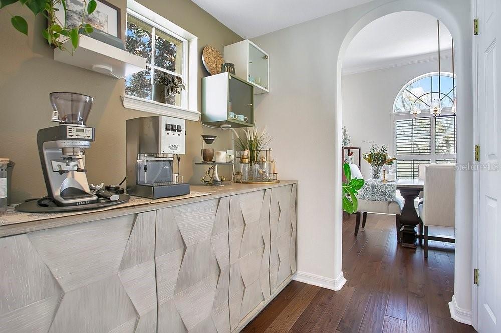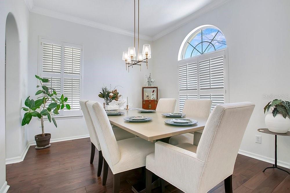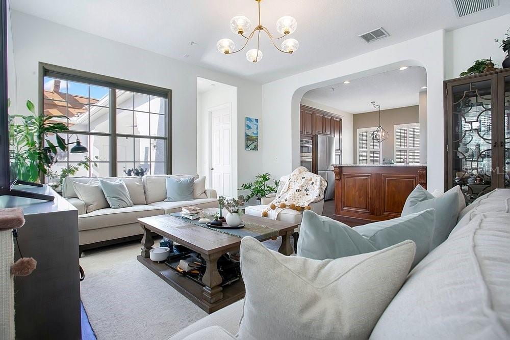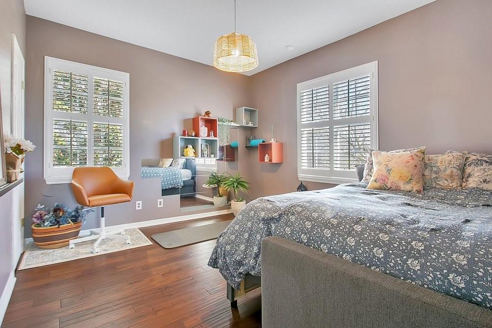 TIMELESS MEDITERRANEAN TWO-STORY home with PRIMARY BEDROOM ON FIRST FLOOR. Come see this 3-bedroom, 2.5 bath home situated in phase one of Baldwin Park on quiet Trapp Ln. Warm details flow throughout, from the wrought iron entry to the Spanish Mission courtyard with a wood burning fireplace. The 2386 sq. ft. layout offers a formal living room, dining room, office nook and a downstairs primary suite with an updated bath and roomy walk in closet. Features include wood floors in the entire home, granite counters, upgraded cabinets, stainless steel appliances and shutters throughout. A coffee bar links the kitchen and dining room, and the private courtyard creates a quiet hideaway for relaxing or hosting. The oversized 3 car garage adds generous storage. Just steps from the Fox Mews, Enders Park and Village Center favorites including restaurants, shops and daily conveniences. Quick access to nearby districts, parks, airports and well known golf courses.