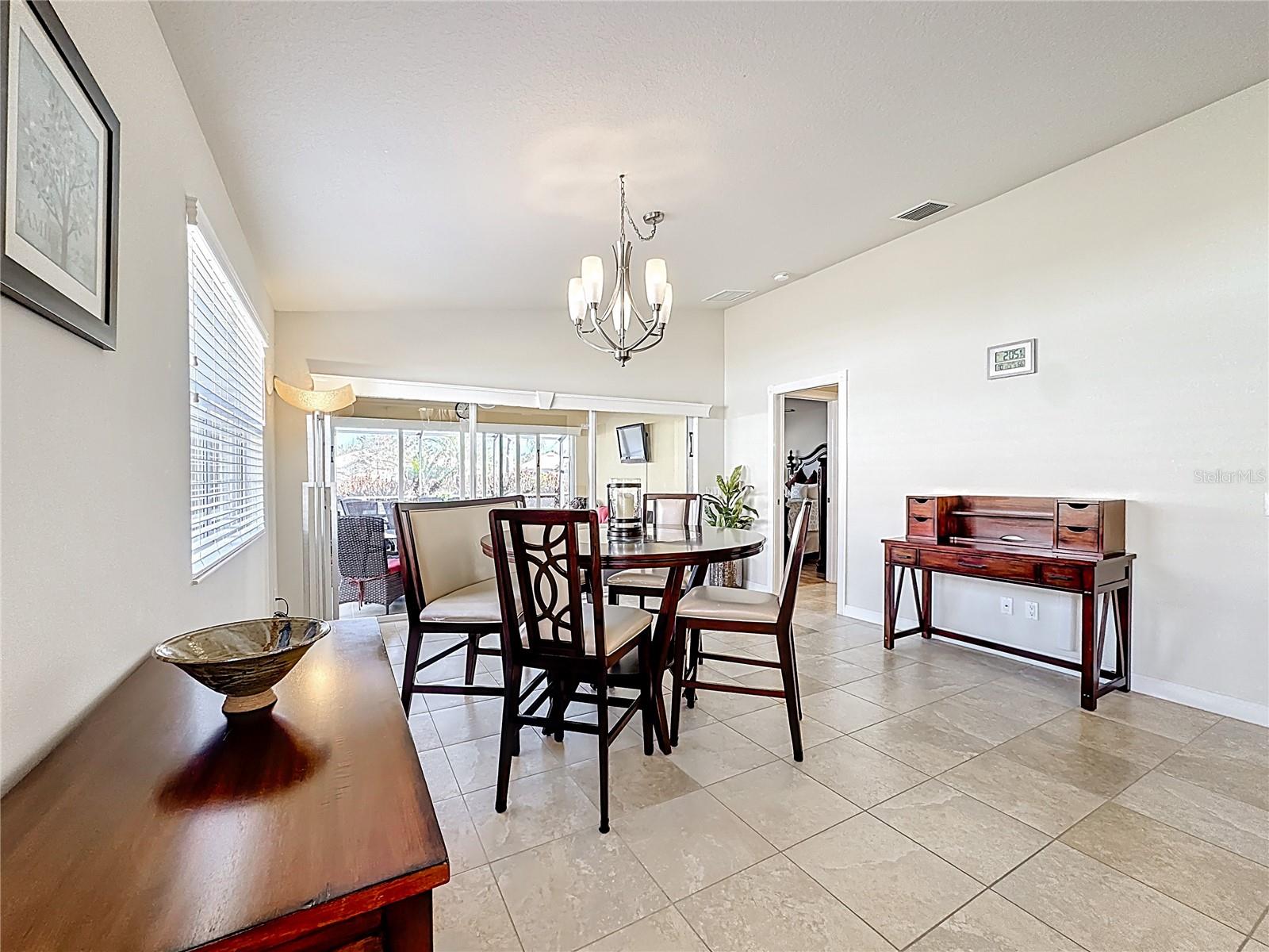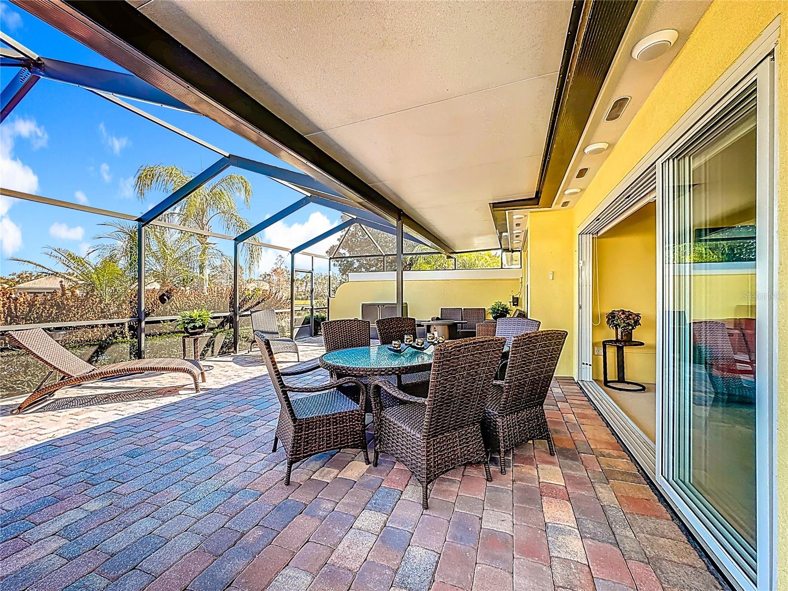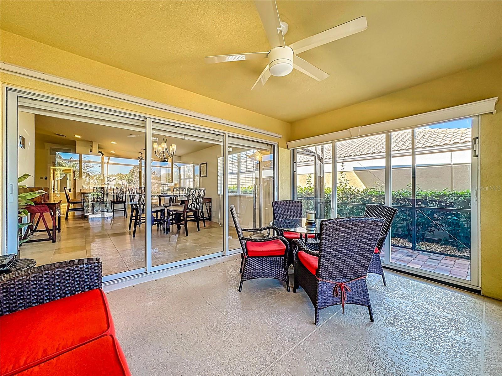Wonderful 2-bedroom, 2-bath home with a desirable split floor plan. No carpet and beautifully updated throughout. Features include custom lighting, spacious walk-in closets, and large sliding glass doors that open to a private backyard. Enjoy stunning water views from the oversized screened-in patio with pavers. Additional highlights include a 2-car garage, side privacy entrance, central vacuum system throughout, and hurricane shutters. All furnishings and décor are included in the sale.