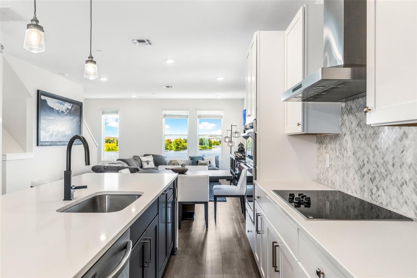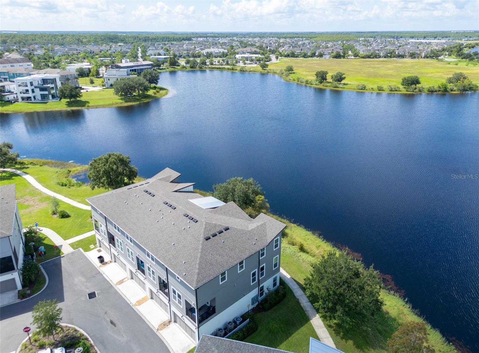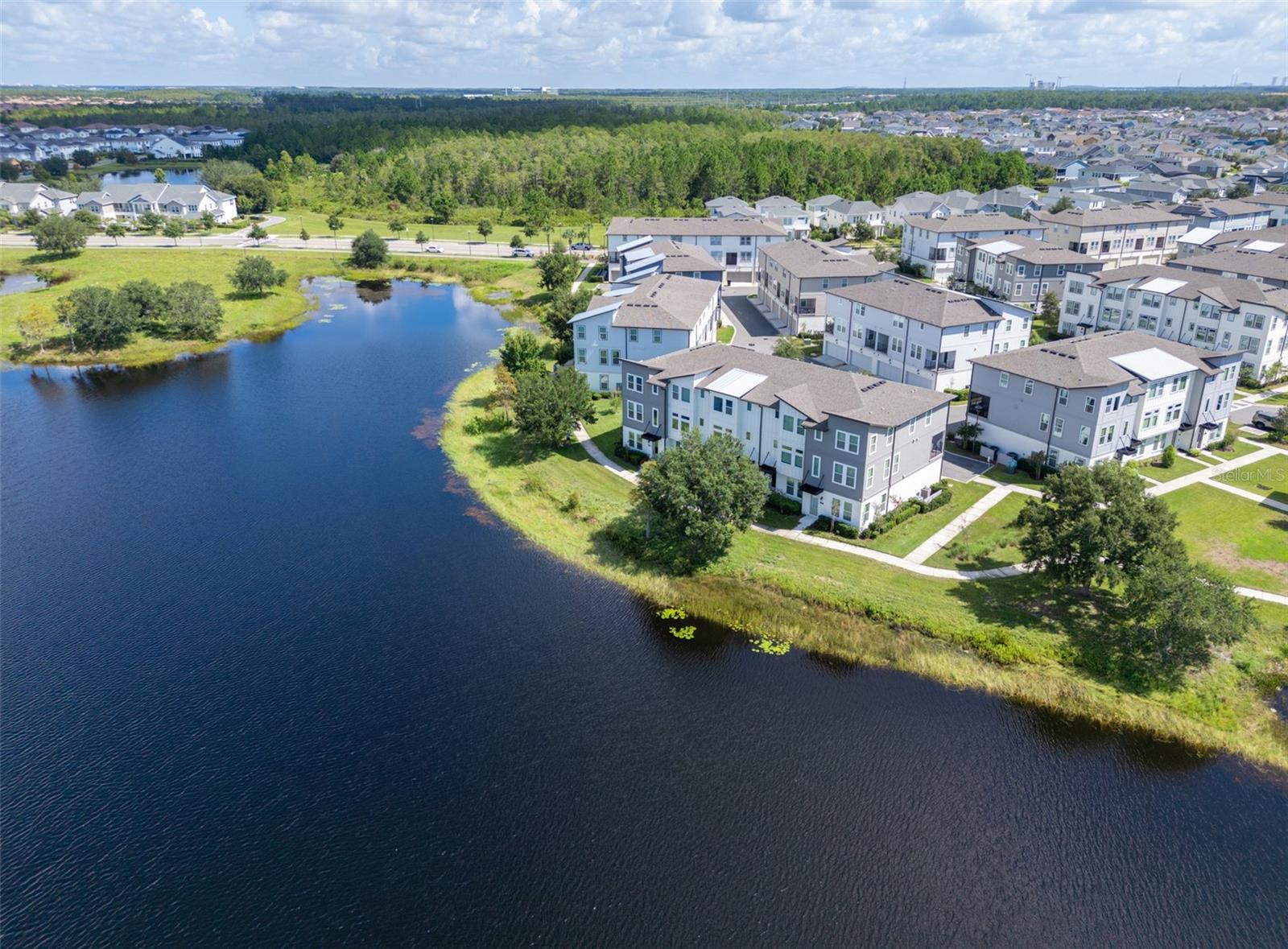 This custom corner luxury townhome screams sophistication with epic water views from nearly every room. We're talking 3 bedrooms, 3.5 baths in a sleek, modern open layout that's perfect for relaxation or throwing epic parties. As a corner unit, there is plenty of natural light and extra privacy. The gourmet kitchen is the total showstopper: massive island, stunning quartz waterfall countertops, top-tier built-in ovens, and premium appliances that make cooking feel like a chef's dream. It flows effortlessly into the living and dining spaces; open-concept magic for seamless entertaining. Level up the fun with a custom built-in bar complete with beverage center and a sleek glass-door wine cellar ready to impress. The spacious owner's suite is a retreat with waterviews from every window! It also features: walk-in closet (custom built-ins galore), spa-like ensuite bath with dual-sink quartz vanity, and an oversized shower featuring a luxurious rain head and steam function. Other killer upgrades: custom fans & lighting throughout, gorgeous woodwork accents and accent walls that add serious style points. Bonus perks: a second-floor balcony begging for sunset cocktails or morning coffee, and thoughtfully designed 2nd and 3rd bedrooms with ensuite full bathrooms that keep everyone comfy and flexible. This isn't just a home, it's your front-row, waterfront seat to the best of Lake Nona living. It's also in a convenient location - not far from the pools, fitness center, coffee shop and Canvas Restaurant and Bar. The community of Laureate Park is in the heart of Lake Nona's Medical City, USTA, KPMG, and Sports District. Plenty of shopping, restaurants and the 417 expressway nearby. Zoned for all A-Rated Lake Nona schools.