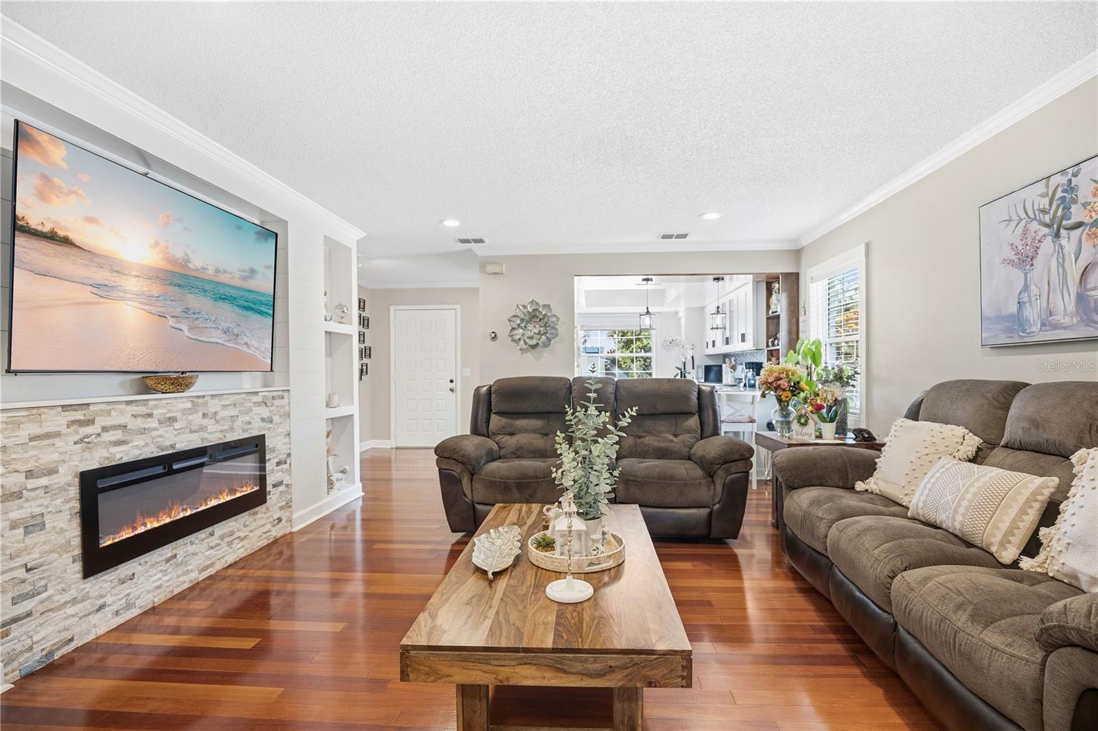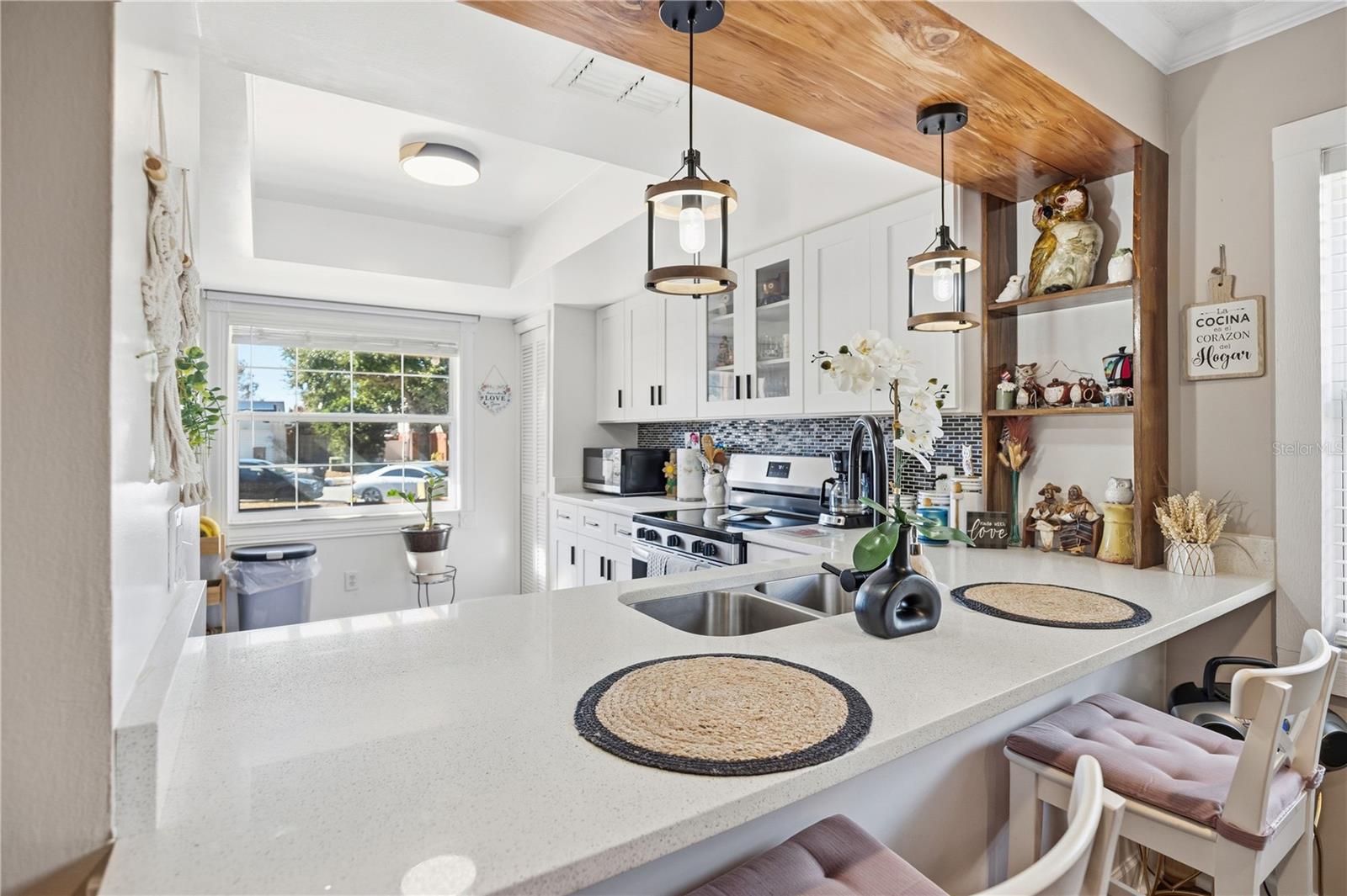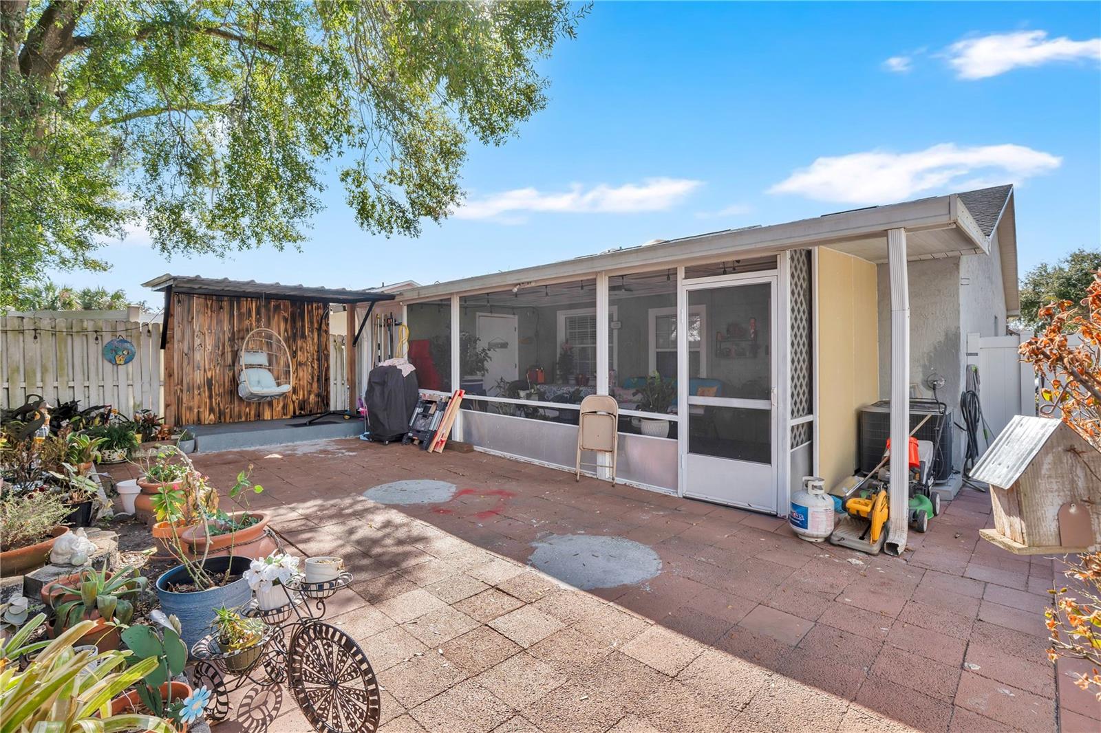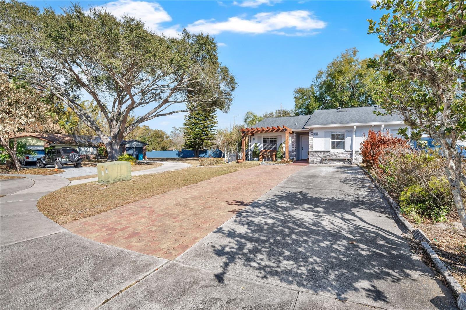From the moment you arrive, there’s an easy charm here — brick pavers leading in, a warm wood pergola framing the front porch, and textured stonework that adds character without trying too hard. Welcoming. Grounded. Quietly confident. Inside, natural sunlight pours across rich wood floors, crown molding, and recessed lighting. No carpet anywhere — just clean tile and wood throughout. Every finish feels intentional. The living room centers around a stacked stone feature wall with a sleek electric fireplace and built-in niches — modern, cozy, and done right. The renovated kitchen is dialed in: white shaker cabinetry, black hardware, quartz counters, and a bold mosaic backsplash. An oversized peninsula with seating opens seamlessly to the living area, framed by warm wood accents and modern pendants. Functional. Elevated. Designed for real life. The primary bath is fully renovated with a double quartz vanity, matte black fixtures, framed mirrors, barn-door entry, and a designer-tiled shower. The guest bath has been thoughtfully updated with a new vanity, mirror, and lighting for a cohesive finish. Out back, the screened-in porch features a custom coffered ceiling with detailed molding, turning outdoor living into a true extension of the home. Beyond it, a private, sunlit courtyard unfolds — mature trees, a charming garden wall, potted greenery, and a tucked-away wood pergola perfect for quiet mornings or winding down in the evening. This wasn’t a "quick flip". It was a labor of love. Upgraded. Warm. And beautifully lived in.
