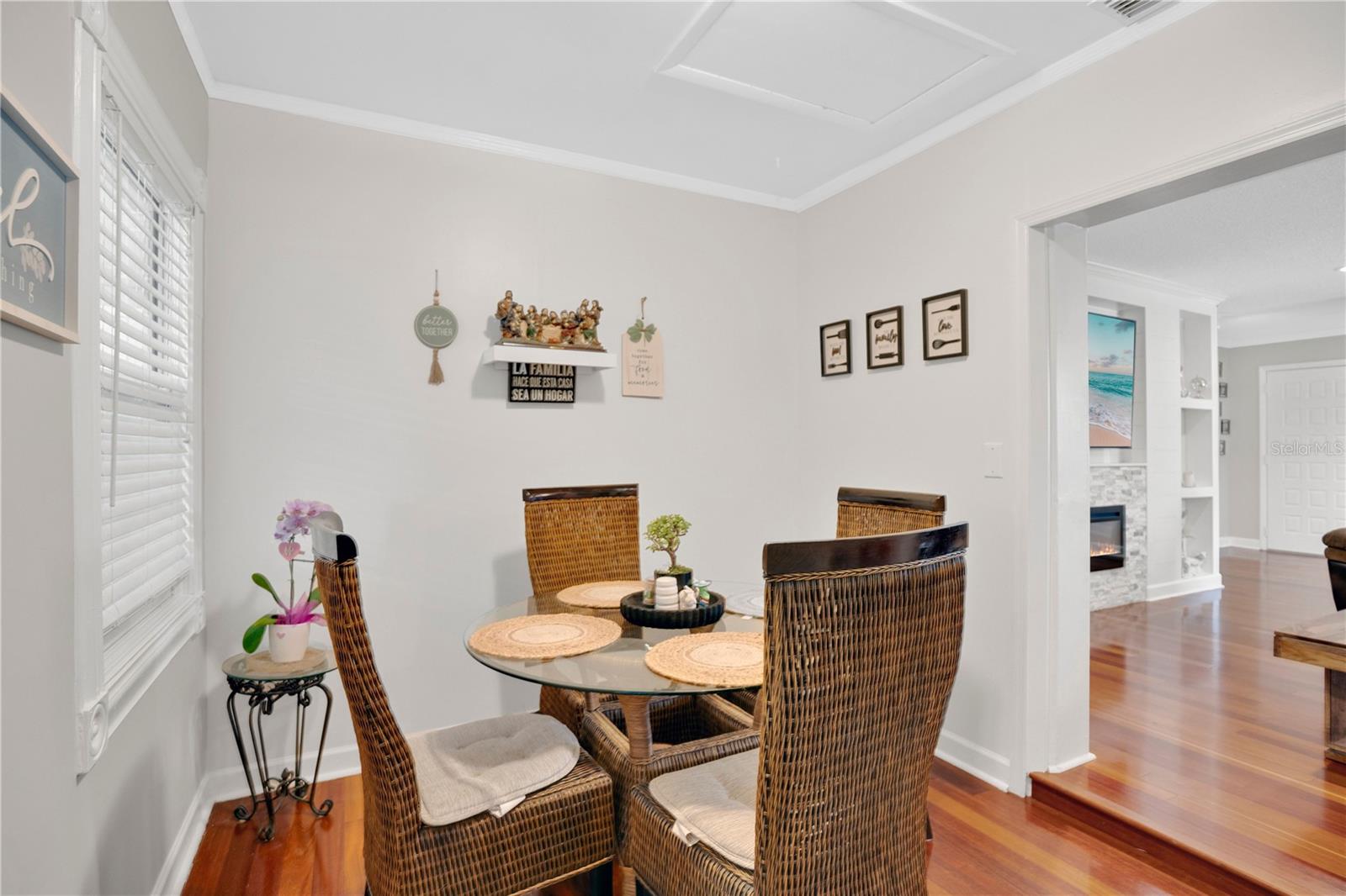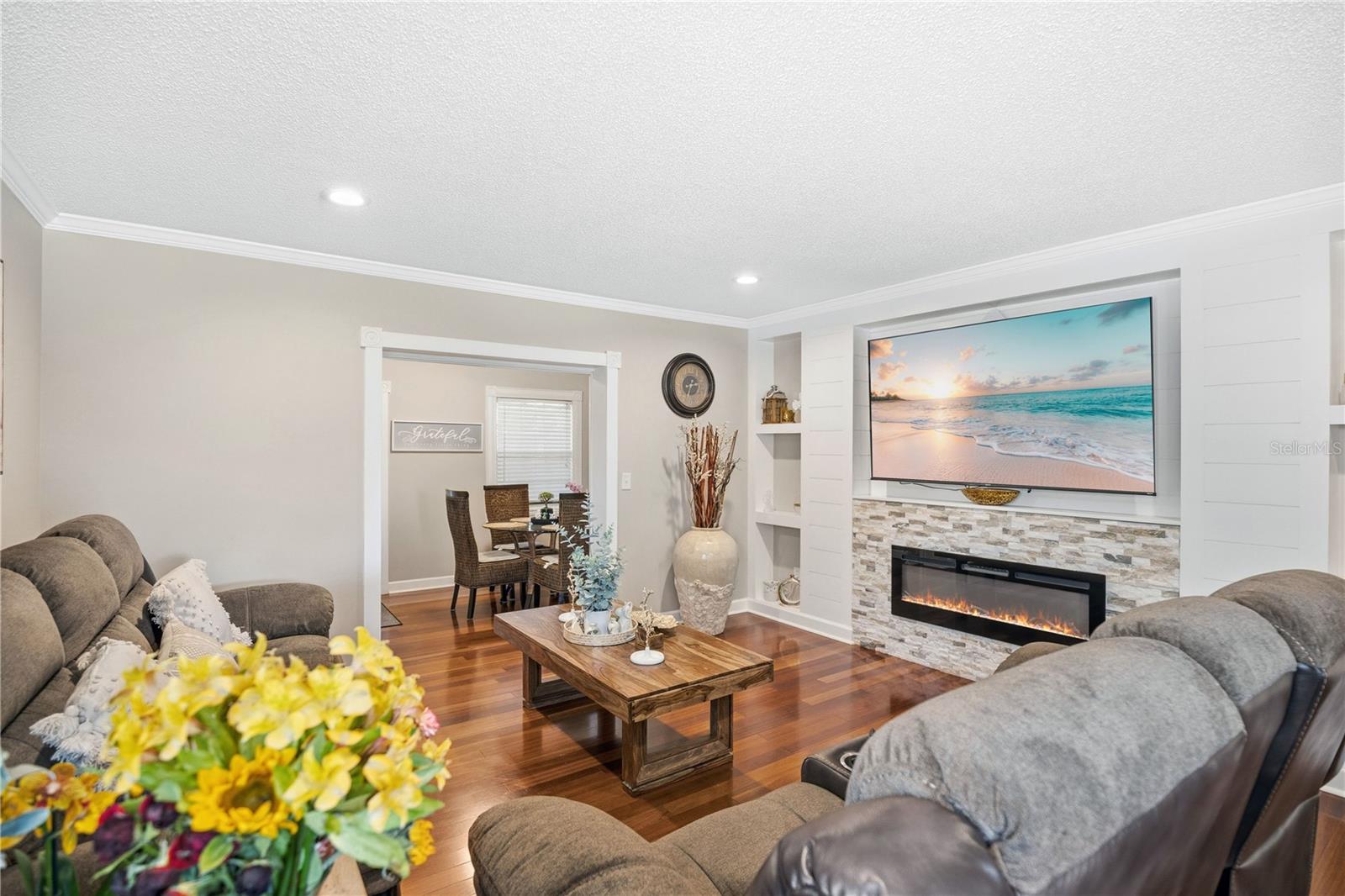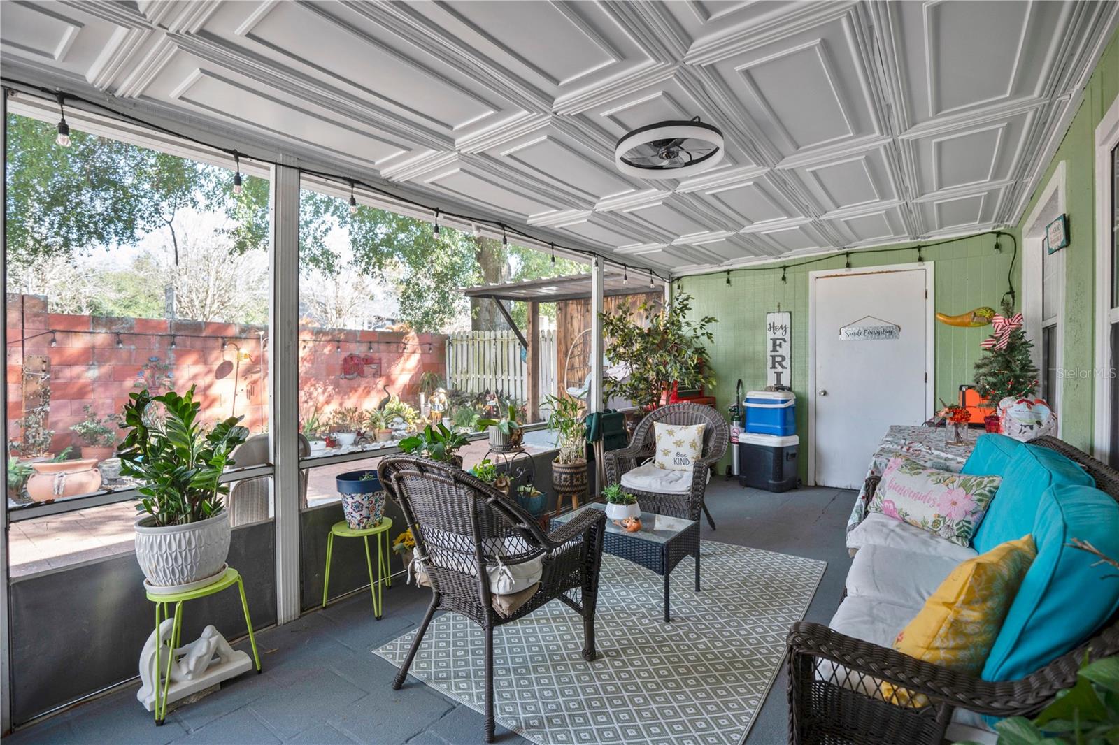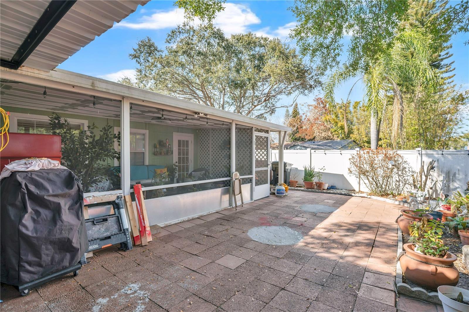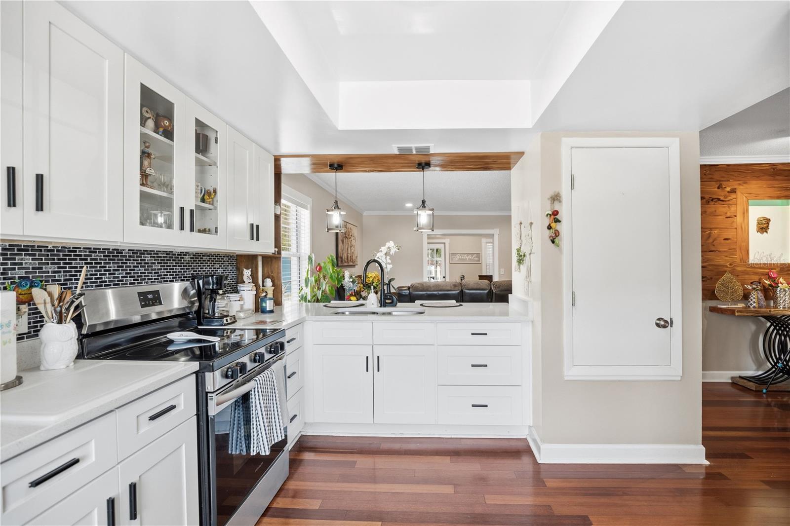 From the moment you arrive, there’s an easy charm here — brick pavers leading in, a warm wood pergola framing the front porch, and textured stonework that adds character without trying too hard. Welcoming. Grounded. Quietly confident. Inside, natural sunlight pours across rich wood floors, crown molding, and recessed lighting. No carpet anywhere — just clean tile and wood throughout. Every finish feels intentional. The living room centers around a stacked stone feature wall with a sleek electric fireplace and built-in niches — modern, cozy, and done right. The renovated kitchen is dialed in: white shaker cabinetry, black hardware, quartz counters, and a bold mosaic backsplash. An oversized peninsula with seating opens seamlessly to the living area, framed by warm wood accents and modern pendants. Functional. Elevated. Designed for real life. The primary bath is fully renovated with a double quartz vanity, matte black fixtures, framed mirrors, barn-door entry, and a designer-tiled shower. The guest bath has been thoughtfully updated with a new vanity, mirror, and lighting for a cohesive finish. Out back, the screened-in porch features a custom coffered ceiling with detailed molding, turning outdoor living into a true extension of the home. Beyond it, a private, sunlit courtyard unfolds — mature trees, a charming garden wall, potted greenery, and a tucked-away wood pergola perfect for quiet mornings or winding down in the evening. This wasn’t a "quick flip". It was a labor of love. Upgraded. Warm. And beautifully lived in.