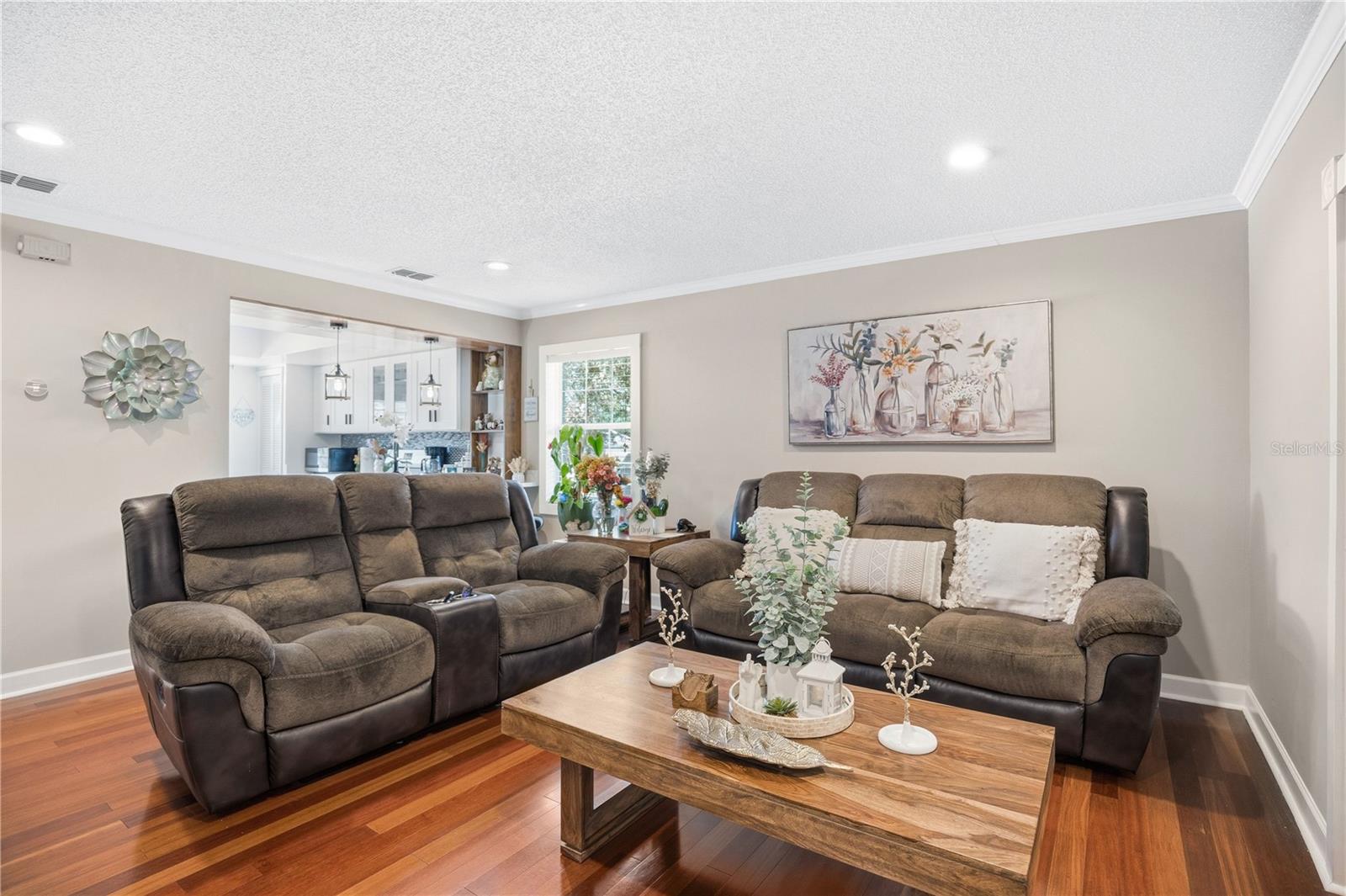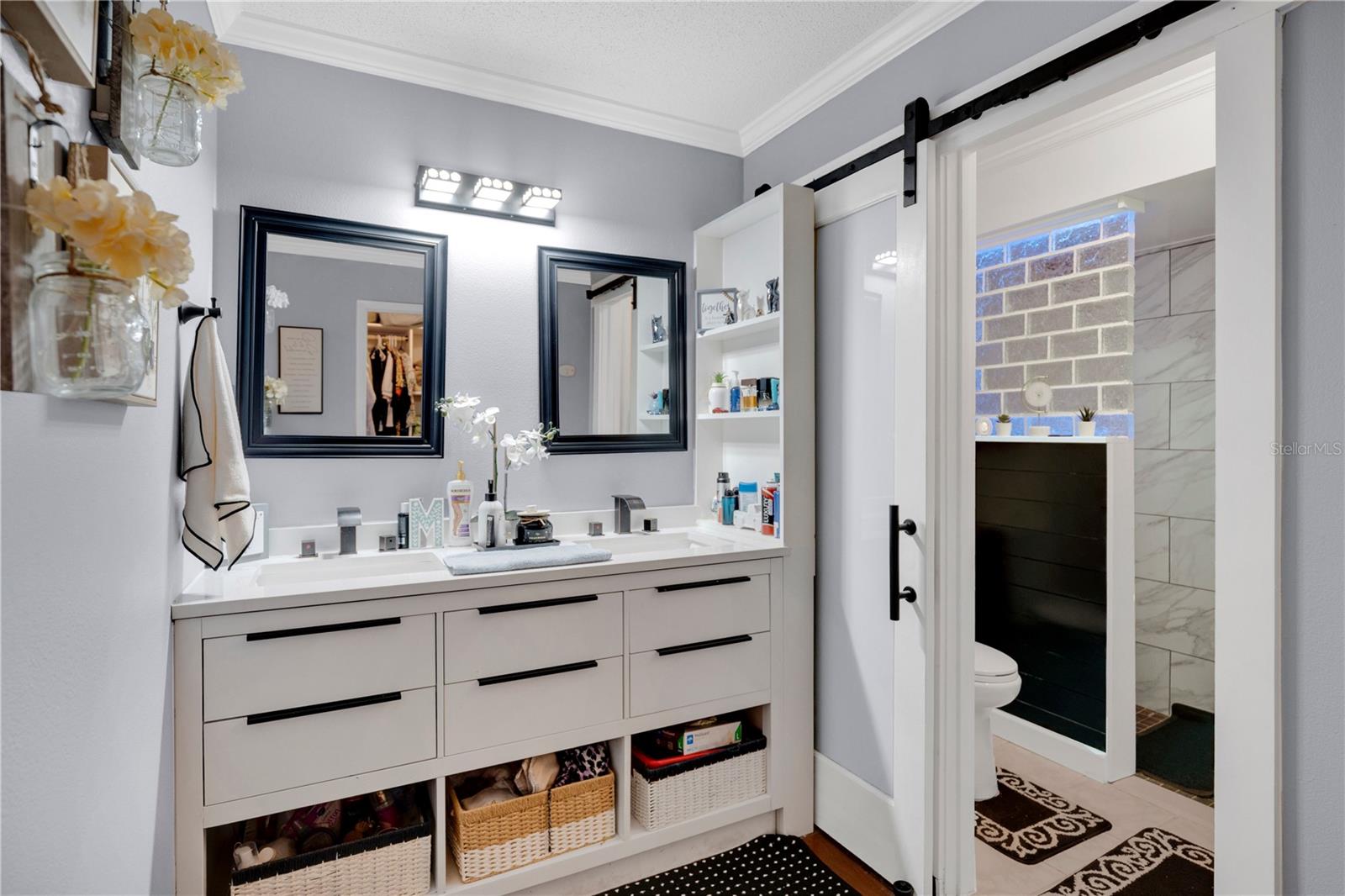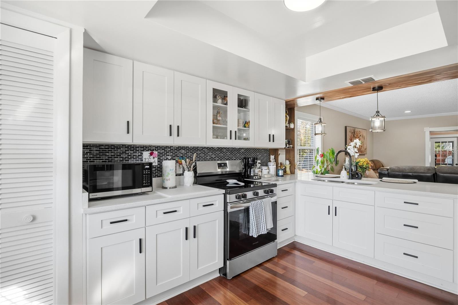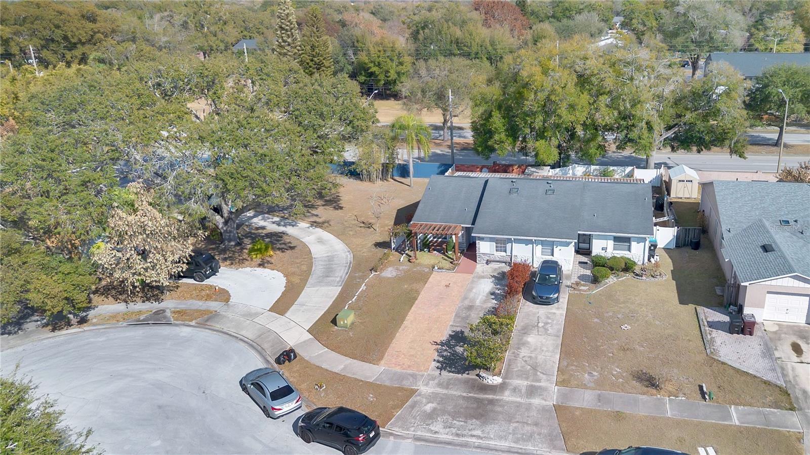 From the moment you arrive, there’s an easy charm here — brick pavers leading in, a warm wood pergola framing the front porch, and textured stonework that adds character without trying too hard. Welcoming. Grounded. Quietly confident. Inside, natural sunlight pours across rich wood floors, crown molding, and recessed lighting. No carpet anywhere — just clean tile and wood throughout. Every finish feels intentional. The living room centers around a stacked stone feature wall with a sleek electric fireplace and built-in niches — modern, cozy, and done right. The renovated kitchen is dialed in: white shaker cabinetry, black hardware, quartz counters, and a bold mosaic backsplash. An oversized peninsula with seating opens seamlessly to the living area, framed by warm wood accents and modern pendants. Functional. Elevated. Designed for real life. The primary bath is fully renovated with a double quartz vanity, matte black fixtures, framed mirrors, barn-door entry, and a designer-tiled shower. The guest bath has been thoughtfully updated with a new vanity, mirror, and lighting for a cohesive finish. Out back, the screened-in porch features a custom coffered ceiling with detailed molding, turning outdoor living into a true extension of the home. Beyond it, a private, sunlit courtyard unfolds — mature trees, a charming garden wall, potted greenery, and a tucked-away wood pergola perfect for quiet mornings or winding down in the evening. This wasn’t a "quick flip". It was a labor of love. Upgraded. Warm. And beautifully lived in.