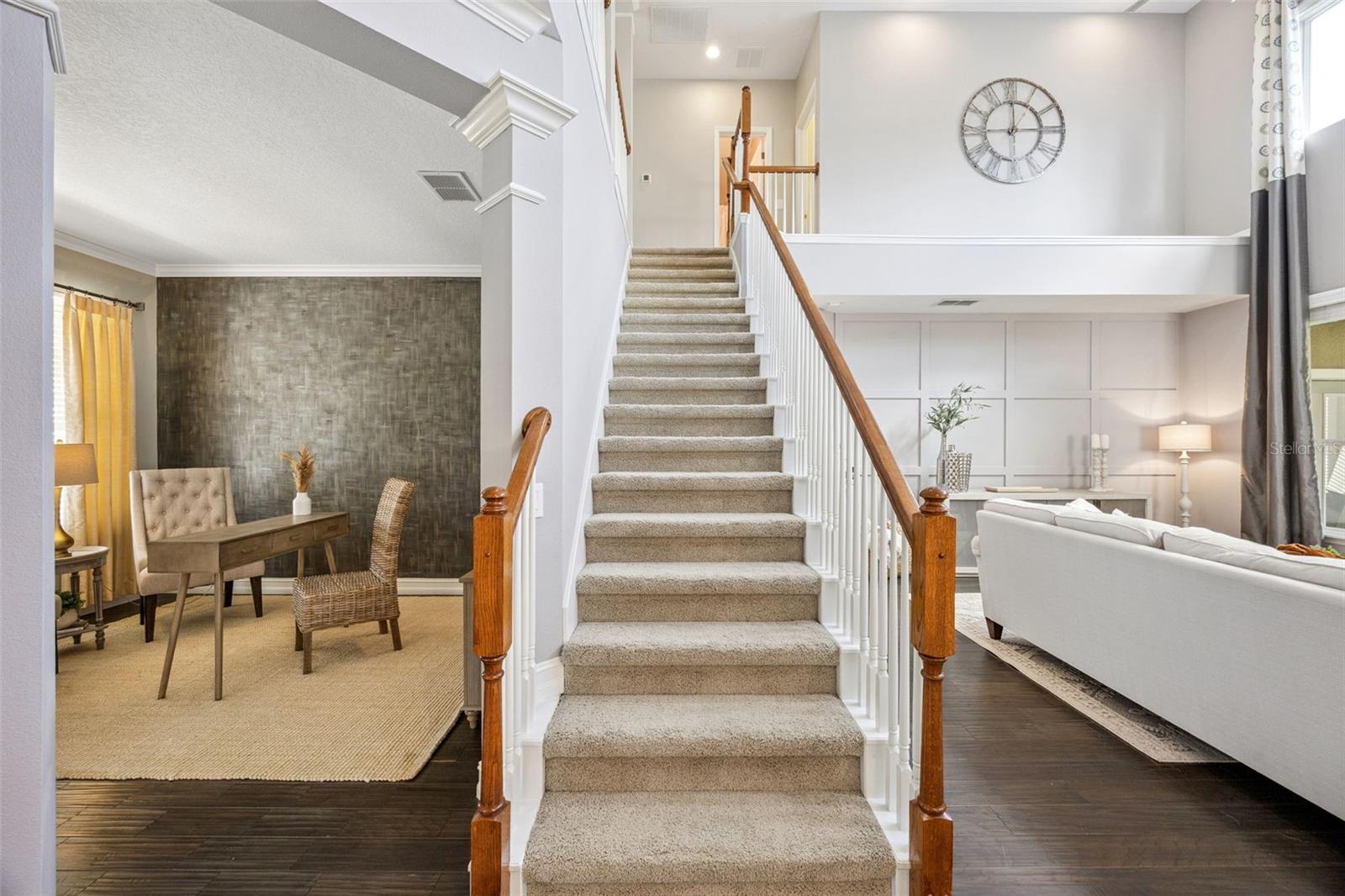 Welcome to this stunning David Weekley–built home in the highly desirable Northwest Village of Avalon Park, offering 3,052 total square feet of beautifully designed living space with 4 bedrooms, 3.5 bathrooms, a loft, and a bonus room. From the moment you arrive, the curb appeal stands out with an attractive paver walkway, lush landscaping with palm trees and a decorative boulder create a welcoming first impression. The full-length covered front patio stretches across the home, providing the perfect place to relax and enjoy the neighborhood. Step inside to a bright and inviting foyer featuring engineered hardwood flooring that extends through to the great room. To the right is the formal dining room, beautifully finished with a chair rail and elegant paintwork, ideal for hosting gatherings. To the left, the formal living room currently functions as a stylish home office, highlighted by an accent wall. The main living area features soaring ceilings and dramatic high windows, complete with electric roll shades operated by a wall switch, filling the home with natural light. A custom wood accent wall adds warmth and character to the space. The open staircase with spindle railing enhances the home’s open feel, and under-stair storage provides practical organization. The kitchen overlooks the main living space and features granite countertops, stainless steel appliances, tile backsplash, and large cabinetry with crown molding, including a glass-front display cabinet. A cozy kitchen nook provides the perfect space for casual dining. The primary suite is conveniently located on the first floor and has been extended to create an oversized retreat with conservation views and French door access to the covered patio. The primary bath offers a large garden tub, glass-enclosed shower, dual vanities, and a custom walk-in closet system. Upstairs, a spacious loft separates the bedrooms, creating ideal privacy and flexibility. One side of the home features two bedrooms connected by a Jack-and-Jill bathroom, while the opposite side includes a private bedroom with another full bath—perfect for guests or multigenerational living. A large bonus room adds even more flexibility and could serve as a media room, playroom, or additional home office. Outdoor living is just as impressive. The back patio features a beautiful tongue-and-groove wood ceiling, recessed lighting, and an electric roll shade, allowing the space to function as a fully screened outdoor living area with peaceful conservation views. A long rear-entry driveway leads to a two car garage with plenty of parking. This home has been thoughtfully upgraded over time, including two AC units (2019), a new roof and gutters (2025), new water heater (2026), updated lighting and fans throughout, along with interior and exterior paint. Avalon Park is a community with very desirable school zones. Community amenities include basketball courts, tennis courts, racquetball courts, playgrounds, sand volleyball court, splash pad, baseball and soccer fields, community center, walking and biking trails. HOA FEES INCLUDE CABLE & INTERNET. Ask your agent for the Upgrade List & make an appointment to see this home today!