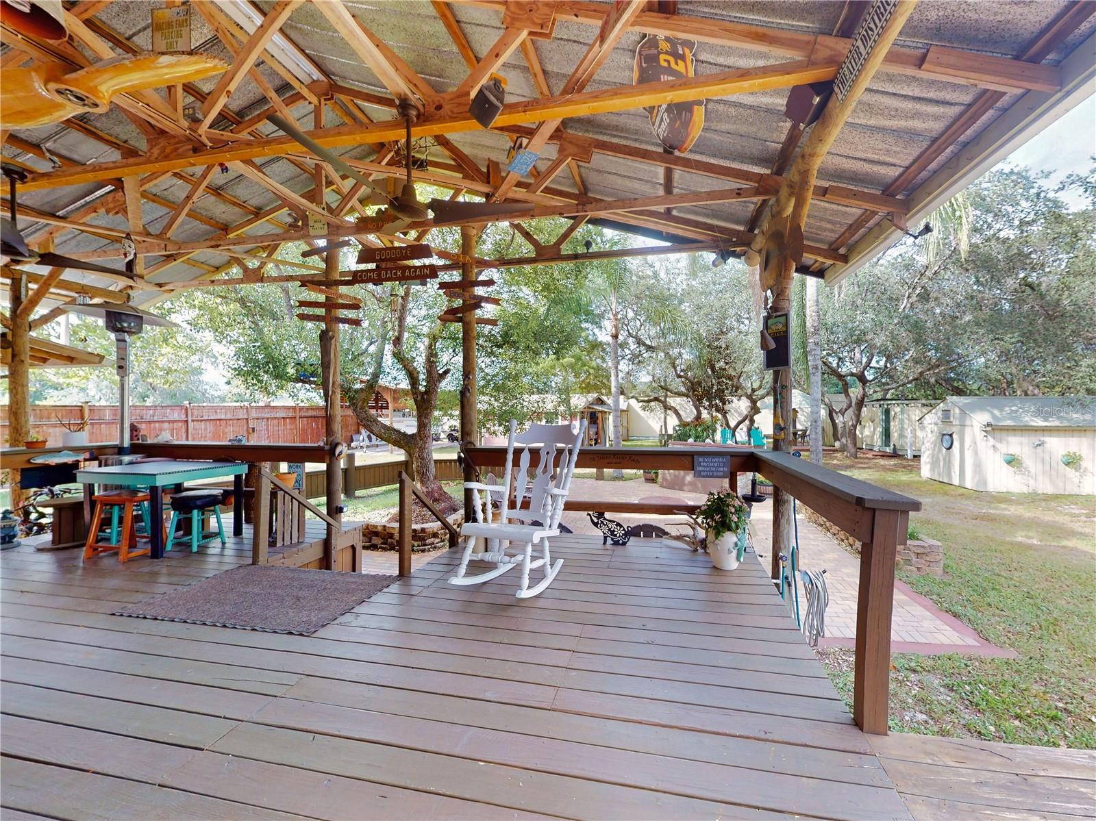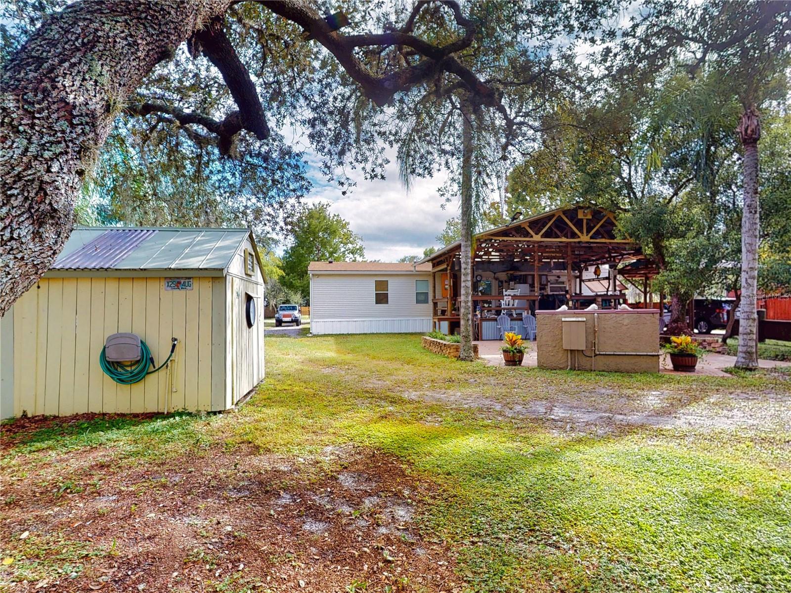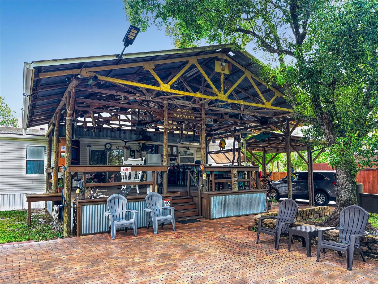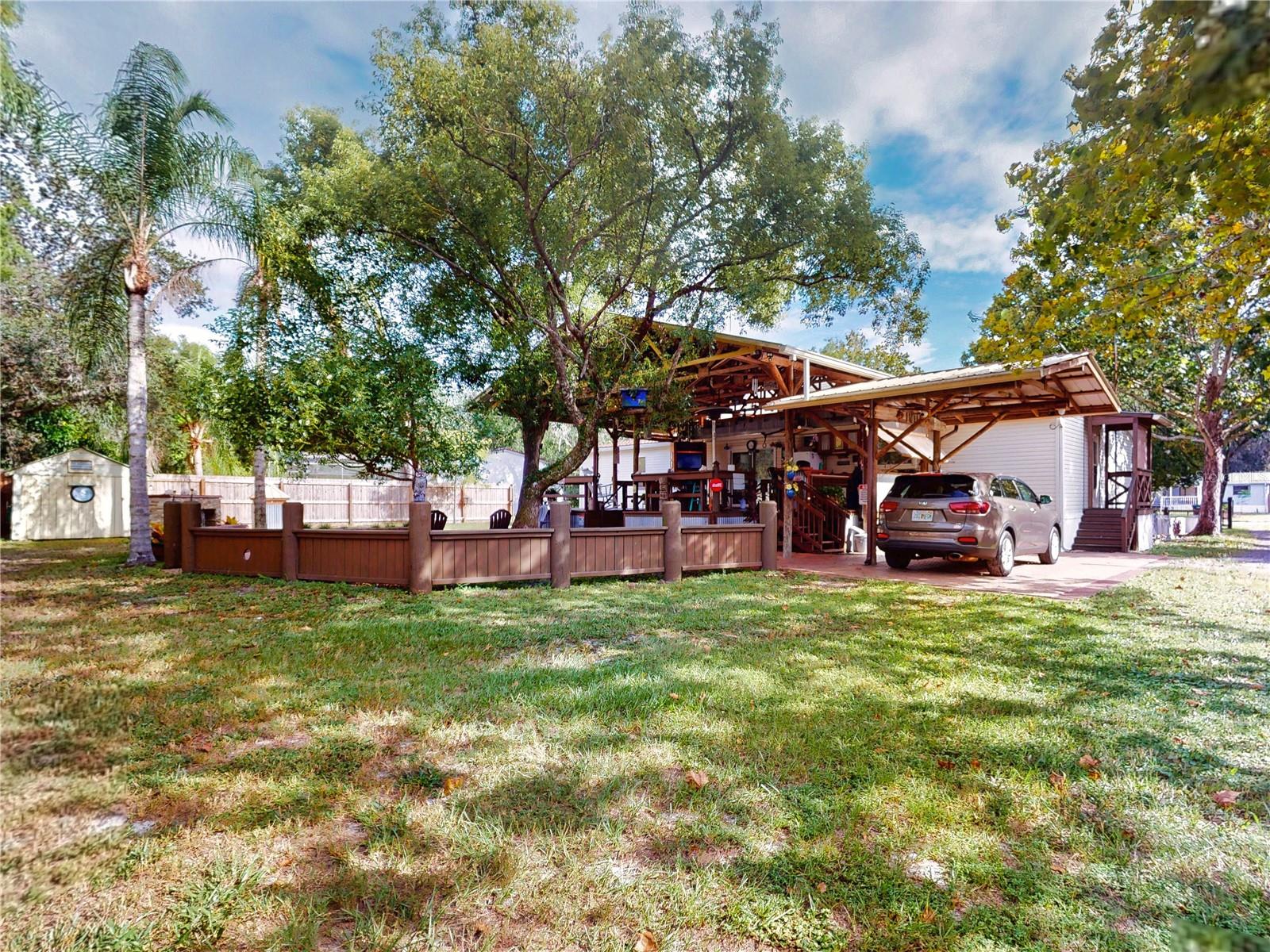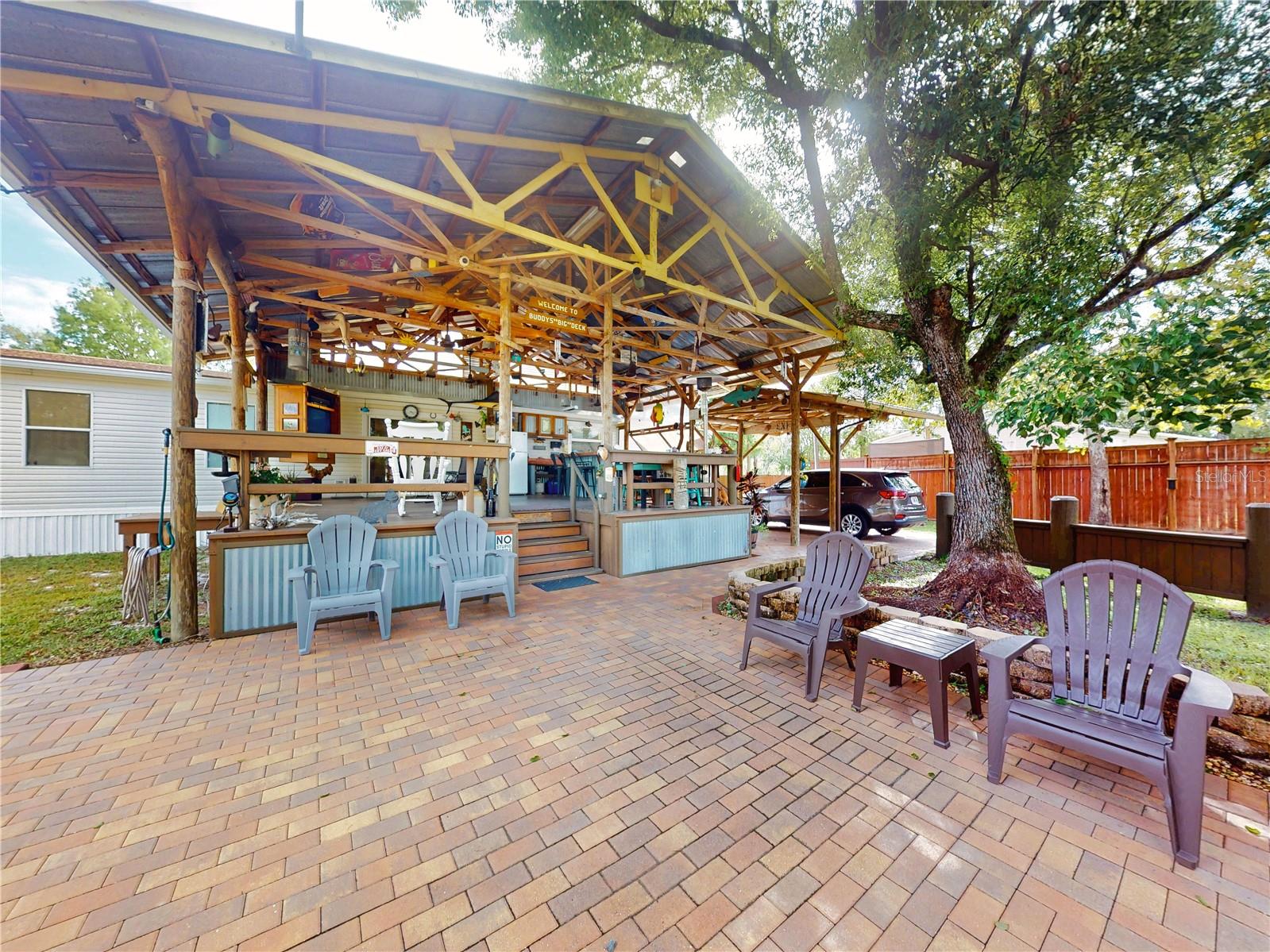 Escape to your own private retreat on a quiet dead-end dirt road. This unique property offers a rare combination of privacy, outdoor luxury, and versatile living spaces. The centerpiece is a spacious 24' x 24' entertainment deck featuring cook top stove and sink, can easily add a refrigerator for a full kitchen, outdoor sound system, outdoor TV—perfect for hosting gatherings year-round. Just off the deck, you'll find a beautifully designed brick-paver patio with a custom fire pit and tranquil waterfall, creating a serene outdoor ambiance. A large outdoor bathroom with a double shower adds convenience and comfort for guests. Two climate-controlled workshops, with the largest equipped with air conditioning, heating, and a TV. Ideal space for hobbies, crafts, or additional storage. The property also includes a tiki hut, covered parking for an RV or boat, a carport for your personal vehicle, and additional storage space beneath the deck. Dual gate entrances form a full U-shaped driveway, enhancing both accessibility and security. A comprehensive surveillance system with 9 cameras ensures peace of mind. Roof replaced in 2024. This 2002 Palm Harbor Talladega model featuring a split floor plan, crown molding, tile and laminate plank flooring, an eat-in kitchen, formal dining room, and a spacious living room with a built-in sound system. An indoor laundry room adds convenience, and hurricane shutters provide added protection. The property is serviced by a private well and septic system, with a triple-filtration water system ensuring clean water throughout the home. Additional storage outside available under the large deck out back. This retreat is one of a kind, call today to set up a private showing.