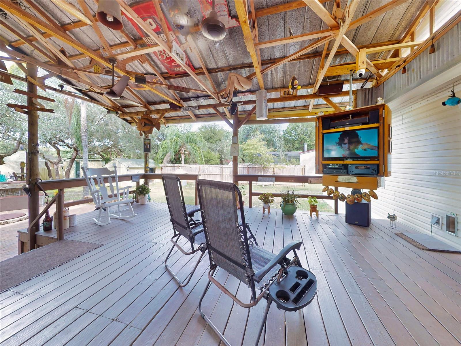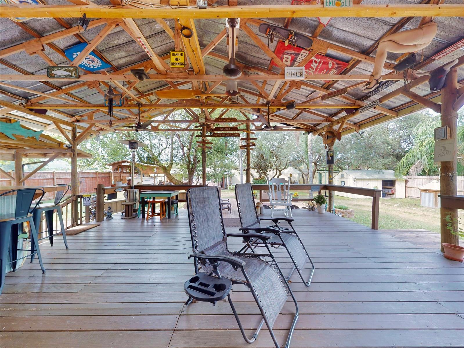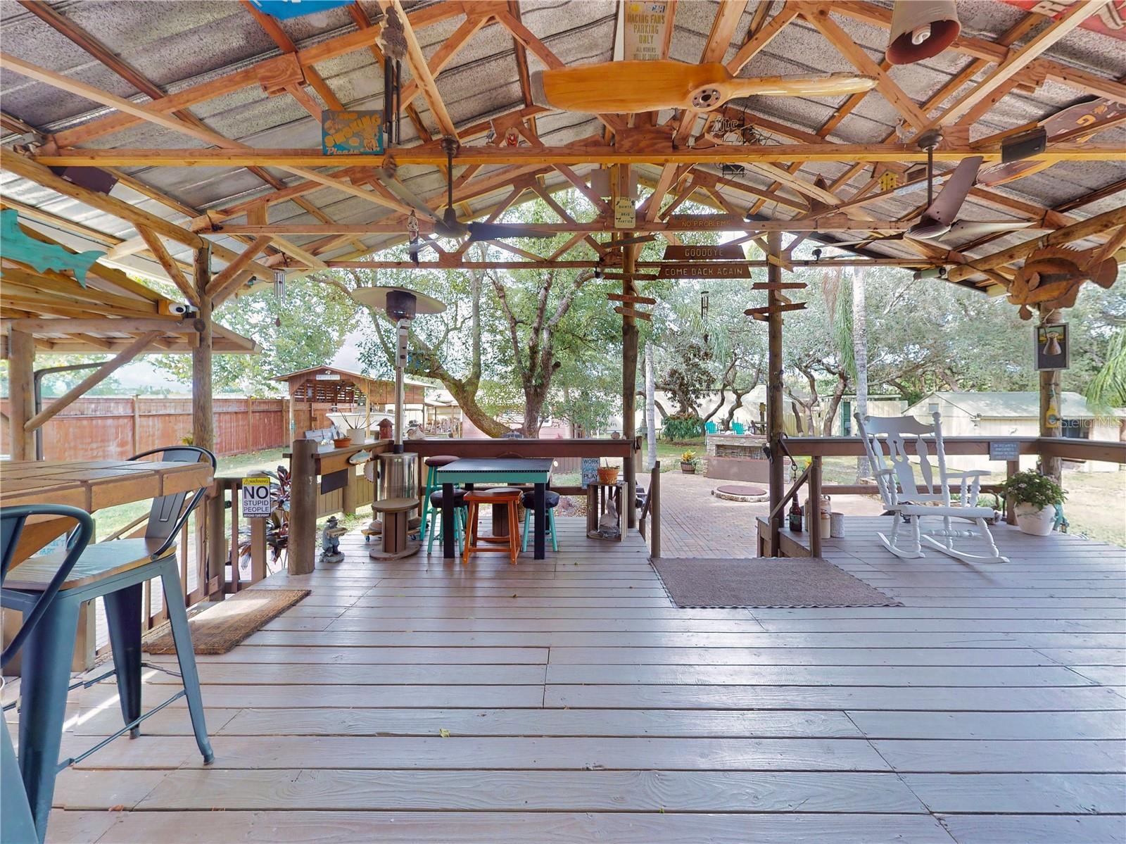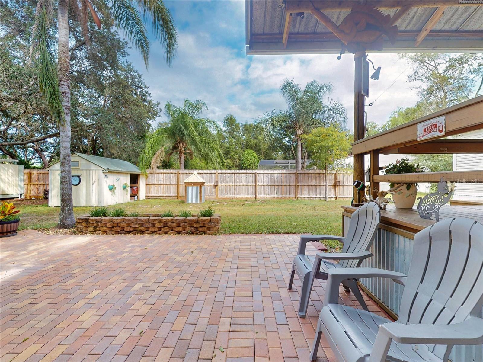 Escape to your own private retreat on a quiet dead-end dirt road. This unique property offers a rare combination of privacy, outdoor luxury, and versatile living spaces. The centerpiece is a spacious 24' x 24' entertainment deck featuring cook top stove and sink, can easily add a refrigerator for a full kitchen, outdoor sound system, outdoor TV—perfect for hosting gatherings year-round. Just off the deck, you'll find a beautifully designed brick-paver patio with a custom fire pit and tranquil waterfall, creating a serene outdoor ambiance. A large outdoor bathroom with a double shower adds convenience and comfort for guests. Two climate-controlled workshops, with the largest equipped with air conditioning, heating, and a TV. Ideal space for hobbies, crafts, or additional storage. The property also includes a tiki hut, covered parking for an RV or boat, a carport for your personal vehicle, and additional storage space beneath the deck. Dual gate entrances form a full U-shaped driveway, enhancing both accessibility and security. A comprehensive surveillance system with 9 cameras ensures peace of mind. Roof replaced in 2024. This 2002 Palm Harbor Talladega model featuring a split floor plan, crown molding, tile and laminate plank flooring, an eat-in kitchen, formal dining room, and a spacious living room with a built-in sound system. An indoor laundry room adds convenience, and hurricane shutters provide added protection. The property is serviced by a private well and septic system, with a triple-filtration water system ensuring clean water throughout the home. Additional storage outside available under the large deck out back. This retreat is one of a kind, call today to set up a private showing.