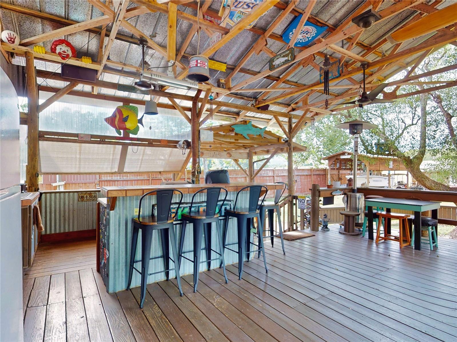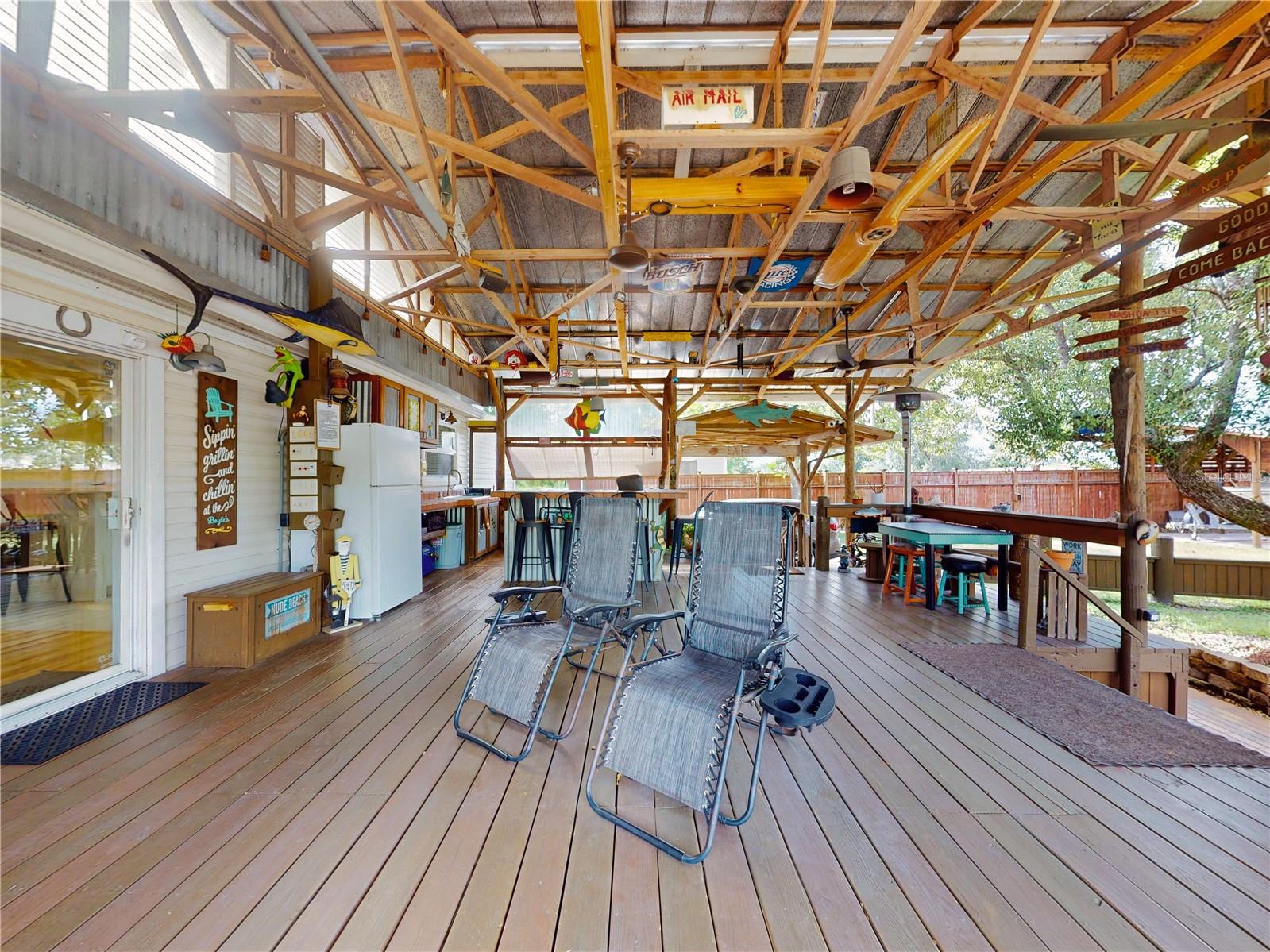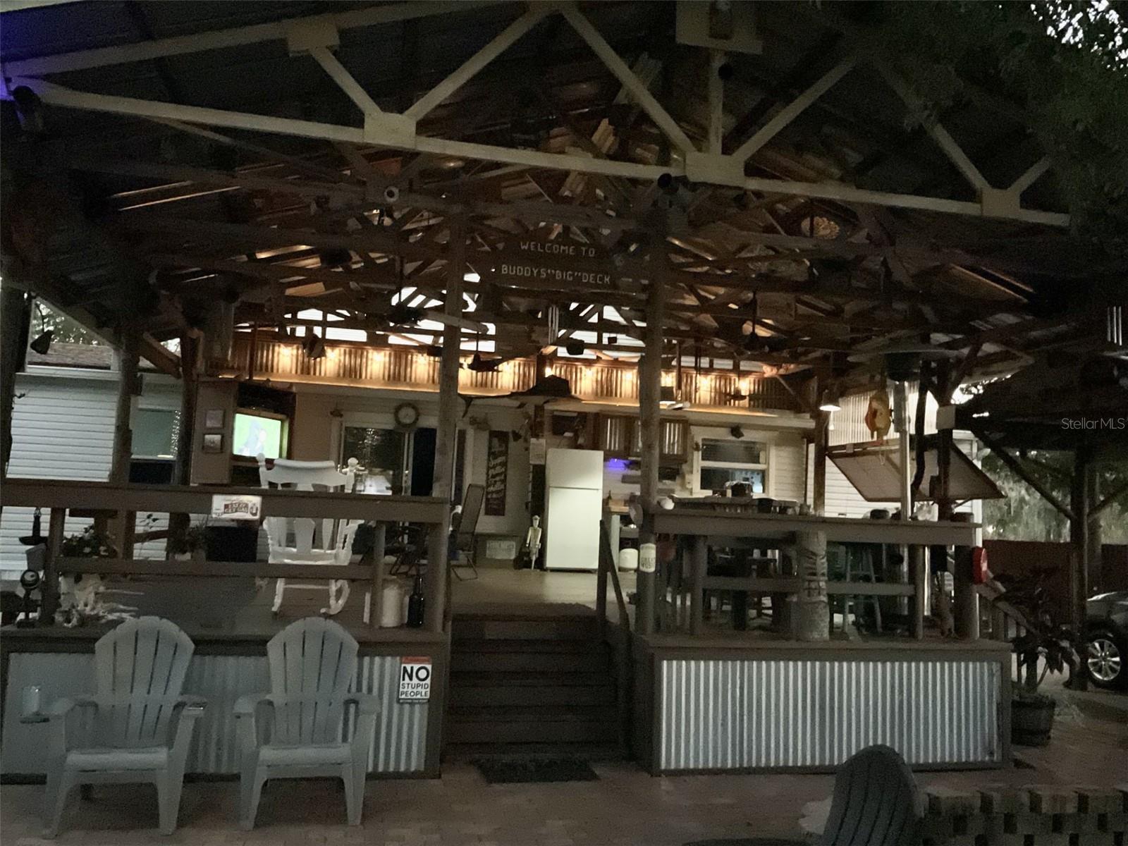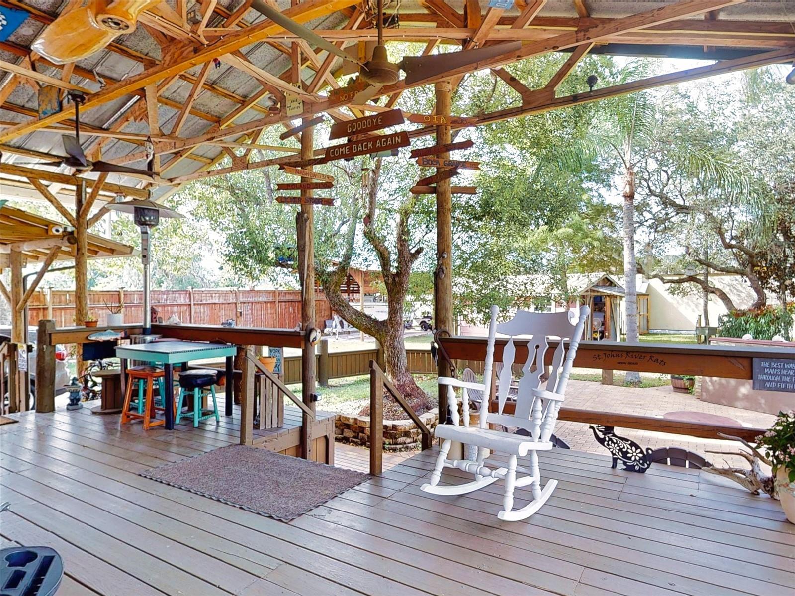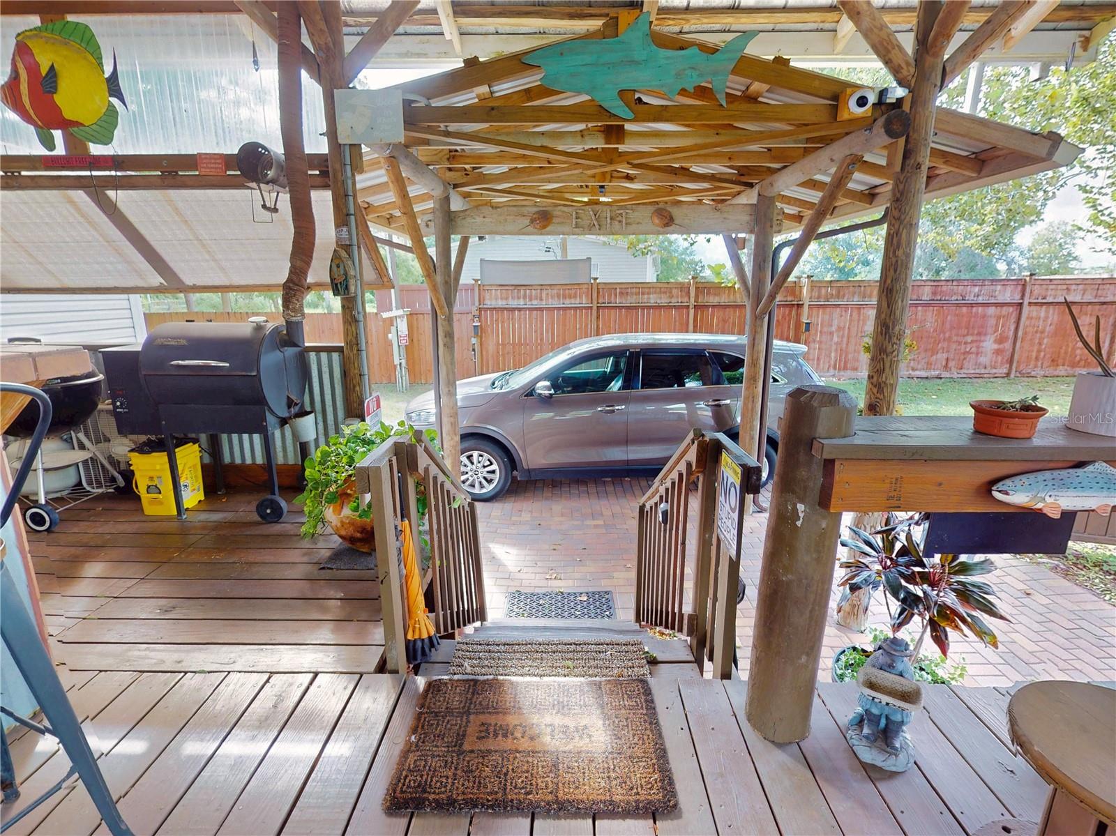 Escape to your own private retreat on a quiet dead-end dirt road. This unique property offers a rare combination of privacy, outdoor luxury, and versatile living spaces. The centerpiece is a spacious 24' x 24' entertainment deck featuring cook top stove and sink, can easily add a refrigerator for a full kitchen, outdoor sound system, outdoor TV—perfect for hosting gatherings year-round. Just off the deck, you'll find a beautifully designed brick-paver patio with a custom fire pit and tranquil waterfall, creating a serene outdoor ambiance. A large outdoor bathroom with a double shower adds convenience and comfort for guests. Two climate-controlled workshops, with the largest equipped with air conditioning, heating, and a TV. Ideal space for hobbies, crafts, or additional storage. The property also includes a tiki hut, covered parking for an RV or boat, a carport for your personal vehicle, and additional storage space beneath the deck. Dual gate entrances form a full U-shaped driveway, enhancing both accessibility and security. A comprehensive surveillance system with 9 cameras ensures peace of mind. Roof replaced in 2024. This 2002 Palm Harbor Talladega model featuring a split floor plan, crown molding, tile and laminate plank flooring, an eat-in kitchen, formal dining room, and a spacious living room with a built-in sound system. An indoor laundry room adds convenience, and hurricane shutters provide added protection. The property is serviced by a private well and septic system, with a triple-filtration water system ensuring clean water throughout the home. Additional storage outside available under the large deck out back. This retreat is one of a kind, call today to set up a private showing.