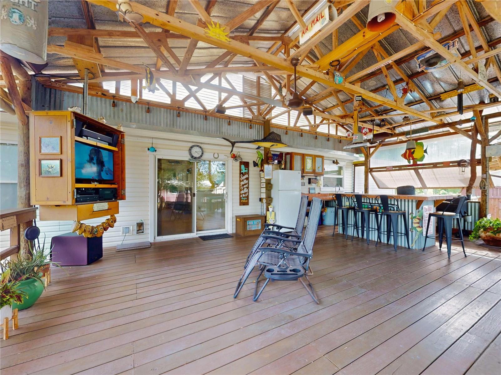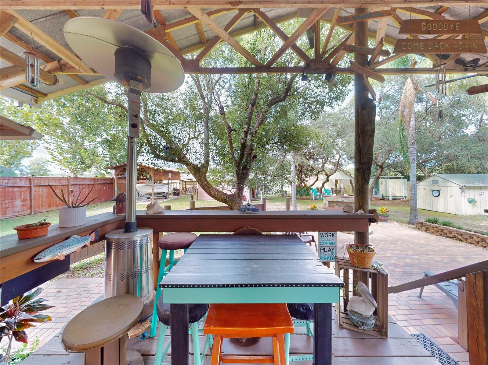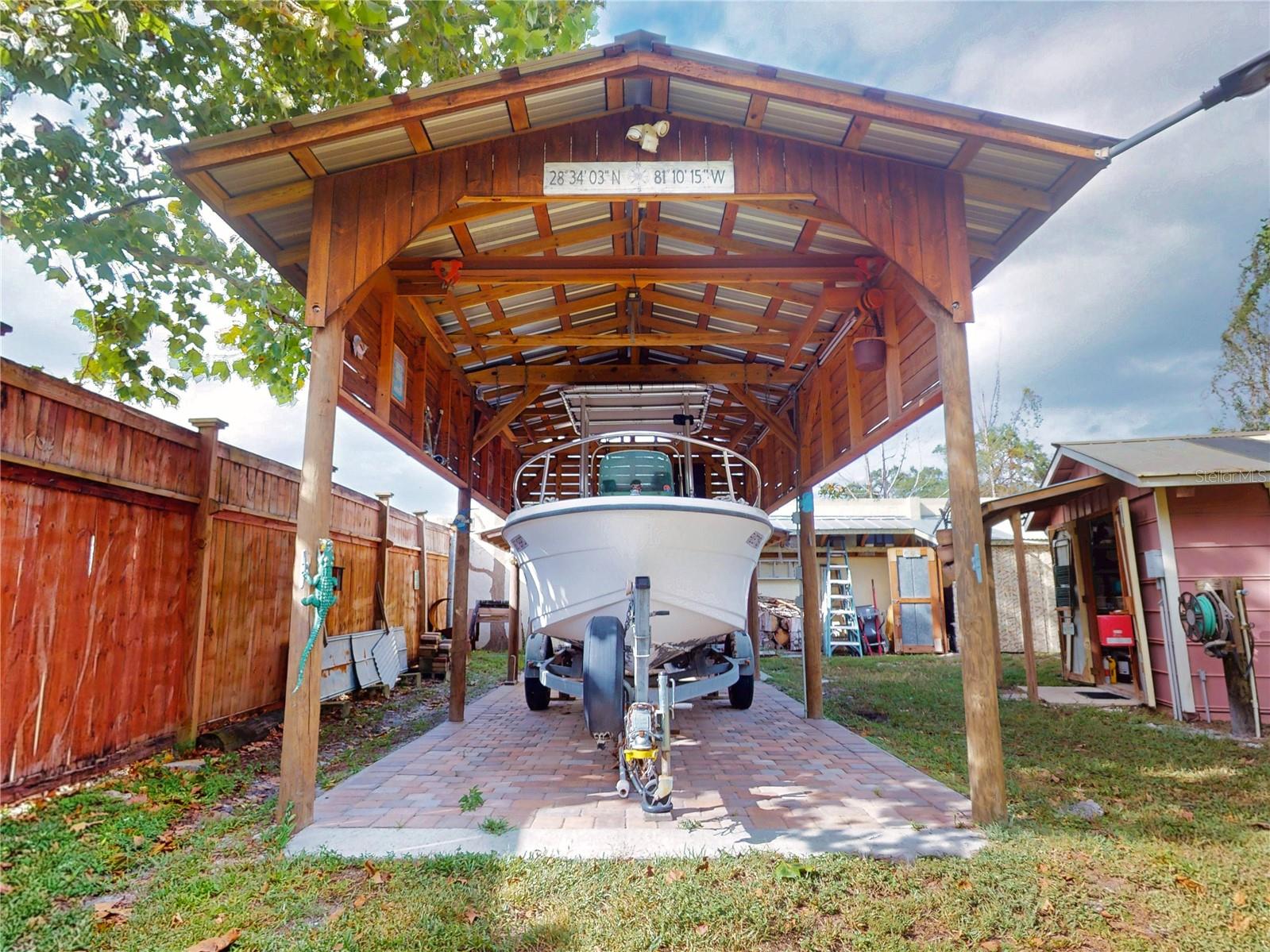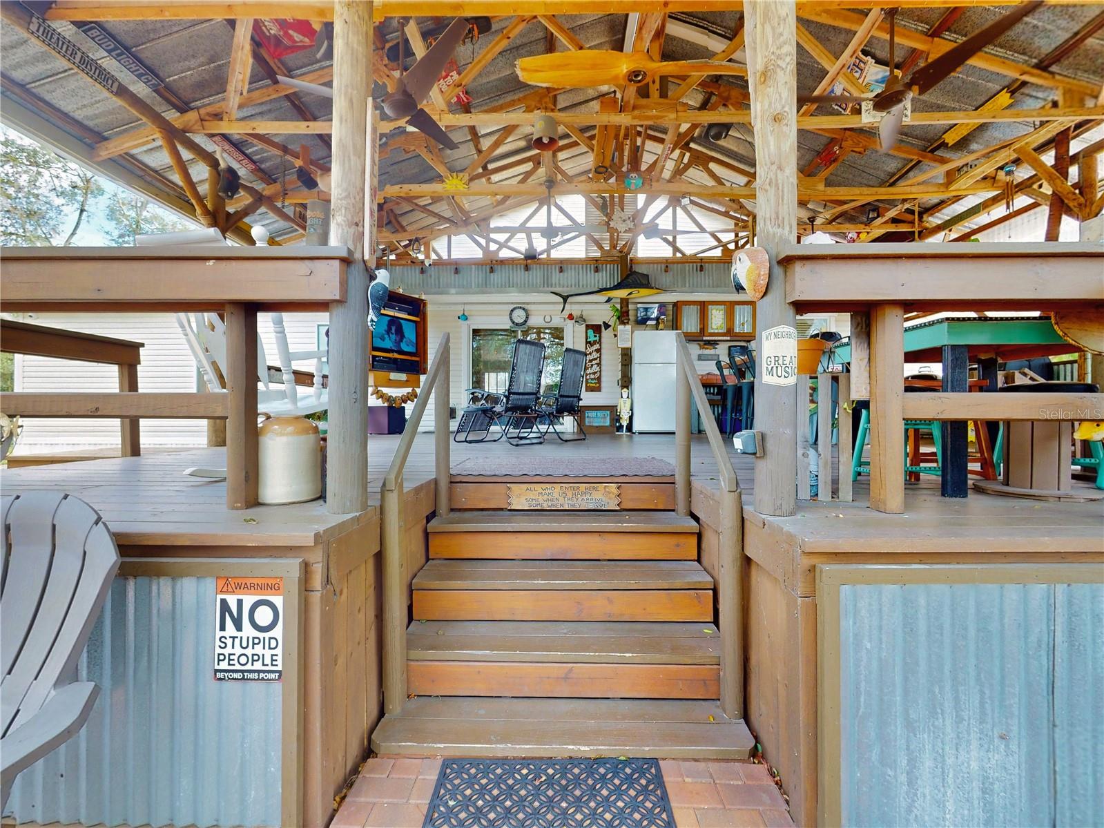 Escape to your own private retreat on a quiet dead-end dirt road. This unique property offers a rare combination of privacy, outdoor luxury, and versatile living spaces. The centerpiece is a spacious 24' x 24' entertainment deck featuring cook top stove and sink, can easily add a refrigerator for a full kitchen, outdoor sound system, outdoor TV—perfect for hosting gatherings year-round. Just off the deck, you'll find a beautifully designed brick-paver patio with a custom fire pit and tranquil waterfall, creating a serene outdoor ambiance. A large outdoor bathroom with a double shower adds convenience and comfort for guests. Two climate-controlled workshops, with the largest equipped with air conditioning, heating, and a TV. Ideal space for hobbies, crafts, or additional storage. The property also includes a tiki hut, covered parking for an RV or boat, a carport for your personal vehicle, and additional storage space beneath the deck. Dual gate entrances form a full U-shaped driveway, enhancing both accessibility and security. A comprehensive surveillance system with 9 cameras ensures peace of mind. Roof replaced in 2024. This 2002 Palm Harbor Talladega model featuring a split floor plan, crown molding, tile and laminate plank flooring, an eat-in kitchen, formal dining room, and a spacious living room with a built-in sound system. An indoor laundry room adds convenience, and hurricane shutters provide added protection. The property is serviced by a private well and septic system, with a triple-filtration water system ensuring clean water throughout the home. Additional storage outside available under the large deck out back. This retreat is one of a kind, call today to set up a private showing.
