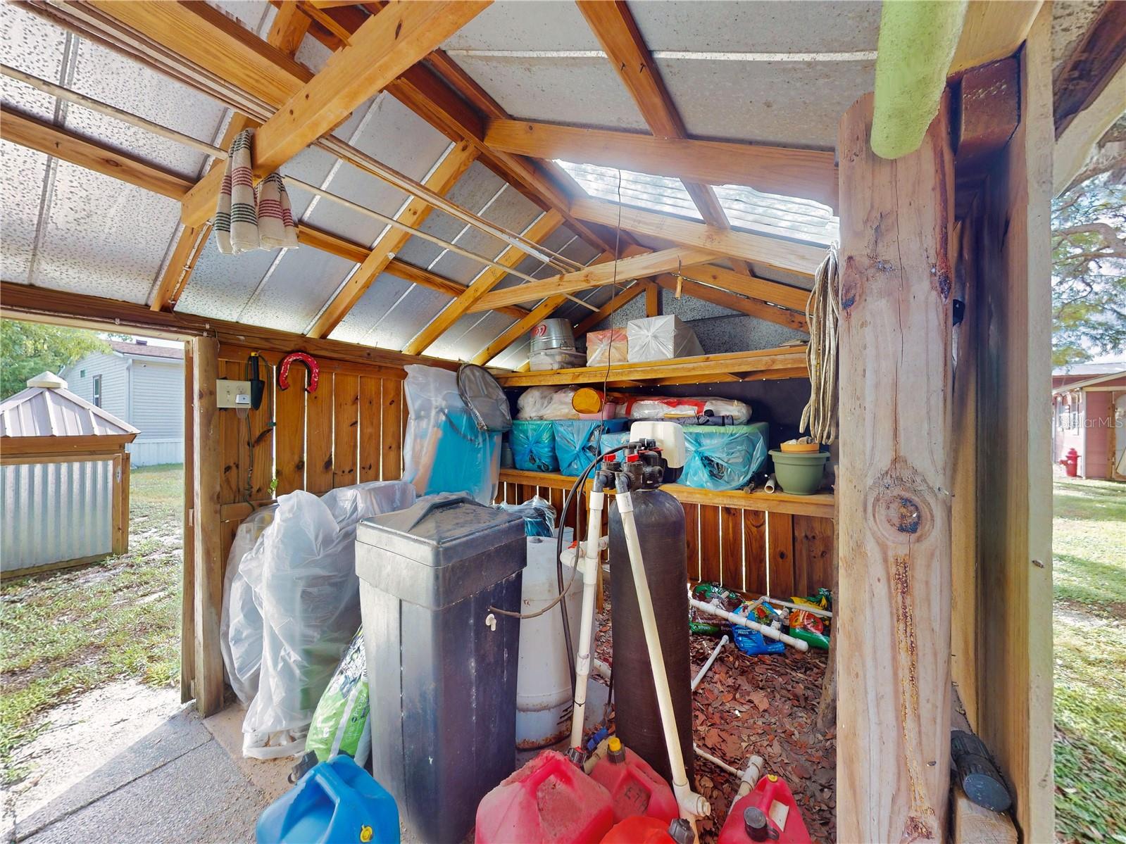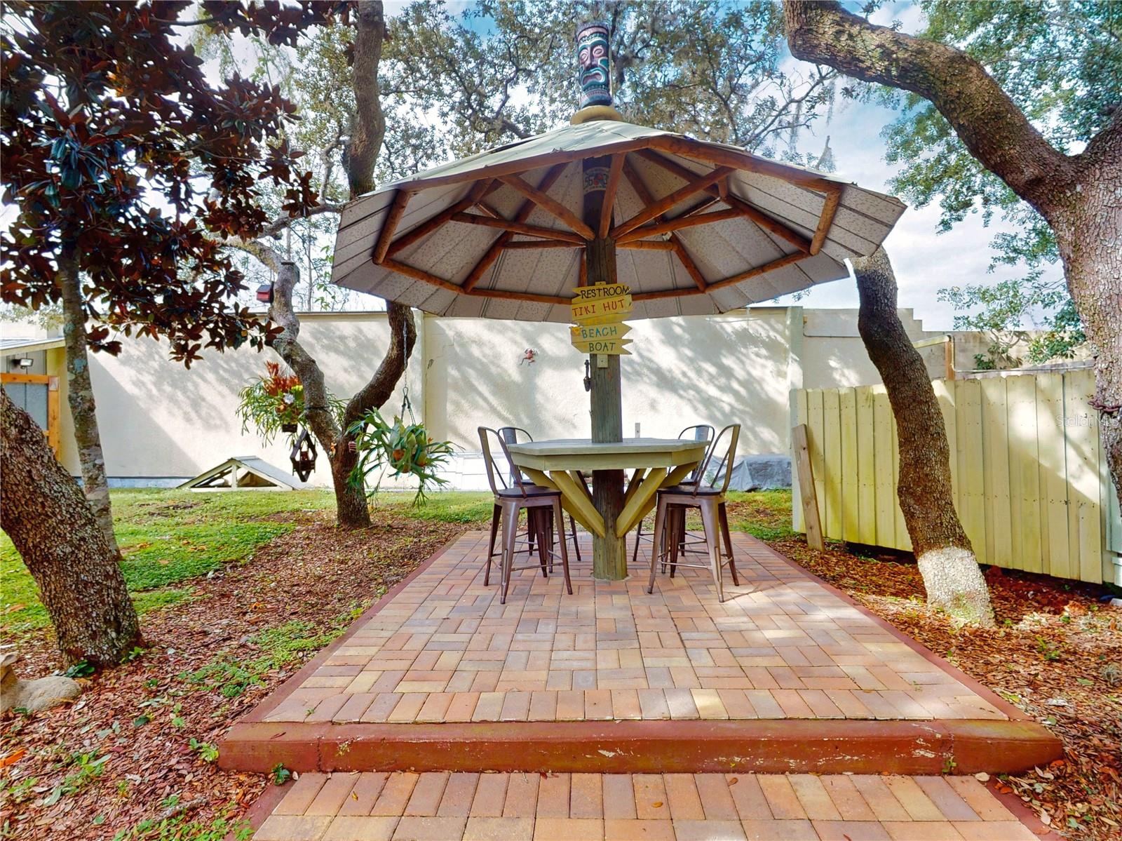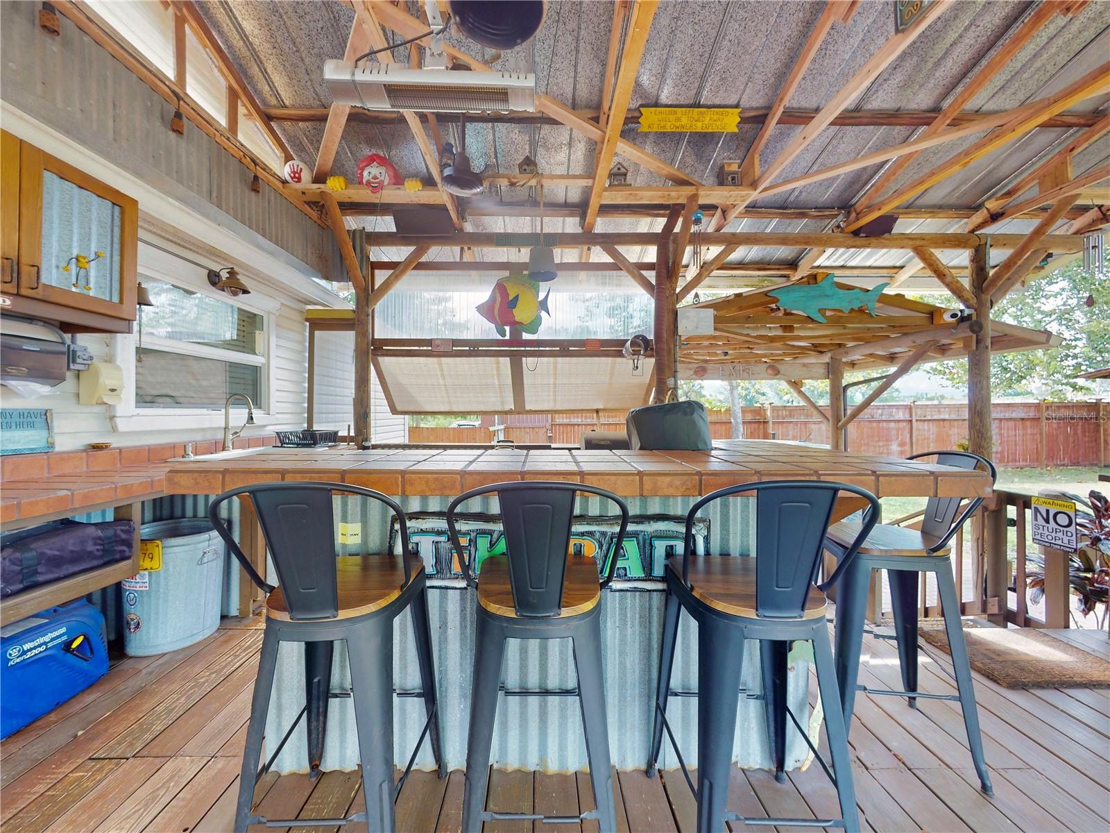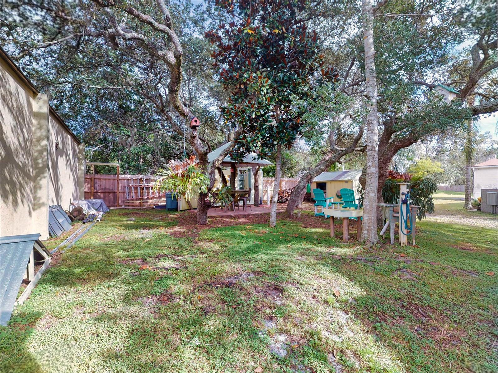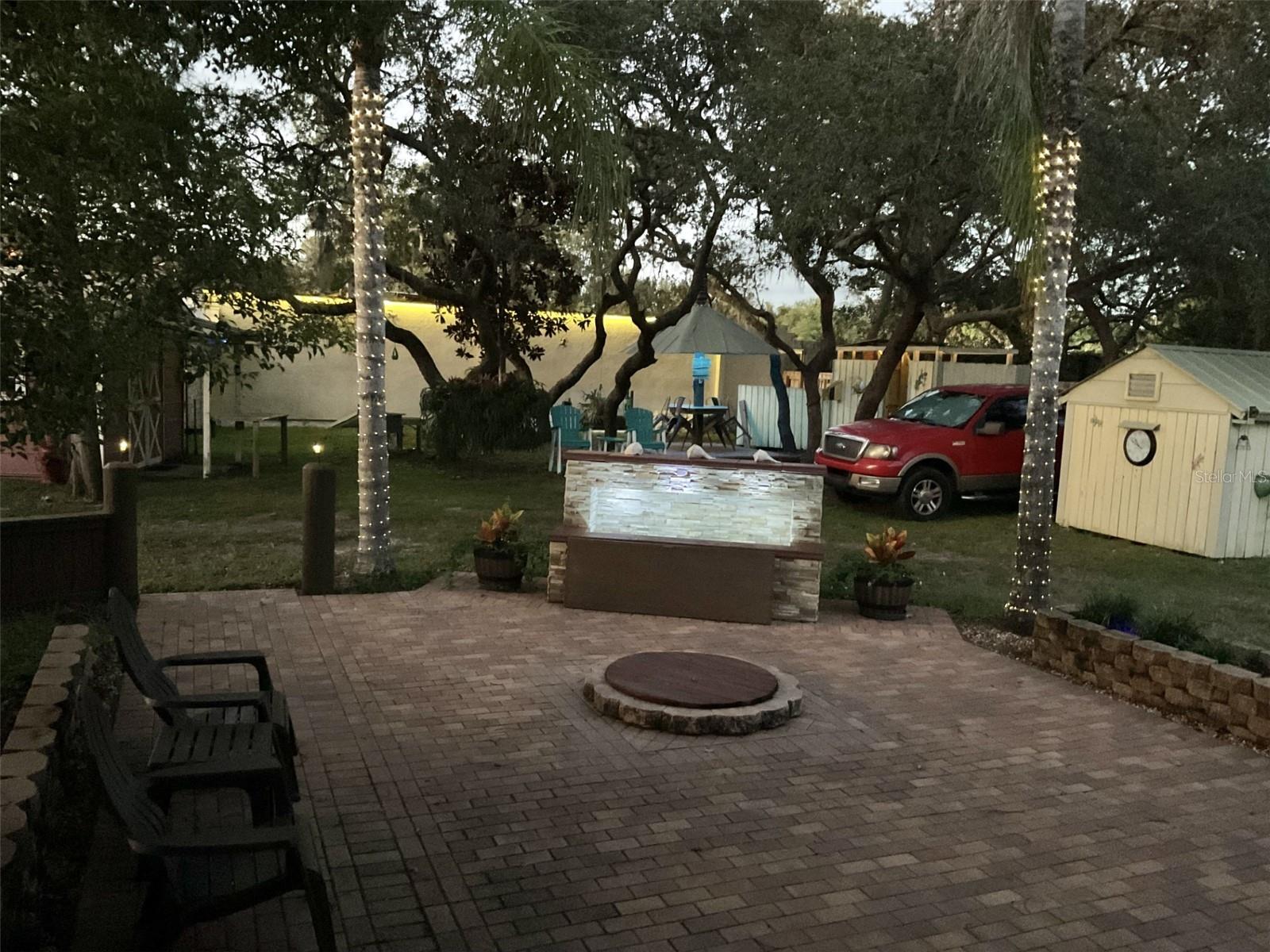 Escape to your own private retreat on a quiet dead-end dirt road. This unique property offers a rare combination of privacy, outdoor luxury, and versatile living spaces. The centerpiece is a spacious 24' x 24' entertainment deck featuring cook top stove and sink, can easily add a refrigerator for a full kitchen, outdoor sound system, outdoor TV—perfect for hosting gatherings year-round. Just off the deck, you'll find a beautifully designed brick-paver patio with a custom fire pit and tranquil waterfall, creating a serene outdoor ambiance. A large outdoor bathroom with a double shower adds convenience and comfort for guests. Two climate-controlled workshops, with the largest equipped with air conditioning, heating, and a TV. Ideal space for hobbies, crafts, or additional storage. The property also includes a tiki hut, covered parking for an RV or boat, a carport for your personal vehicle, and additional storage space beneath the deck. Dual gate entrances form a full U-shaped driveway, enhancing both accessibility and security. A comprehensive surveillance system with 9 cameras ensures peace of mind. Roof replaced in 2024. This 2002 Palm Harbor Talladega model featuring a split floor plan, crown molding, tile and laminate plank flooring, an eat-in kitchen, formal dining room, and a spacious living room with a built-in sound system. An indoor laundry room adds convenience, and hurricane shutters provide added protection. The property is serviced by a private well and septic system, with a triple-filtration water system ensuring clean water throughout the home. Additional storage outside available under the large deck out back. This retreat is one of a kind, call today to set up a private showing.