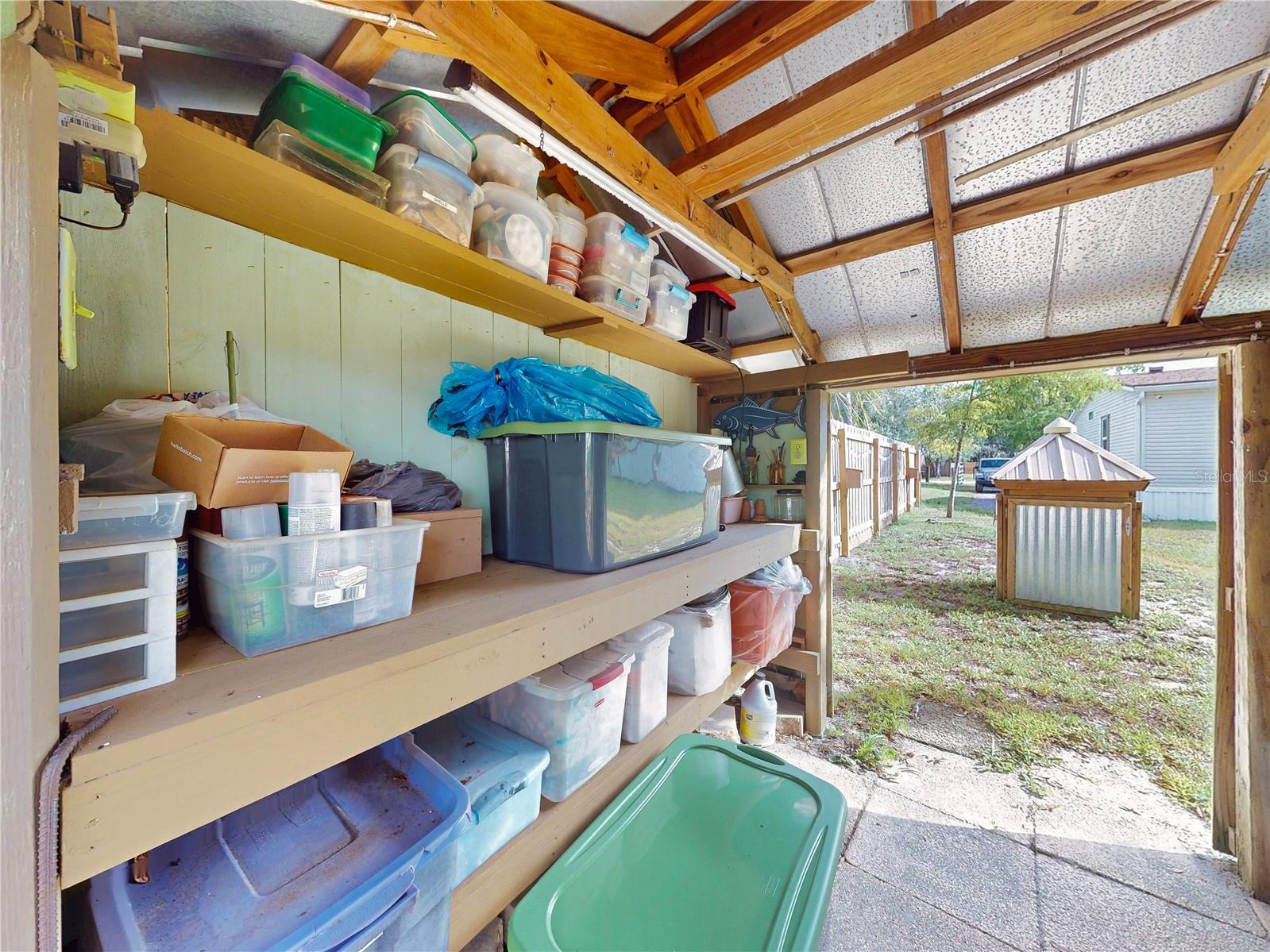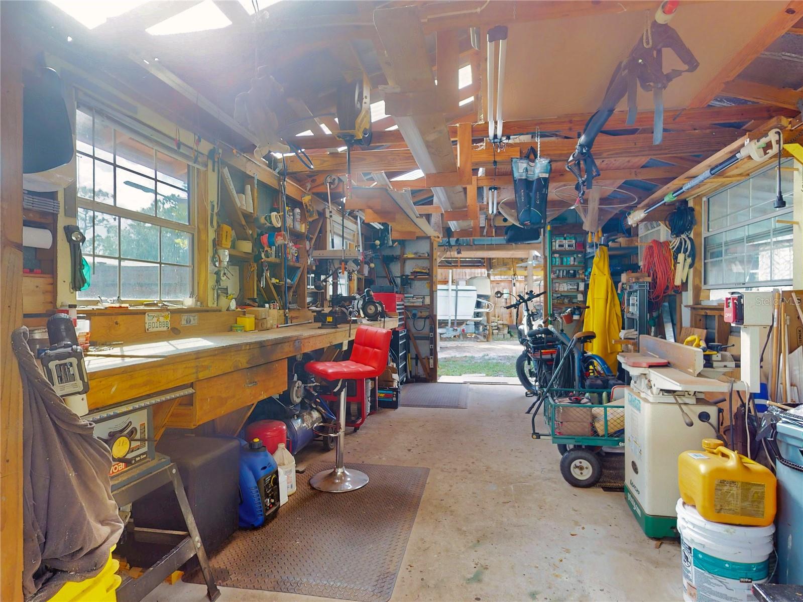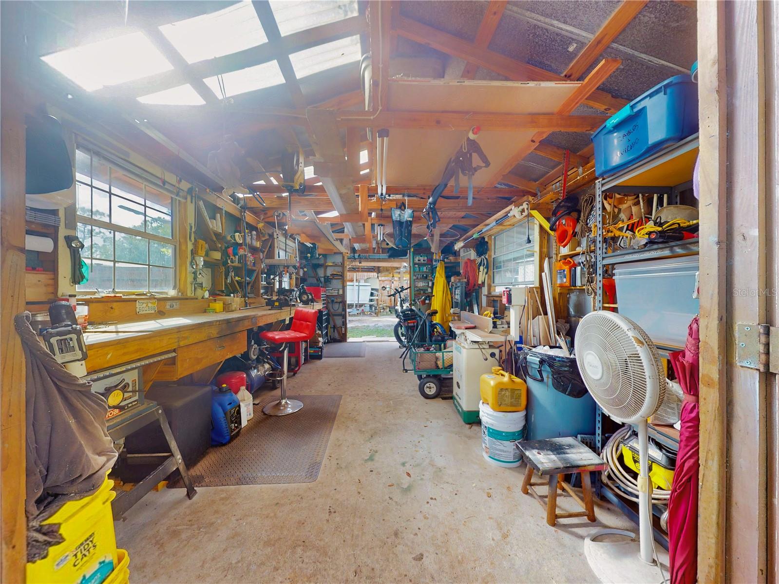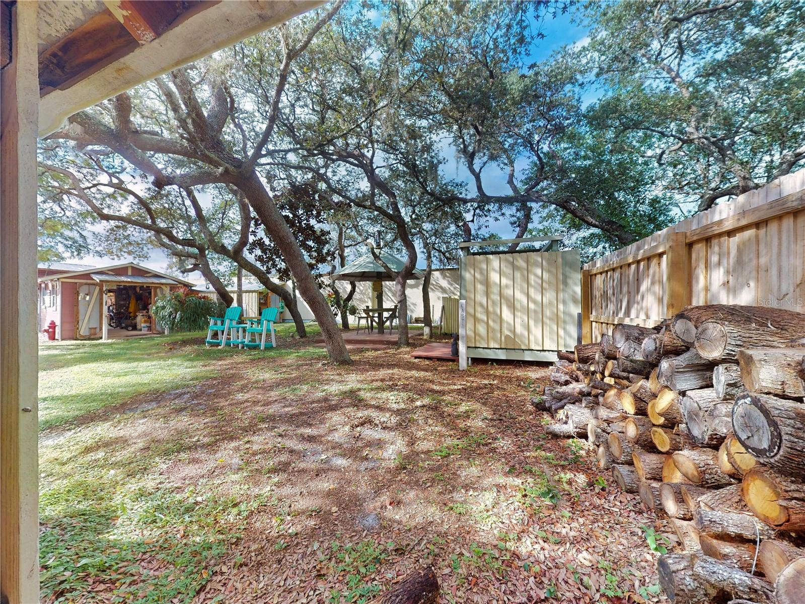 Escape to your own private retreat on a quiet dead-end dirt road. This unique property offers a rare combination of privacy, outdoor luxury, and versatile living spaces. The centerpiece is a spacious 24' x 24' entertainment deck featuring cook top stove and sink, can easily add a refrigerator for a full kitchen, outdoor sound system, outdoor TV—perfect for hosting gatherings year-round. Just off the deck, you'll find a beautifully designed brick-paver patio with a custom fire pit and tranquil waterfall, creating a serene outdoor ambiance. A large outdoor bathroom with a double shower adds convenience and comfort for guests. Two climate-controlled workshops, with the largest equipped with air conditioning, heating, and a TV. Ideal space for hobbies, crafts, or additional storage. The property also includes a tiki hut, covered parking for an RV or boat, a carport for your personal vehicle, and additional storage space beneath the deck. Dual gate entrances form a full U-shaped driveway, enhancing both accessibility and security. A comprehensive surveillance system with 9 cameras ensures peace of mind. Roof replaced in 2024. This 2002 Palm Harbor Talladega model featuring a split floor plan, crown molding, tile and laminate plank flooring, an eat-in kitchen, formal dining room, and a spacious living room with a built-in sound system. An indoor laundry room adds convenience, and hurricane shutters provide added protection. The property is serviced by a private well and septic system, with a triple-filtration water system ensuring clean water throughout the home. Additional storage outside available under the large deck out back. This retreat is one of a kind, call today to set up a private showing.