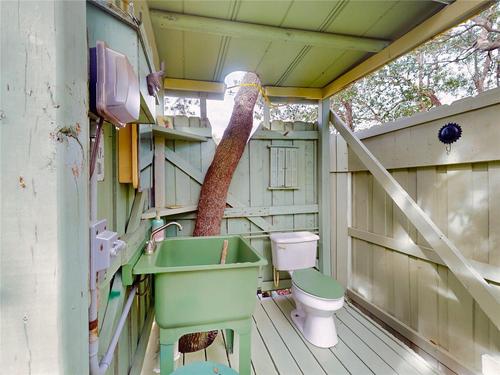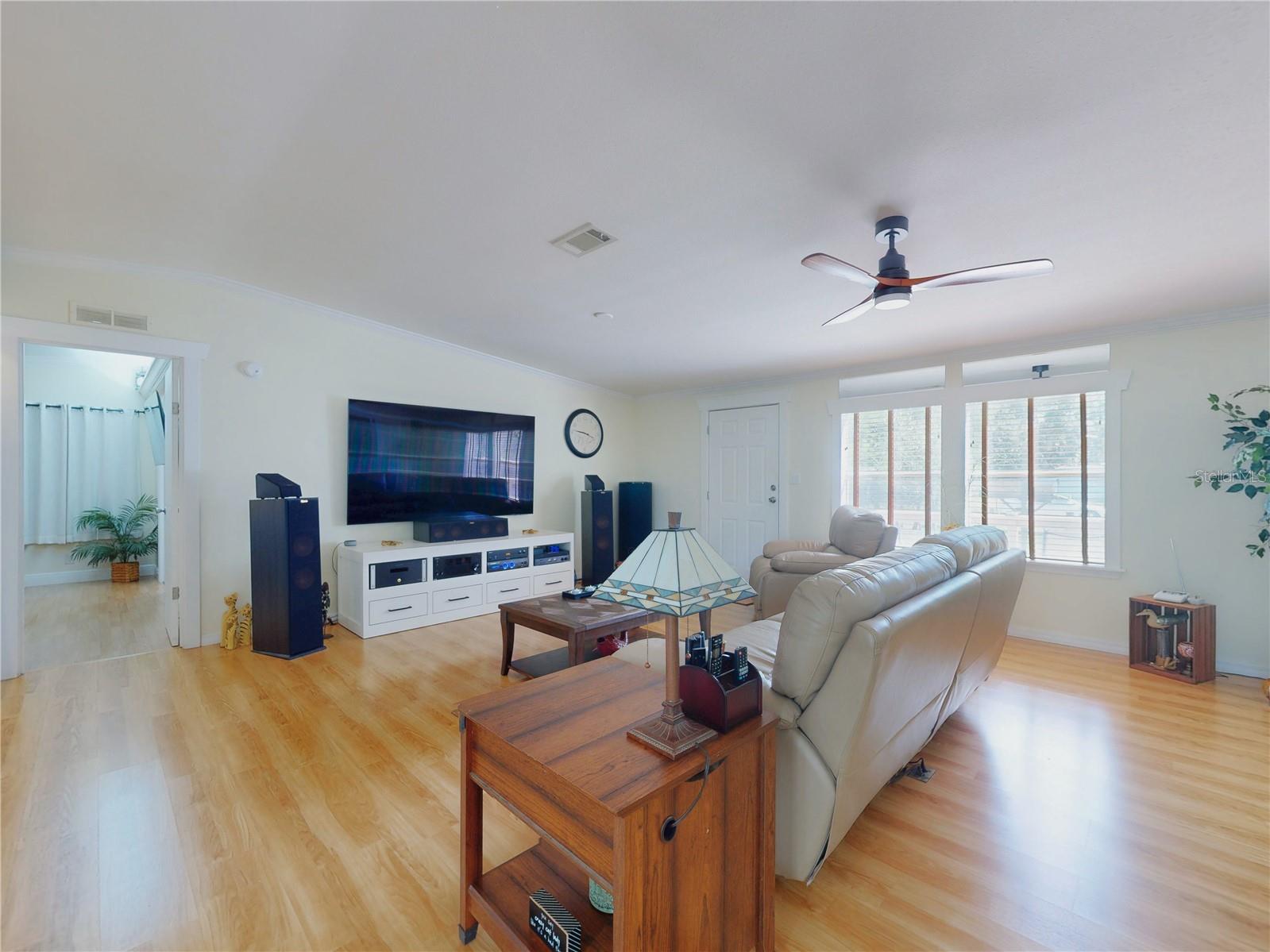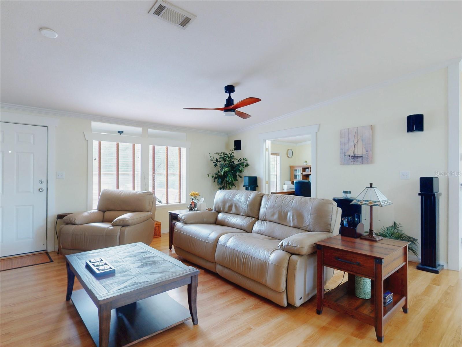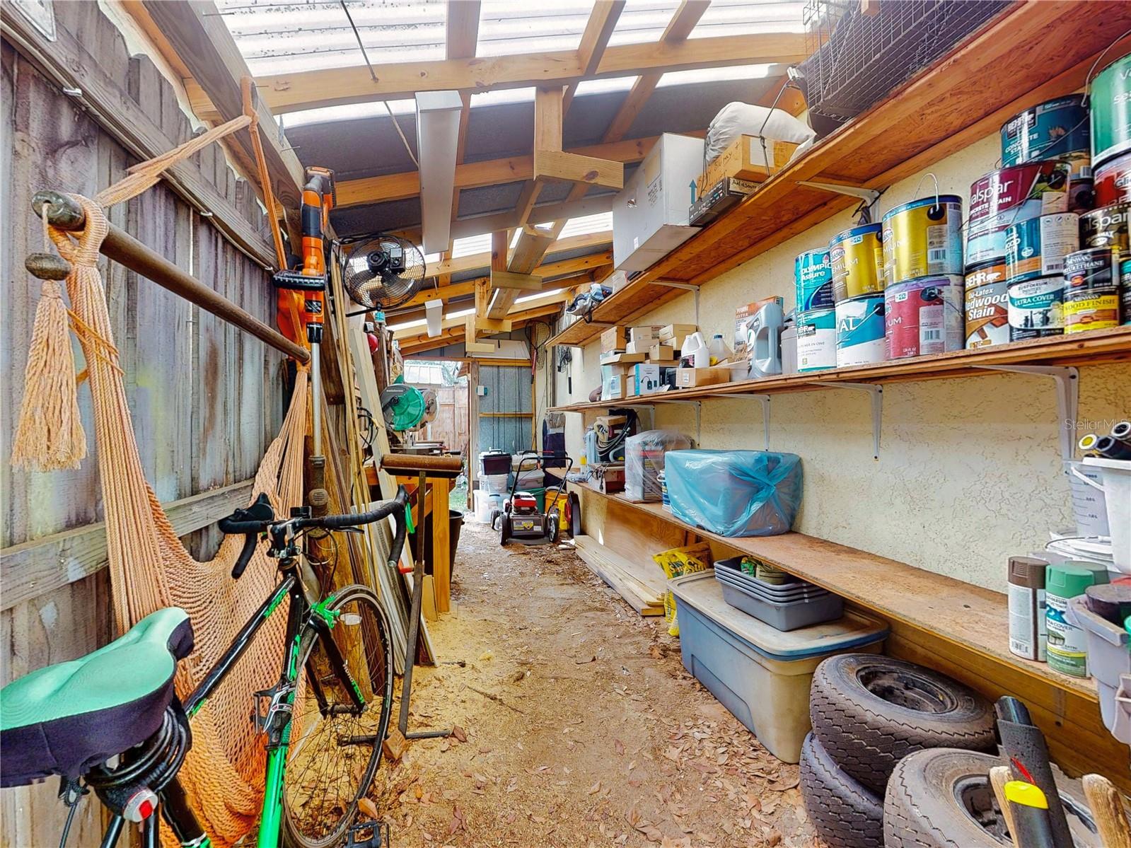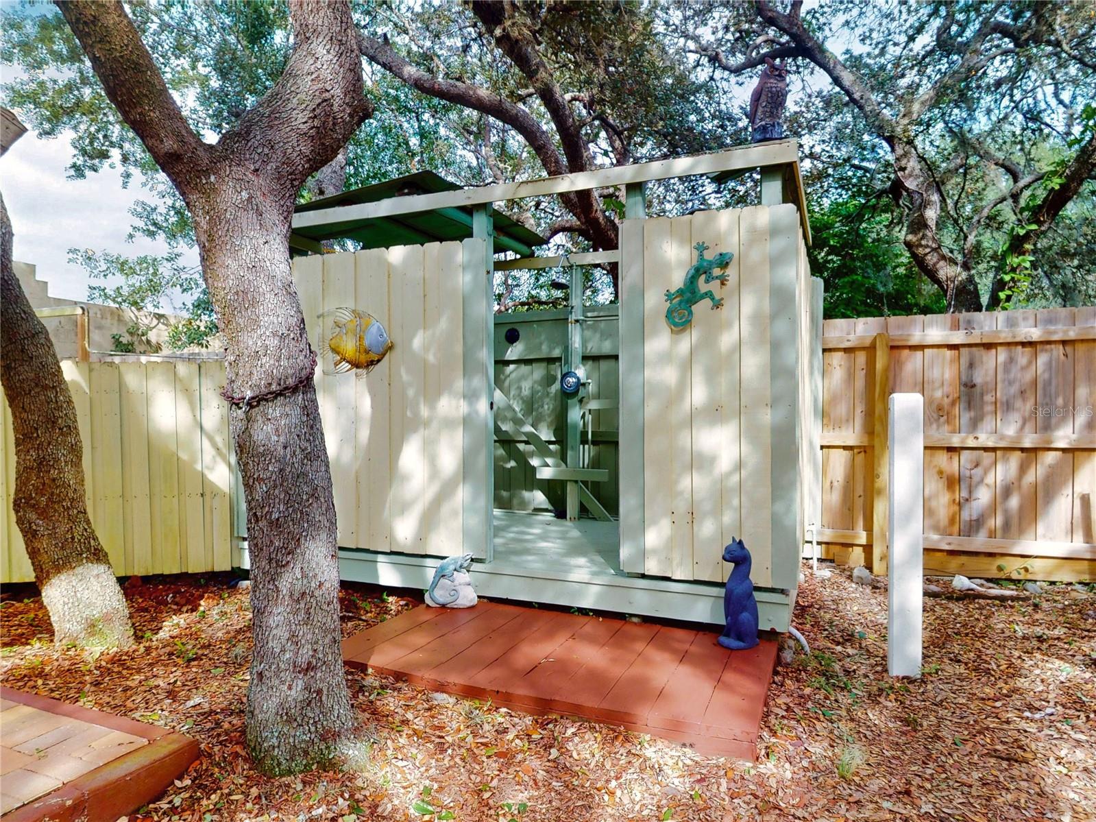 Escape to your own private retreat on a quiet dead-end dirt road. This unique property offers a rare combination of privacy, outdoor luxury, and versatile living spaces. The centerpiece is a spacious 24' x 24' entertainment deck featuring cook top stove and sink, can easily add a refrigerator for a full kitchen, outdoor sound system, outdoor TV—perfect for hosting gatherings year-round. Just off the deck, you'll find a beautifully designed brick-paver patio with a custom fire pit and tranquil waterfall, creating a serene outdoor ambiance. A large outdoor bathroom with a double shower adds convenience and comfort for guests. Two climate-controlled workshops, with the largest equipped with air conditioning, heating, and a TV. Ideal space for hobbies, crafts, or additional storage. The property also includes a tiki hut, covered parking for an RV or boat, a carport for your personal vehicle, and additional storage space beneath the deck. Dual gate entrances form a full U-shaped driveway, enhancing both accessibility and security. A comprehensive surveillance system with 9 cameras ensures peace of mind. Roof replaced in 2024. This 2002 Palm Harbor Talladega model featuring a split floor plan, crown molding, tile and laminate plank flooring, an eat-in kitchen, formal dining room, and a spacious living room with a built-in sound system. An indoor laundry room adds convenience, and hurricane shutters provide added protection. The property is serviced by a private well and septic system, with a triple-filtration water system ensuring clean water throughout the home. Additional storage outside available under the large deck out back. This retreat is one of a kind, call today to set up a private showing.