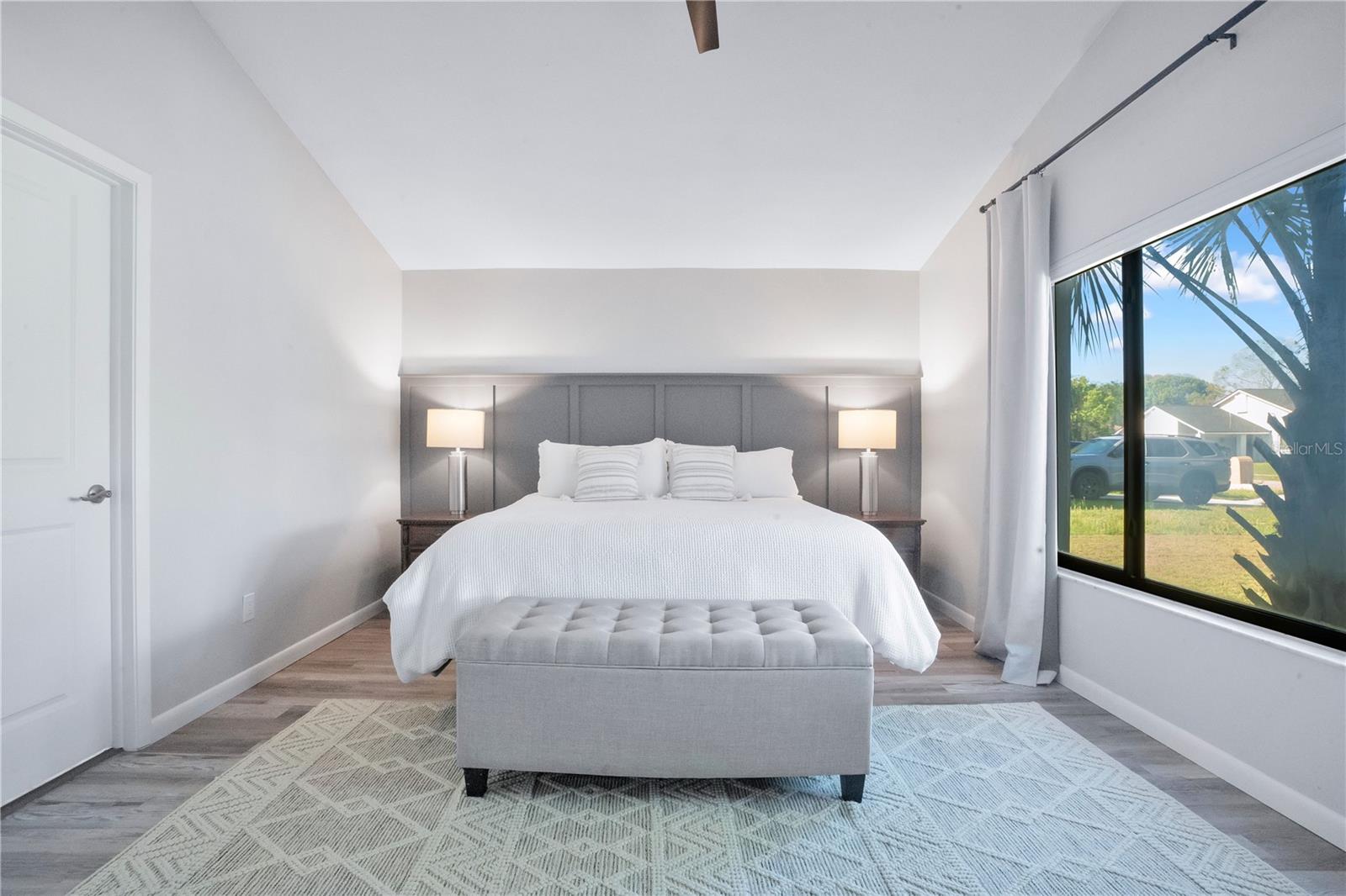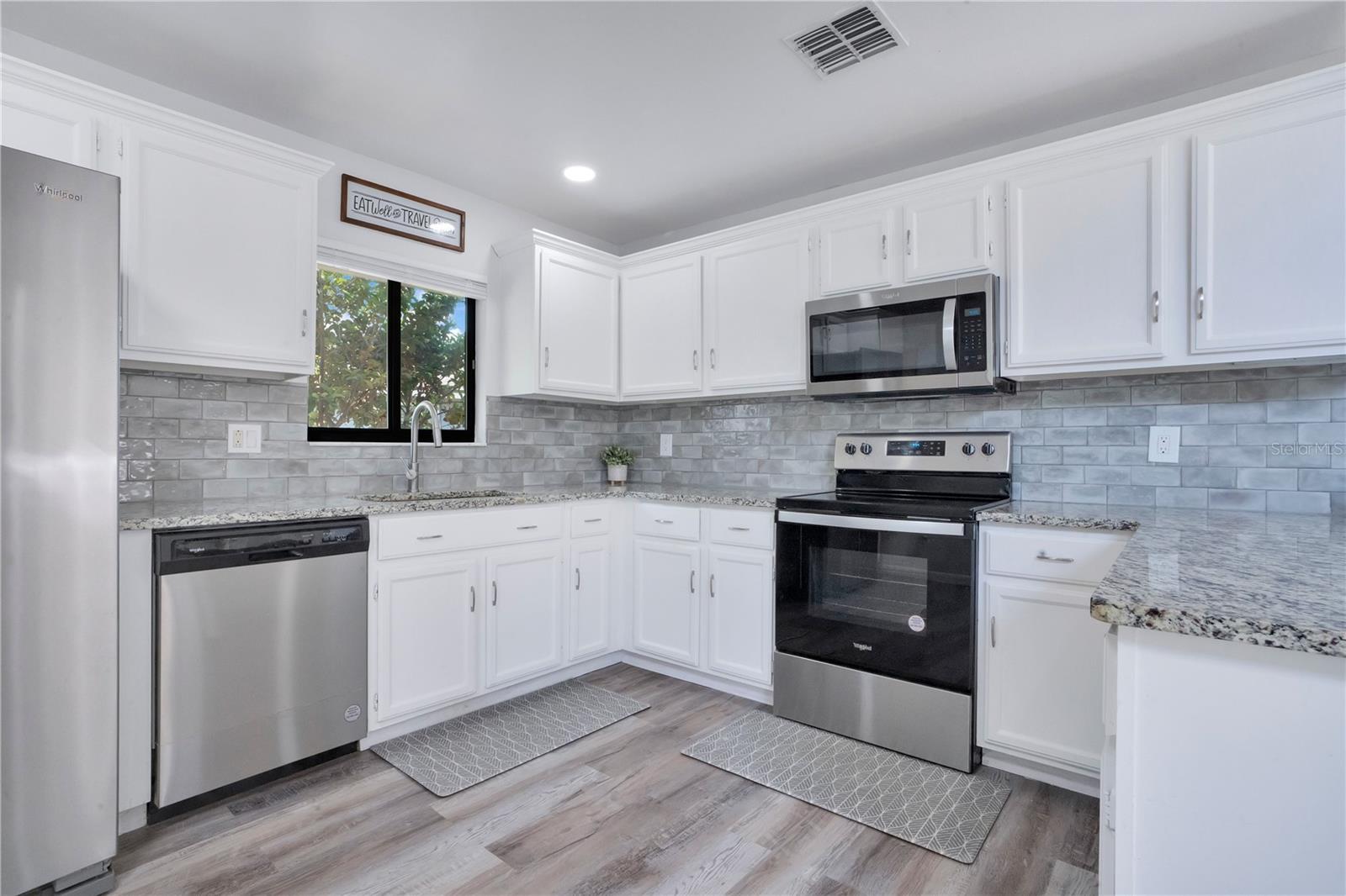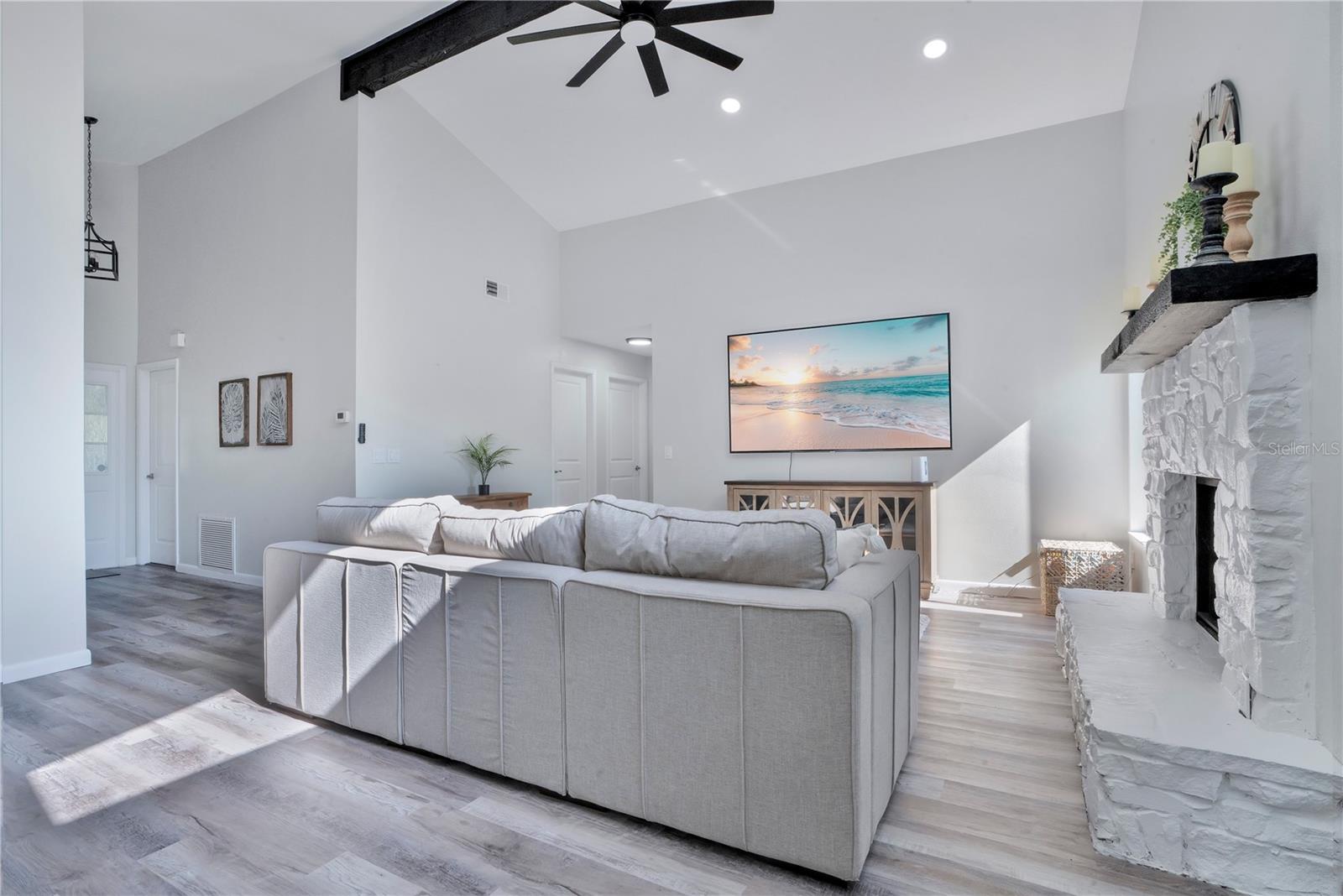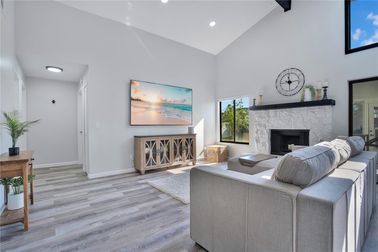 Welcome to this charming, UPDATED and character-filled 3-bedroom, 2-bath home. From the moment you step onto the covered porch and enter, you’re greeted by an open floor plan with vinyl floors (no carpet) bathed in natural light. A soaring vaulted ceiling crowns the family room, where a striking wood beam and a wood-burning fireplace create a cozy focal point. This space opens seamlessly into a beautifully updated kitchen, featuring stainless steel appliances, granite countertops, and tile backsplash. There’s ample space for a dining table, plus a raised breakfast bar for casual seating. The primary bedroom offers a peaceful retreat, complete with a walk-in closet and custom built-ins. Both renovated bathrooms exude modern elegance, with new fixtures, lighting, and sleek tile floors. An expansive Florida room—over 330 square feet—offers a versatile bonus space, NOT counted in the square footage. Step right out back to watch rocket launches! You’ll love the convenience of an indoor laundry room (W&D included) with built-in cabinets as well as a large, fully fenced backyard—ideal for pets, play, or entertaining. The two-car garage features an epoxy floor and a workbench for added convenience. Garage door opener replaced after 2020 and My Q technology and video keypad added in 2025 for remote access and monitoring. An OPTIONAL HOA is available for just $50 a year, if you choose to join. Nestled right in the community, the Wedgefield Golf Club awaits, with an exceptional 18-hole, par-72 course that blends challenge and beauty. Outdoor lovers will adore the nearby Hal Scott Nature Preserve—over 9,000 acres for hiking, fishing, horseback riding, and more. The Orlando MX and Orlando Speedworld are minutes away with the Snow Hill Mountain bike trails about 20 min away. And with just a 30-minute commute to downtown Orlando, or a short drive to the beaches in Cocoa and Melbourne, you’ll have the best of both worlds. Don’t miss out on this unique, inviting oasis! Roof 2016, hot water heater 2018, and HVAC 2012—come see for yourself!