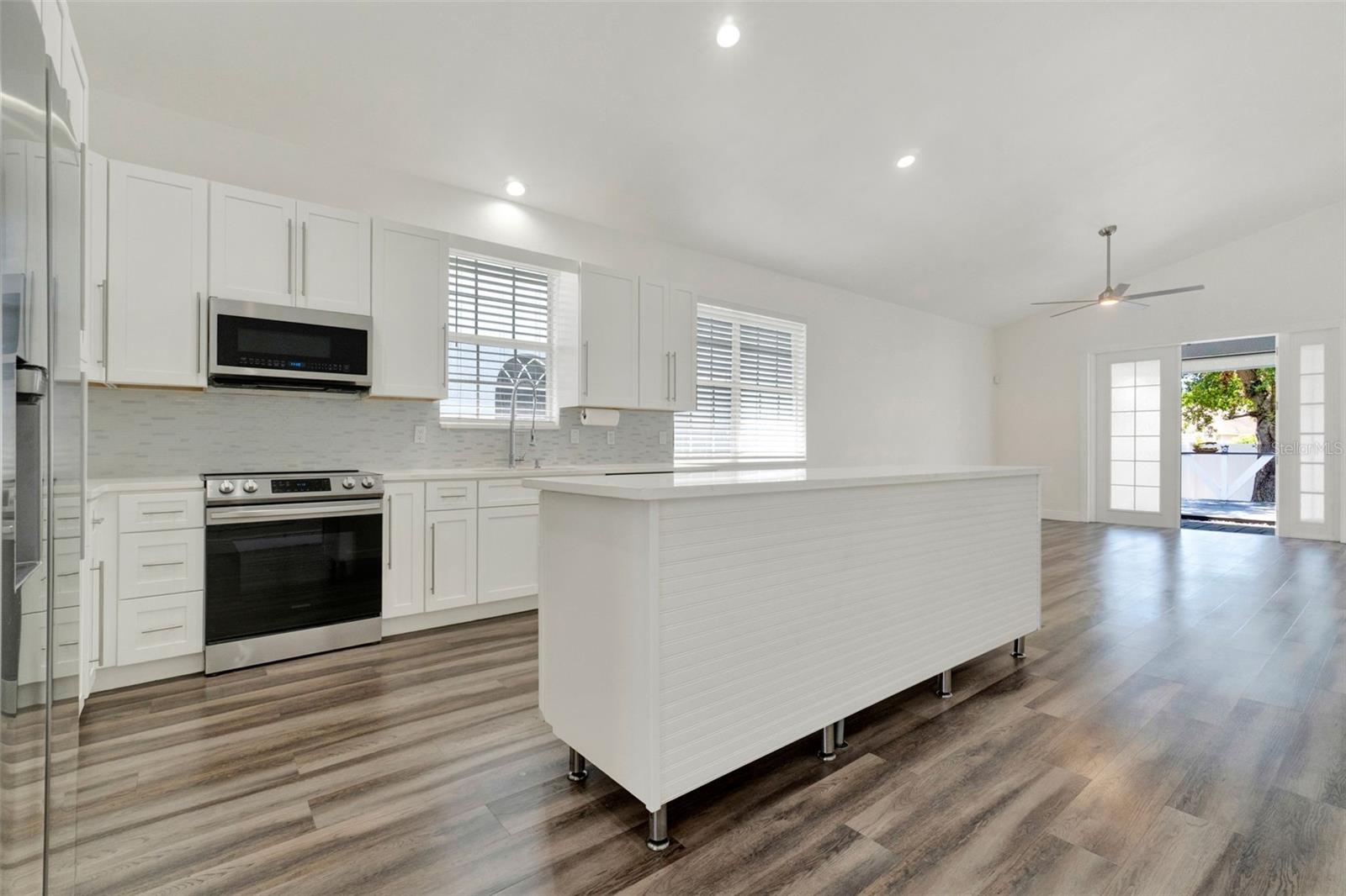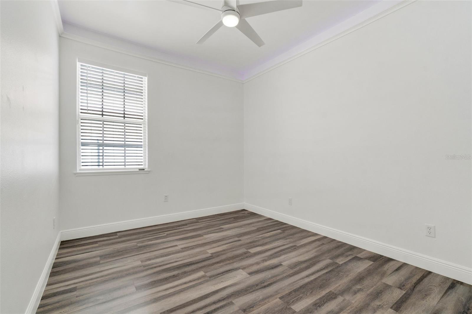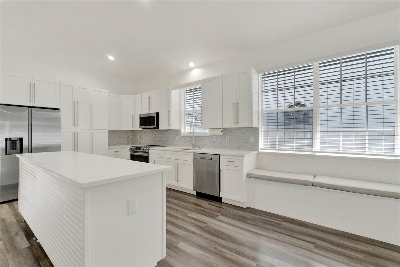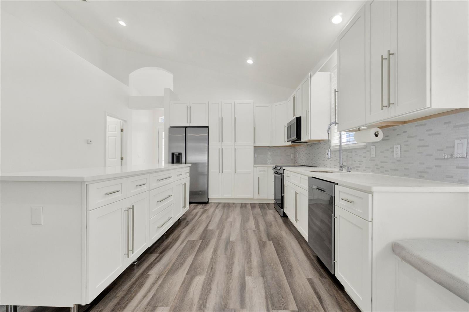 Welcome to this beautifully updated four-bedroom, two-bath home with luxury vinyl flooring throughout and a bright, open layout. The kitchen is a standout, featuring stainless steel appliances, quartz countertops, and plenty of space for cooking and entertaining. The master suite offers a spacious walk-in closet, dual vanities, a soaking tub, a separate shower with dual shower heads, and elegant French doors leading to the bathroom. Two guest bedrooms are accented with crown molding and LED lighting, while the updated guest bathroom showcases stylish tilework. French doors from the living area open to a welcoming porch, perfect for relaxing or hosting guests. Additional highlights include upgraded ceiling lights, a washer and dryer, a new tankless water heater (2024), a newer roof (2023), and a newer AC system (2023). This move-in ready home is in a fantastic location, just minutes from the airport and close to all the shopping, dining, and attractions Orlando has.