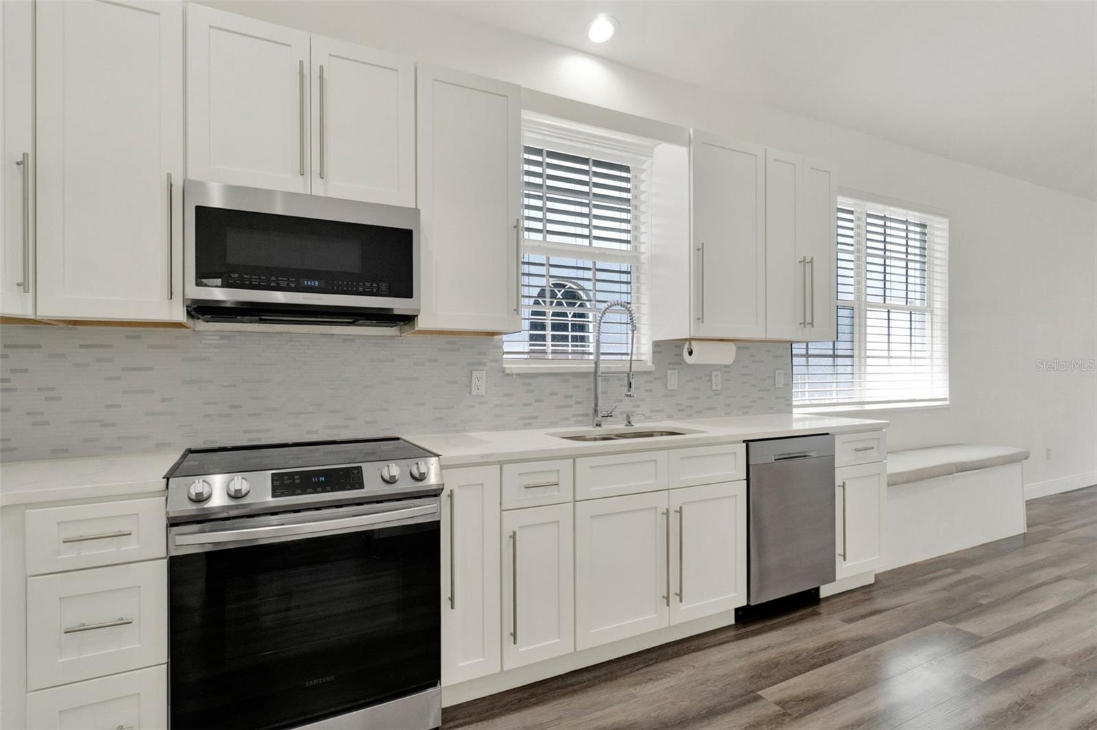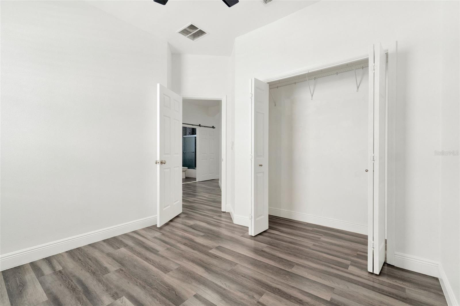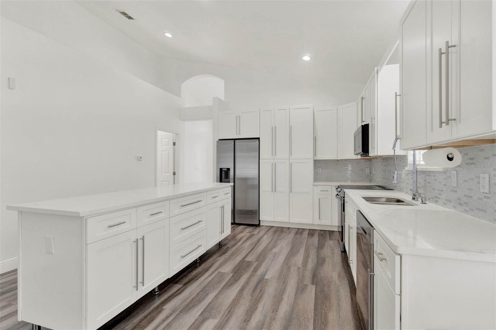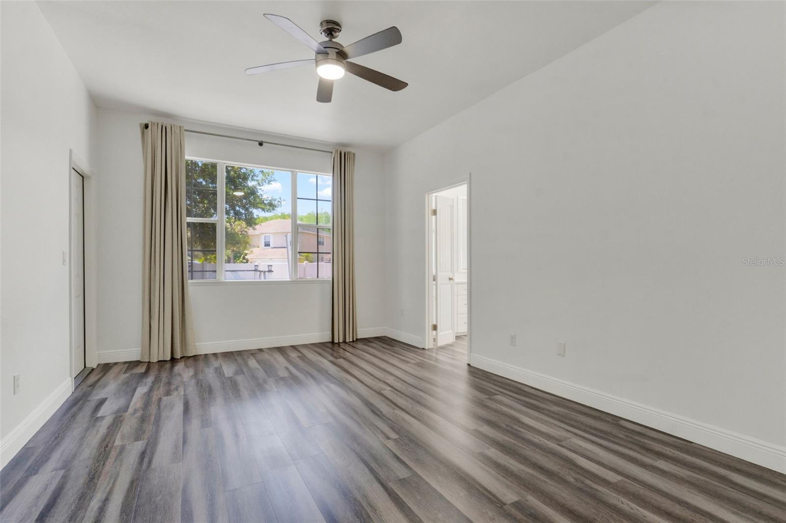 Welcome to this beautifully updated four-bedroom, two-bath home with luxury vinyl flooring throughout and a bright, open layout. The kitchen is a standout, featuring stainless steel appliances, quartz countertops, and plenty of space for cooking and entertaining. The master suite offers a spacious walk-in closet, dual vanities, a soaking tub, a separate shower with dual shower heads, and elegant French doors leading to the bathroom. Two guest bedrooms are accented with crown molding and LED lighting, while the updated guest bathroom showcases stylish tilework. French doors from the living area open to a welcoming porch, perfect for relaxing or hosting guests. Additional highlights include upgraded ceiling lights, a washer and dryer, a new tankless water heater (2024), a newer roof (2023), and a newer AC system (2023). This move-in ready home is in a fantastic location, just minutes from the airport and close to all the shopping, dining, and attractions Orlando has.