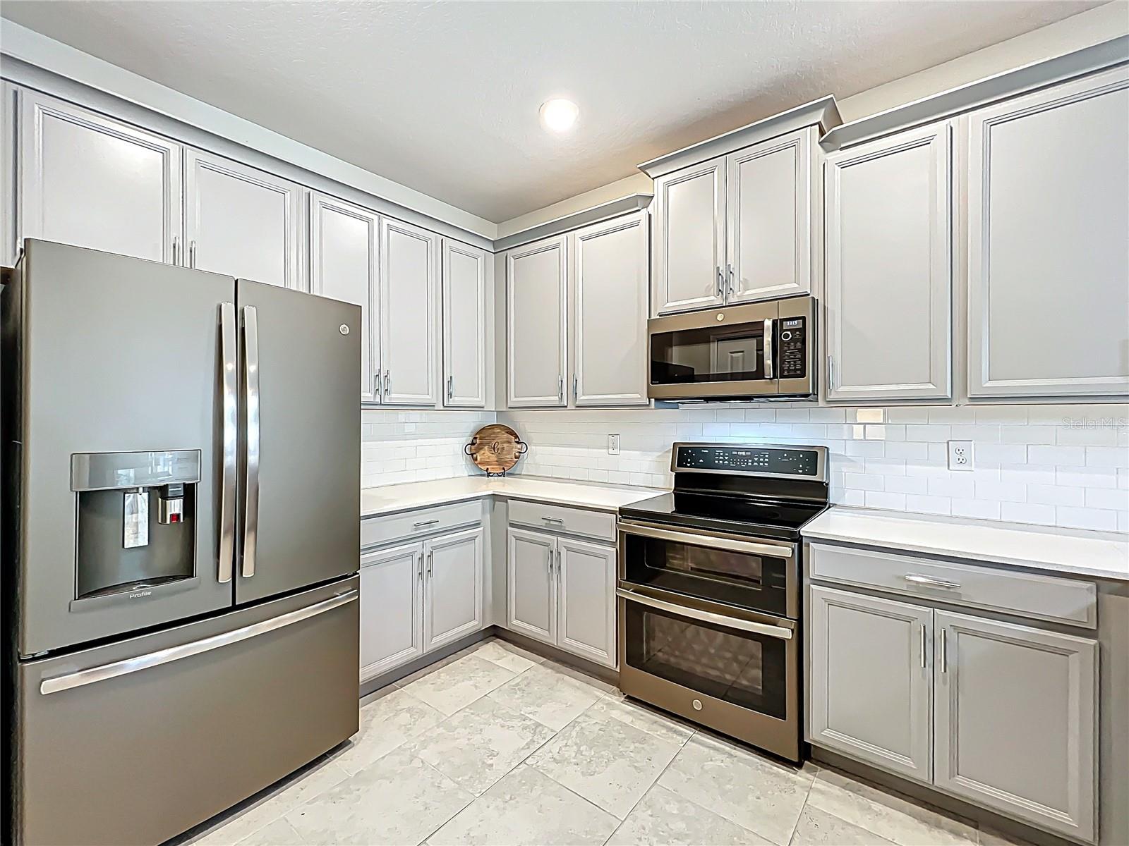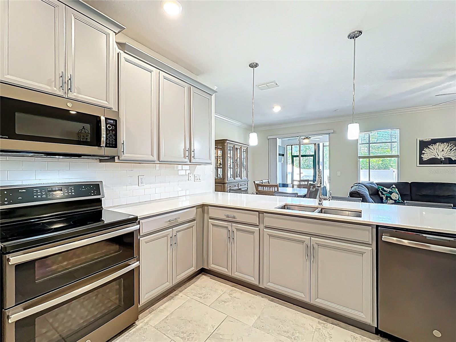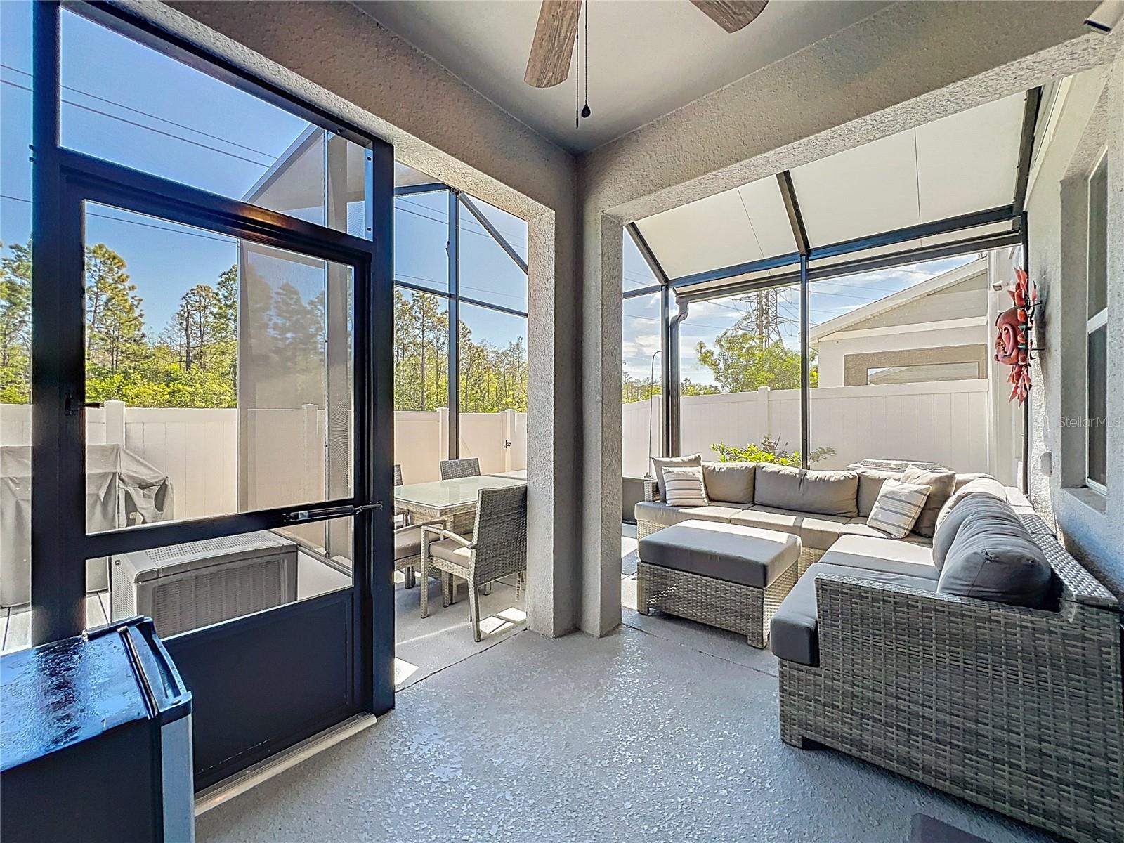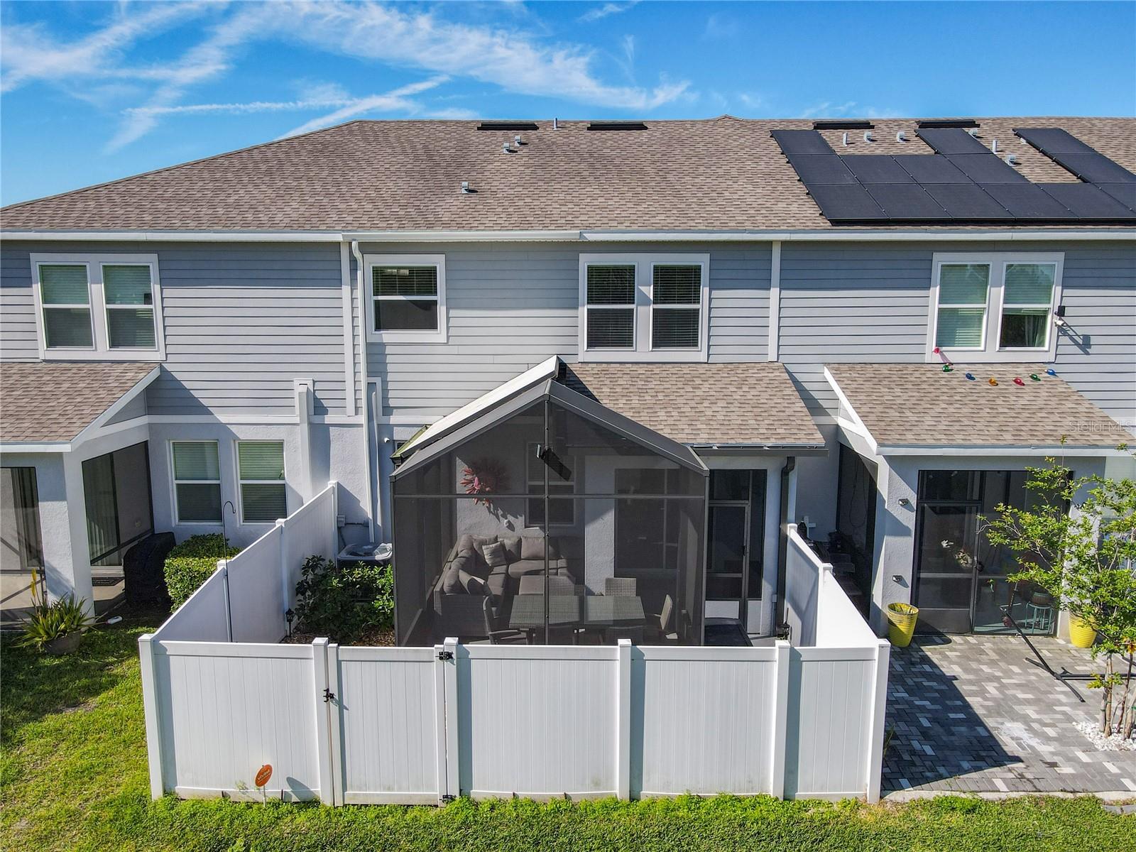 FENCED YARD. EXTENDED SCREEN PORCH. This 3-bedroom, 2.5-bath townhome offers a rare combination of privacy and outdoor living that sets it apart from the rest of the townhouses in this community. It’s the only townhome with a fully fenced-in backyard, ideal for pets or gardening AND the extended screened-in porch creates an outdoor living space. Inside, the open floor plan features a bright living area with light ceramic tile floors throughout the first level. The chef in the family will appreciate a large kitchen with an abundance of cabinets, quartz countertops, tiled backsplash, pantry closet, upgraded stainless steel appliances including a double oven range, microwave/convection combo, and refrigerator with a Keurig. The living and dining room combo is very spacious . A half bath and a 2-car garage with 3 storage racks completes the first floor. Continue upstairs to the generously sized primary suite, offering a comfortable layout that easily accommodates a king bed and additional furnishings. The ensuite bathroom is thoughtfully designed and features dual sinks on a wide vanity, a tiled walk-in shower, and a separate soaking tub—perfect for unwinding after a long day. A large walk-in closet completes the suite, offering abundant storage and organization space. Two additional bedrooms are roomy and share a second full bathroom. There is a laundry ROOM (not a laundry closet) upstairs as well. Notable special features that sets this home apart is crown molding throughout, a whole house water softener/purification system, added storage with the 3 ceiling racks in the garage, the additional living space in the screened room and extra privacy with a wooded view in the back. The Sawgrass Plantation community has an abundance of amenities including a clubhouse, pool, tennis courts, basketball courts, soccer field, dog park, 3 playgrounds, community park with bbq grills, walking trail, picnic areas and plenty of green space throughout. LOCATION is key and this one has it! Orlando International Airport, Amazon warehouse, multiple supermarkets, shopping, area theme parks, attractions and golf are all a short distance away. East coast beaches and Cape Canaveral are just about an hour away adding another special bonus as you can watch the rocket launches from your back yard!