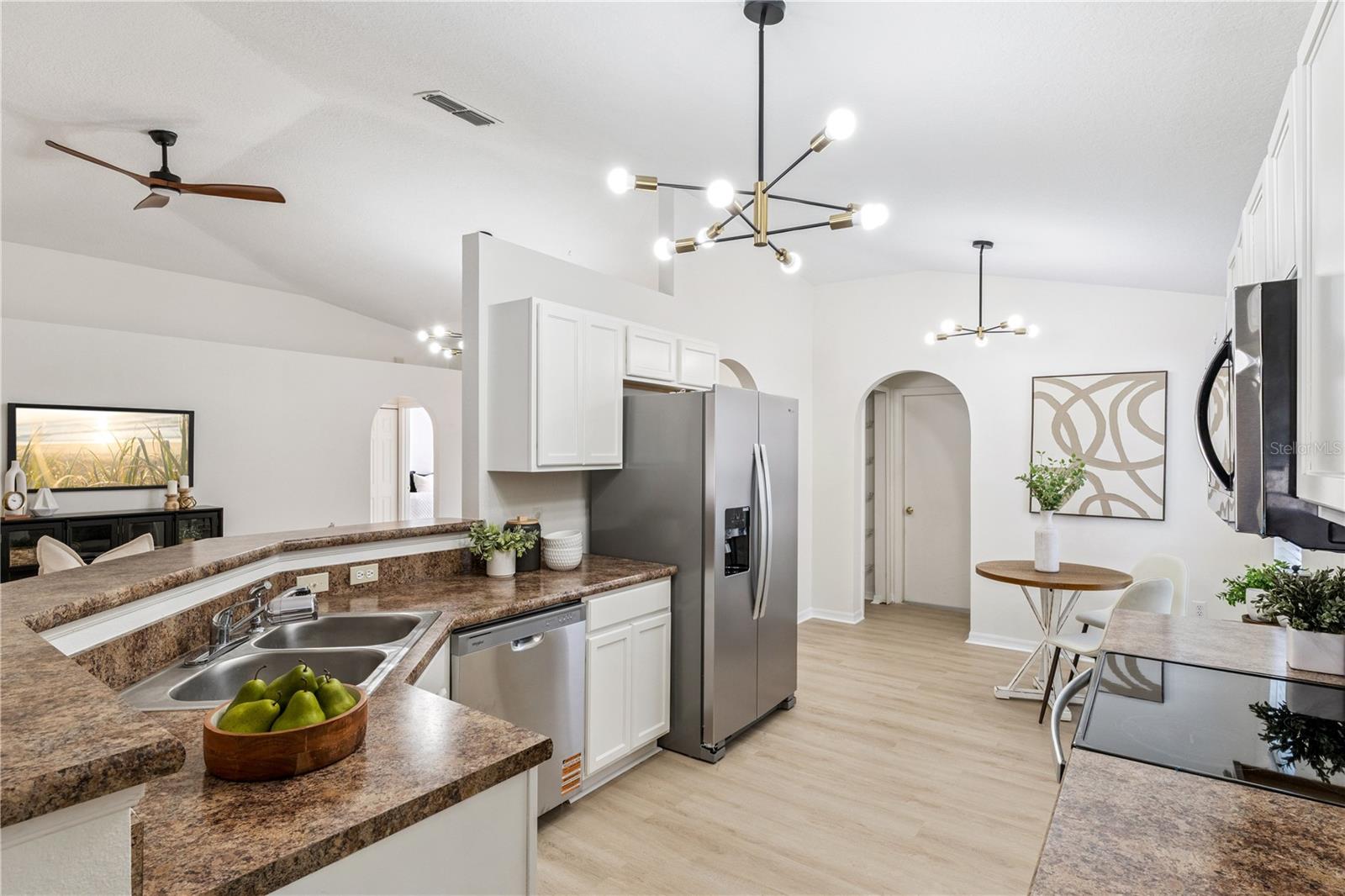 This beautifully updated 3 bedroom, 2 bathroom home with over 1,600 sq ft has been transformed from top to bottom in 2026. New LVP flooring throughout, fresh interior paint (ceilings and baseboards included), fully remodeled primary and hall bathrooms, new stainless steel refrigerator, dishwasher, microwave and garbage disposal: plus, new blinds, light fixtures, and fans. There is nothing left to do but move in. The open floorplan with vaulted ceilings feels bright and spacious. Enjoy Florida weather in the screened in porch and the fenced backyard with a peaceful wooded view giving you added privacy. Tucked away on a quiet cul-de-sac street. Major systems are solid: Roof 2018, HVAC 2016. Grocery stores and everyday conveniences are just minutes away, and you're approximately 15 minutes from UCF. Waterford Lakes Town Center with plenty of shopping and dining options also approx. 15 min. Cocoa Beach and Cape Canaveral are about an hours drive. ** Room sizes are approximate and it is the buyers responsibility to confirm.