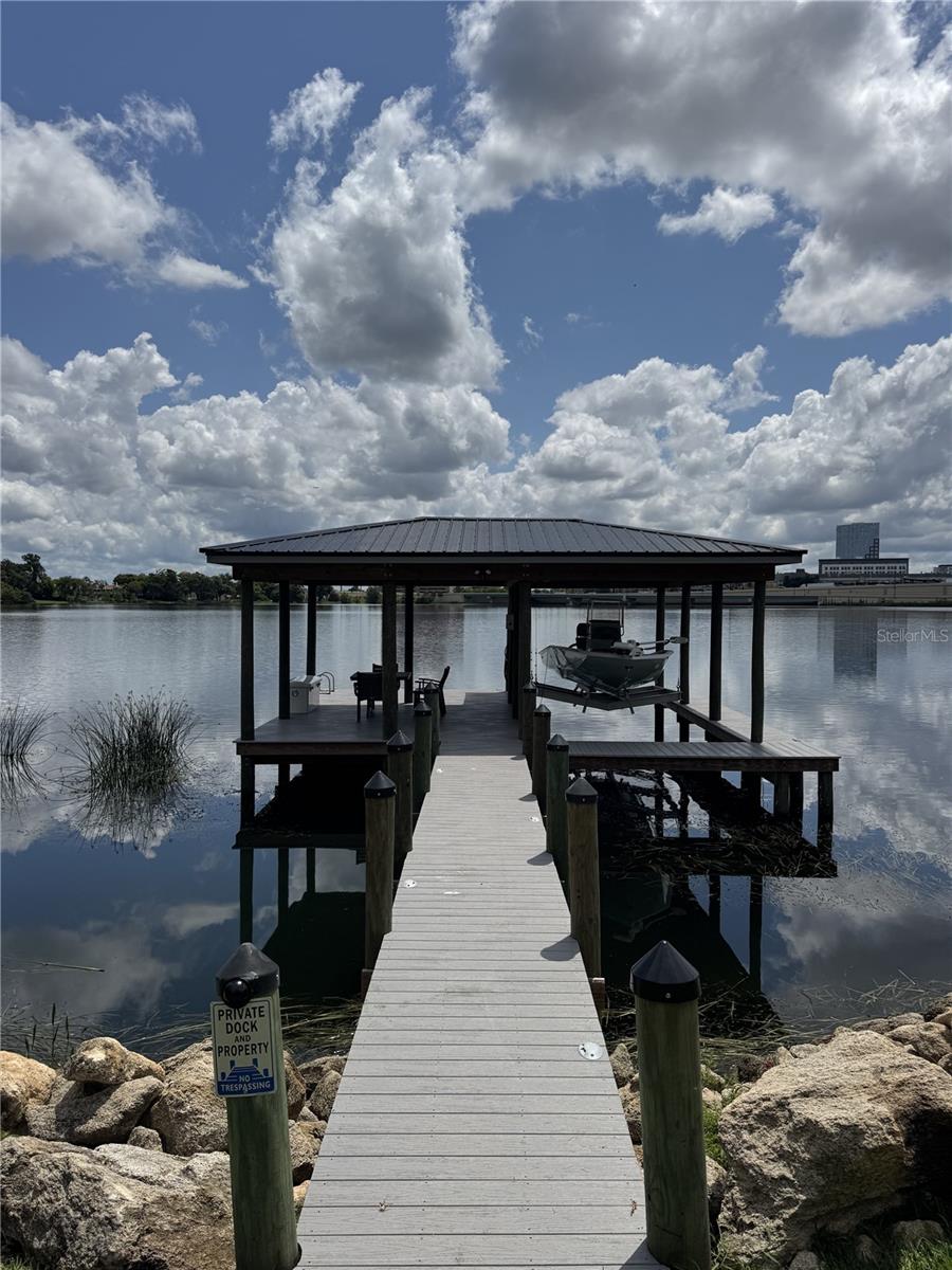Stunning Modern Lakefront Home in College Park – Fully Renovated with Private Dock and Boat Ramp Rarely does a property like this come to market. With 152 feet of private frontage on Lake Concord—including the only private boat ramp on the lake—this completely renovated 3-bedroom, 3.5-bath home blends bold modern design with one-of-a-kind waterfront living in the heart of College Park. Inside, no detail was overlooked. The home features dual primary suites, each with spa-style ensuite baths and custom closets, offering flexibility and comfort for guests or household members. A sleek open-concept layout showcases polished oversized porcelain tile floors, designer lighting, and panoramic lake views from nearly every room. The kitchen is a showpiece: outfitted with high-gloss white cabinetry, quartz countertops, a glass tile backsplash, stainless steel KitchenAid appliances, and modern LED lighting fixtures. Adjacent dining and lounge areas flow naturally into the lake-facing great room and a corner office that captures sunrise over the water. Thoughtful upgrades include modern ceiling fans, art-inspired finishes, and gallery walls perfect for collectors. Every major system and finish has been addressed. The roof was replaced in 2023, and the home features a new hot water heater, all-new electrical wiring, a new panel with underground 200A service, and a transfer switch ready for generator backup. The exterior was fully redone as part of the renovation, including updated stucco, paint, modern trim details, and new garage doors—ensuring long-term curb appeal and low maintenance. A true basement—uncommon in Central Florida—offers flexible utility/storage space plus a half bath connected to the two-car garage. Outside, enjoy a fully fenced backyard retreat featuring a modern pergola-covered composite deck and hot tub spa, creating a perfect setting for relaxation or entertaining. Step across the quiet residential street to your private lakefront parcel, where a custom covered dock awaits. Built with composite decking, the dock includes LED perimeter lighting, power, water, and a lift for your boat, plus space for lounging or casting a line. By day, enjoy panoramic views of downtown Orlando's skyline across the water. By night, the dock comes alive with accent lighting and underwater illumination. Located in the College Park neighborhood, just minutes from Downtown Orlando, Ivanhoe Village, Mills 50, and major roadways—this is urban lakefront living with total privacy, high design, and turn-key peace of mind.
