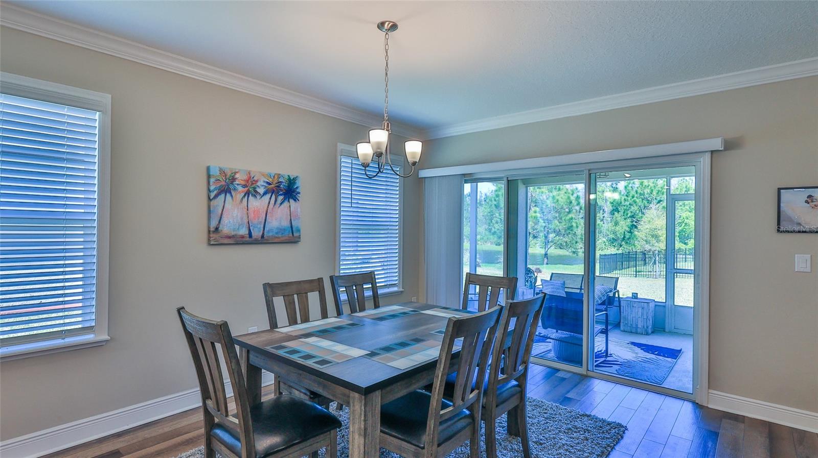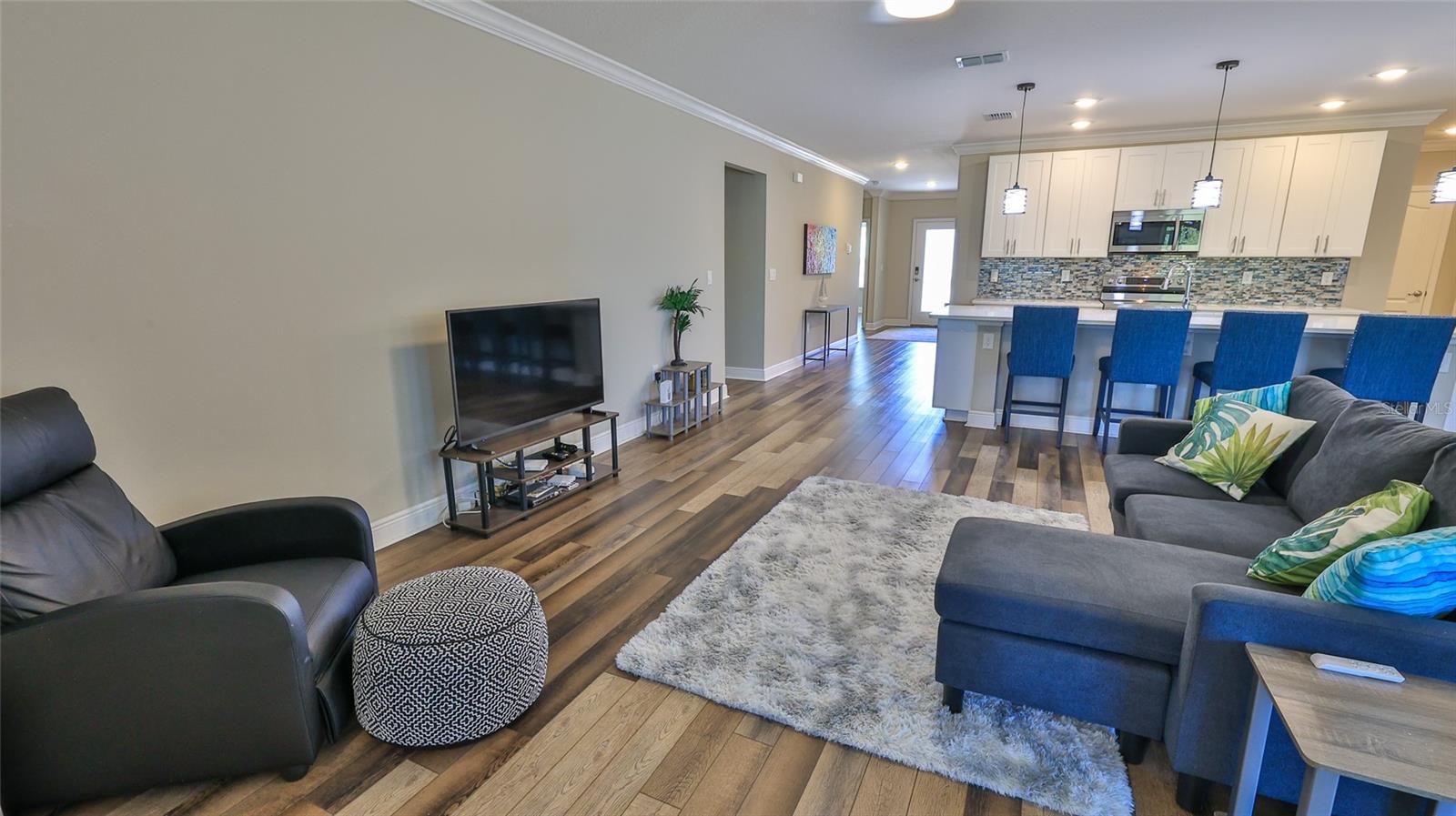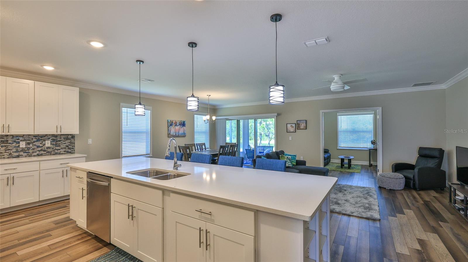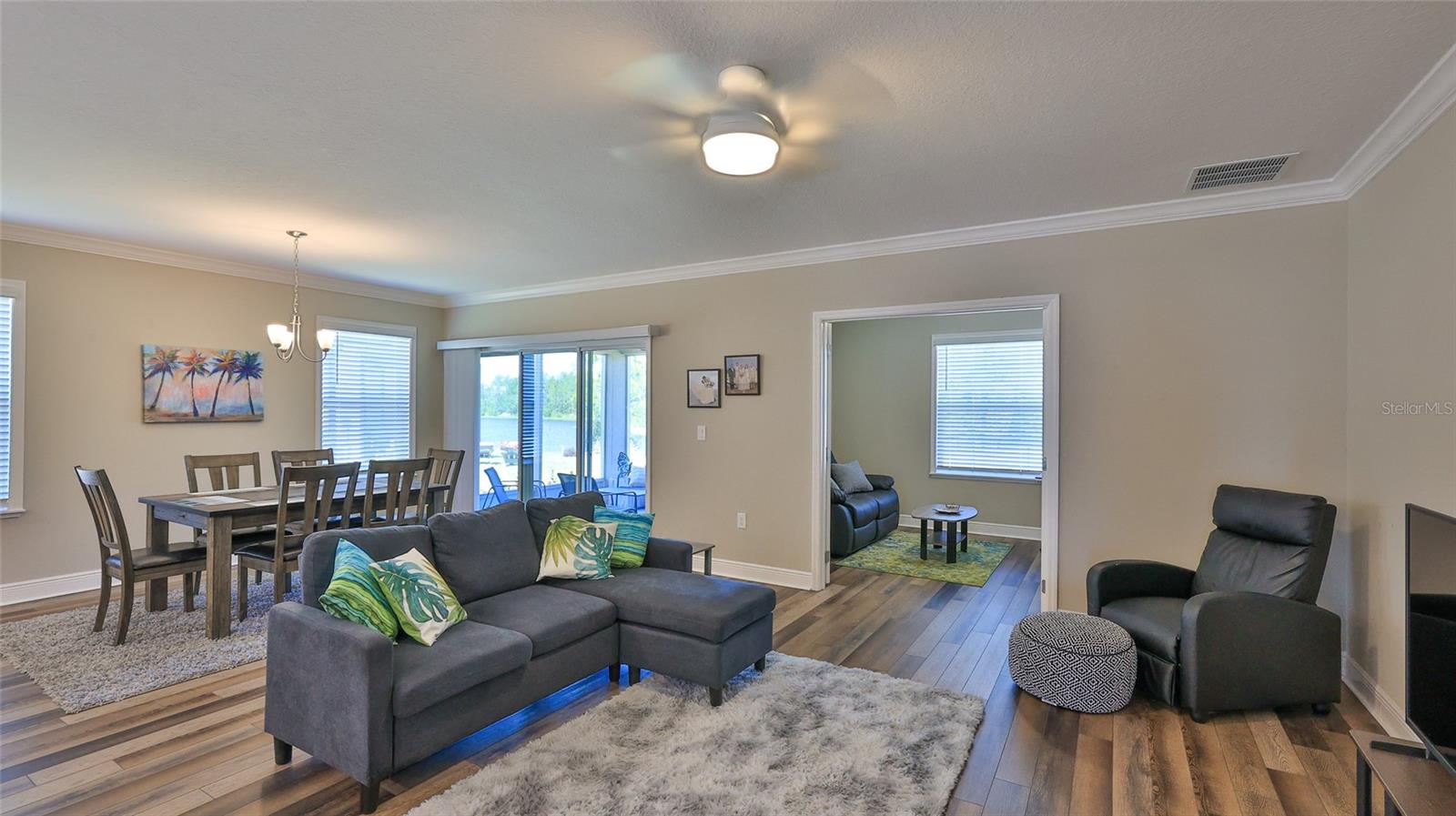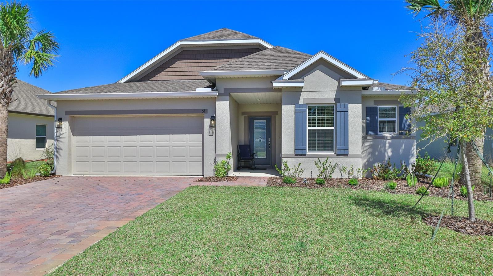 Maintenance free living in the 55+ community of Huntington Green at Hunter's Ridge. This home was finished in late 2022 and features 3 bedrooms, 2 baths, kitchen with large center island overlooking great room and dining area. Other upgrades including deluxe kitchen cabinetry, quartz counters, Samsung stainless appliances, crown molding, designer vinyl flooring throughout, ceiling fans and blinds on all windows. Large primary suite with walk in closet and primary bath with tile flooring, double vanity, large shower with 3 shower heads, glass doors. Bonus/flex room and screened porch overlook large back yard with views of lake. Two car garage. Huntington Green also has a private pool and club house with fitness plus owners can use two other clubhouses in Hunter's Ridge Community. Main and Sub HOA fees total $352 / month.
