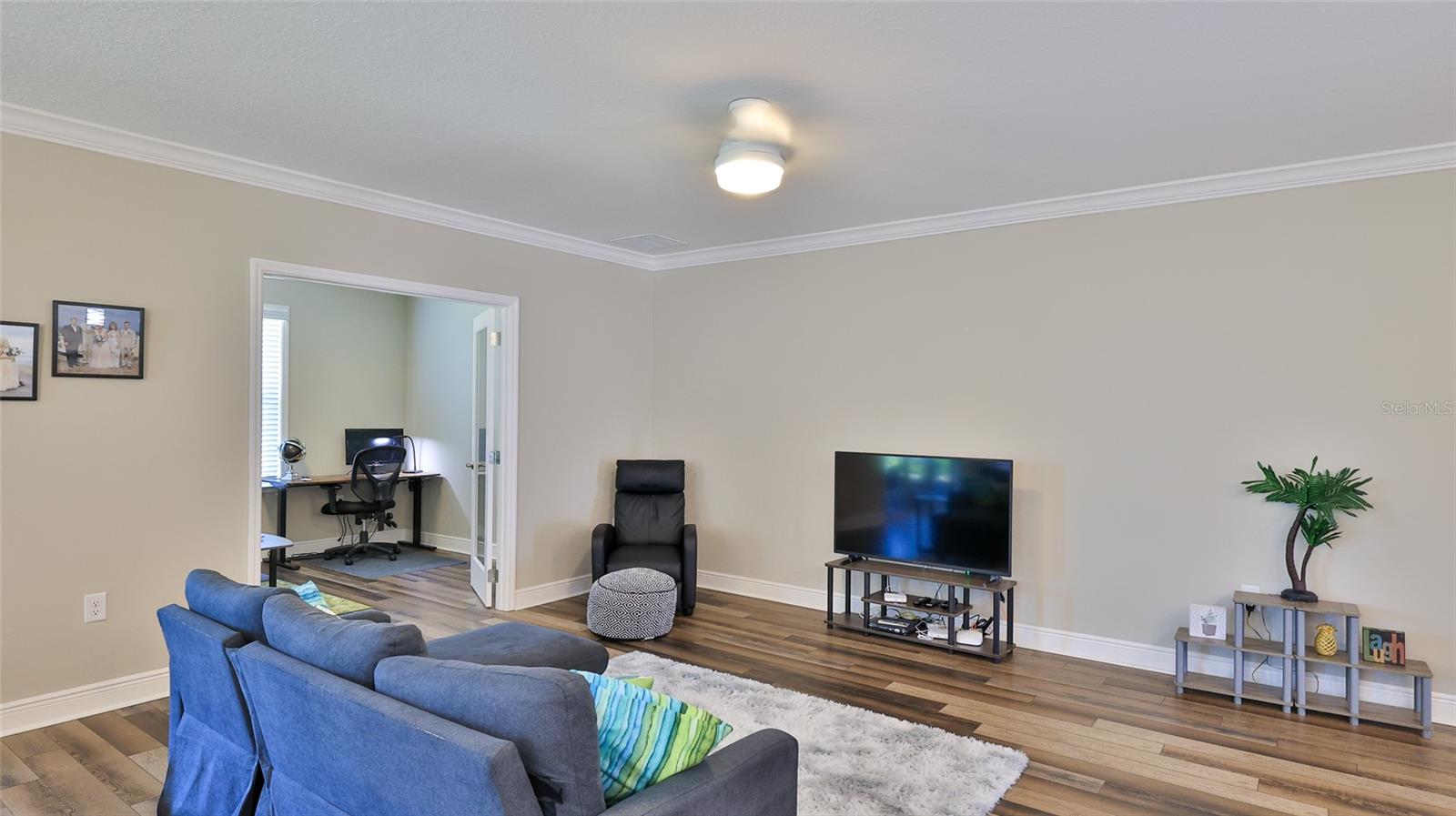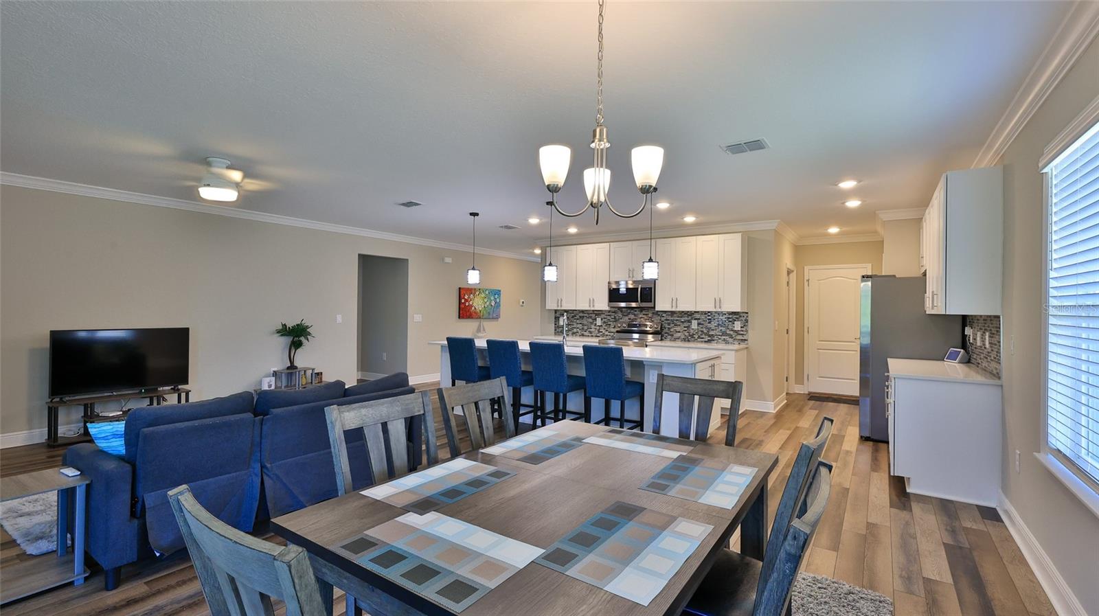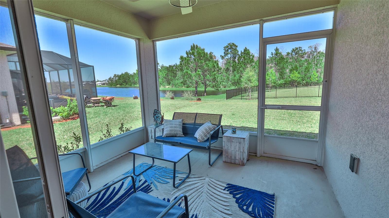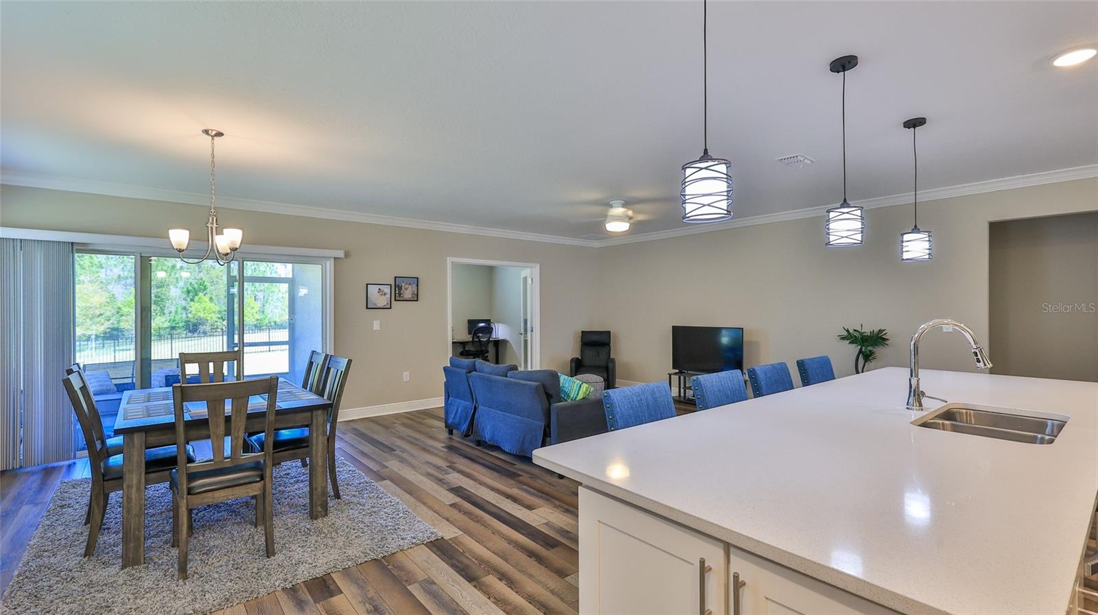 Maintenance free living in the 55+ community of Huntington Green at Hunter's Ridge. This home was finished in late 2022 and features 3 bedrooms, 2 baths, kitchen with large center island overlooking great room and dining area. Other upgrades including deluxe kitchen cabinetry, quartz counters, Samsung stainless appliances, crown molding, designer vinyl flooring throughout, ceiling fans and blinds on all windows. Large primary suite with walk in closet and primary bath with tile flooring, double vanity, large shower with 3 shower heads, glass doors. Bonus/flex room and screened porch overlook large back yard with views of lake. Two car garage. Huntington Green also has a private pool and club house with fitness plus owners can use two other clubhouses in Hunter's Ridge Community. Main and Sub HOA fees total $352 / month.