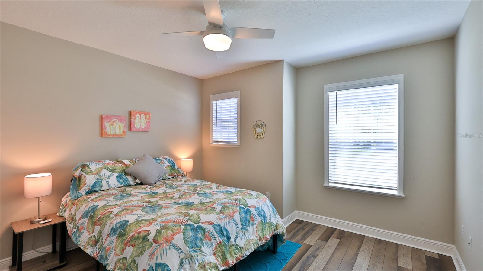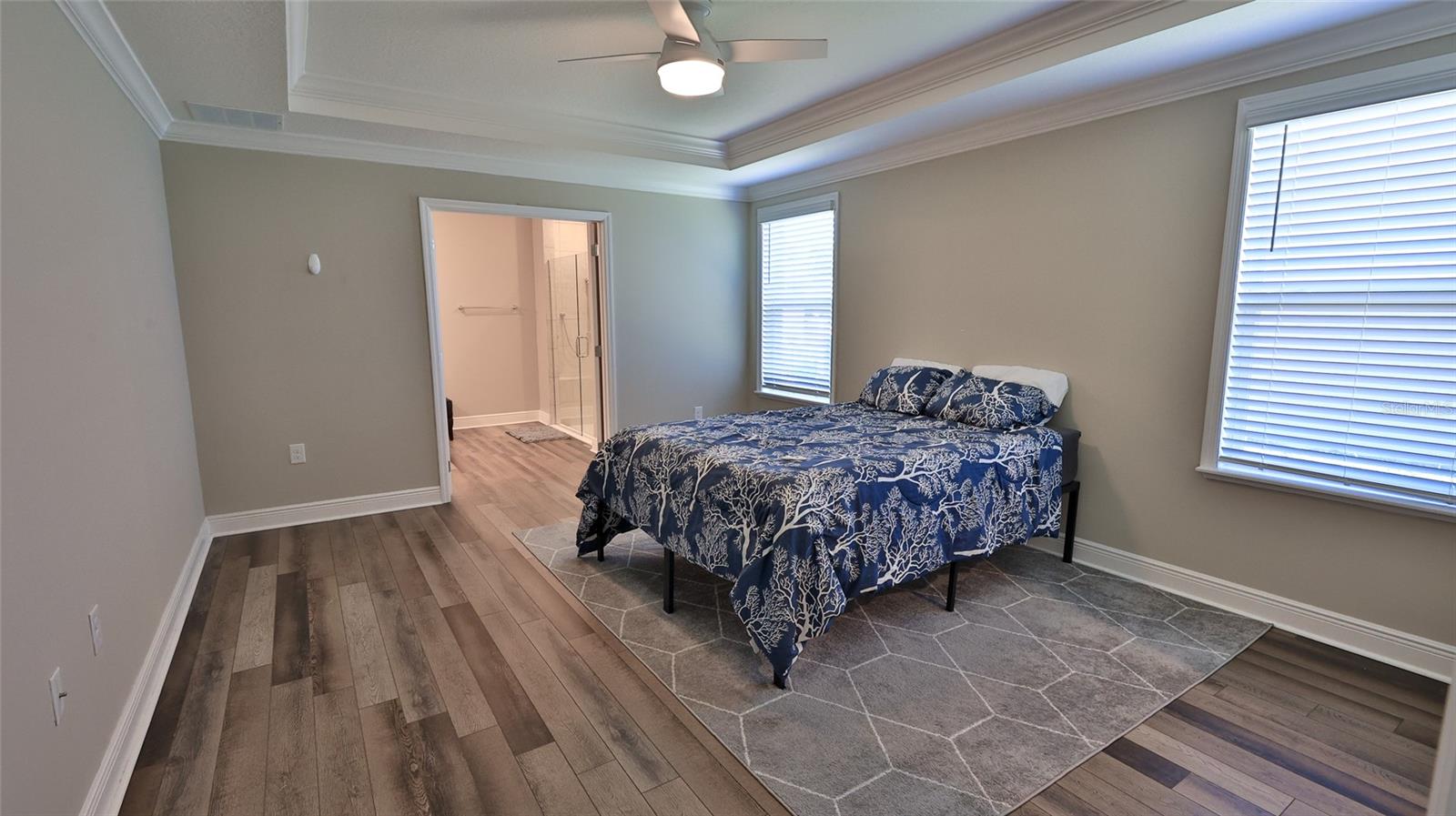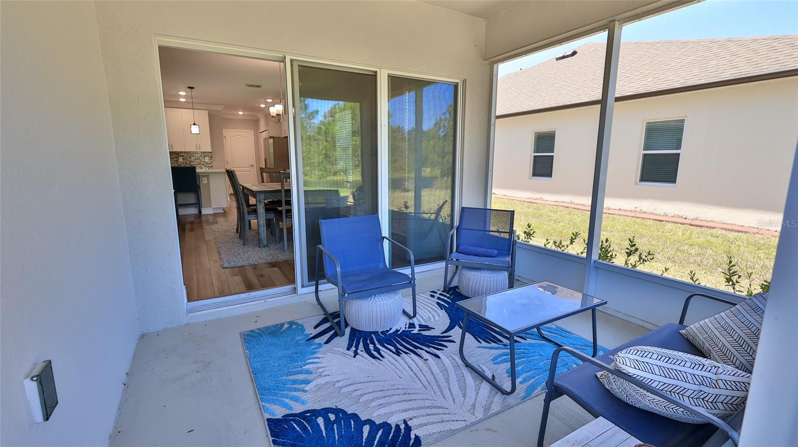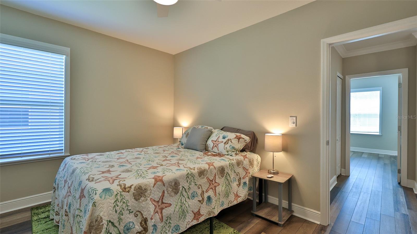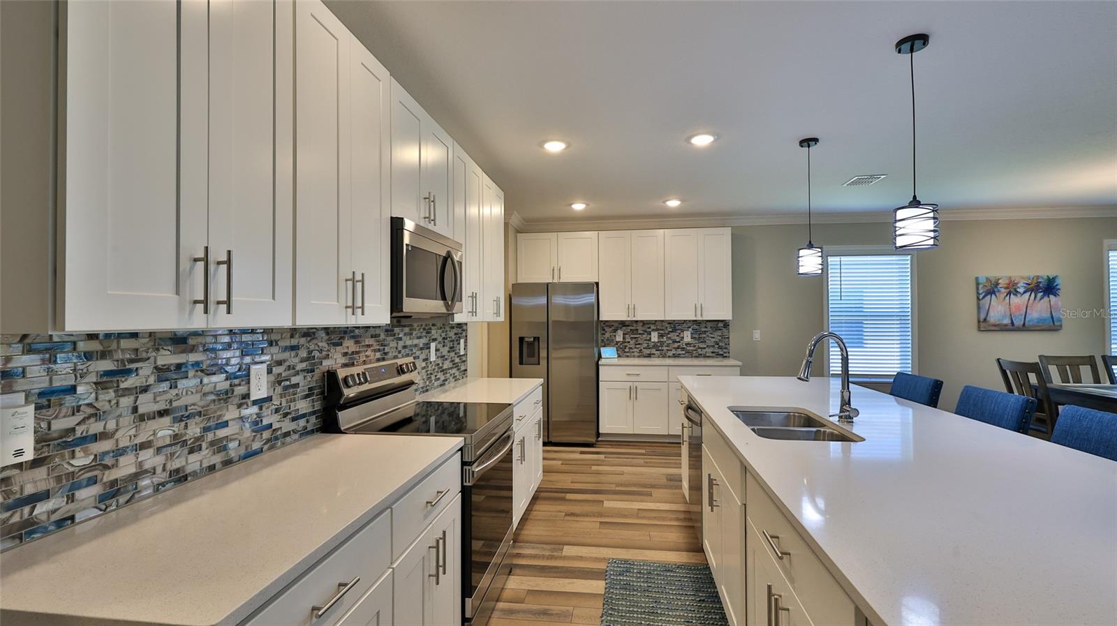 Maintenance free living in the 55+ community of Huntington Green at Hunter's Ridge. This home was finished in late 2022 and features 3 bedrooms, 2 baths, kitchen with large center island overlooking great room and dining area. Other upgrades including deluxe kitchen cabinetry, quartz counters, Samsung stainless appliances, crown molding, designer vinyl flooring throughout, ceiling fans and blinds on all windows. Large primary suite with walk in closet and primary bath with tile flooring, double vanity, large shower with 3 shower heads, glass doors. Bonus/flex room and screened porch overlook large back yard with views of lake. Two car garage. Huntington Green also has a private pool and club house with fitness plus owners can use two other clubhouses in Hunter's Ridge Community. Main and Sub HOA fees total $352 / month.