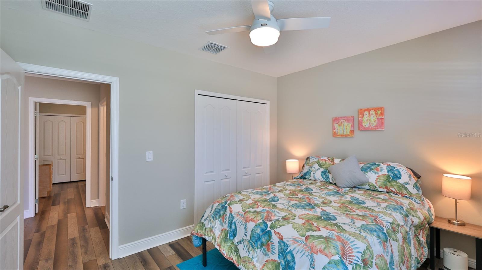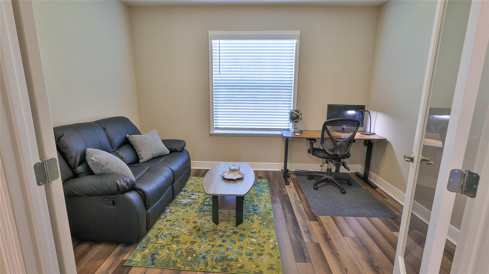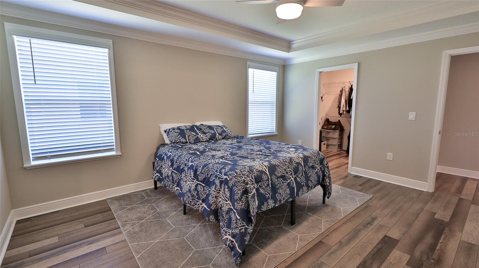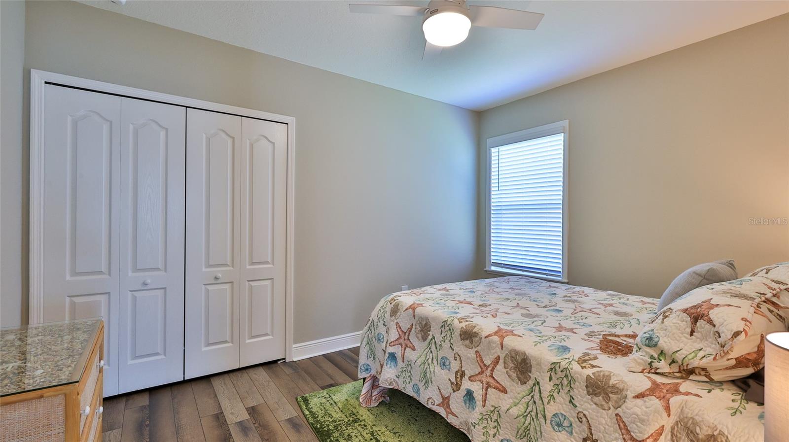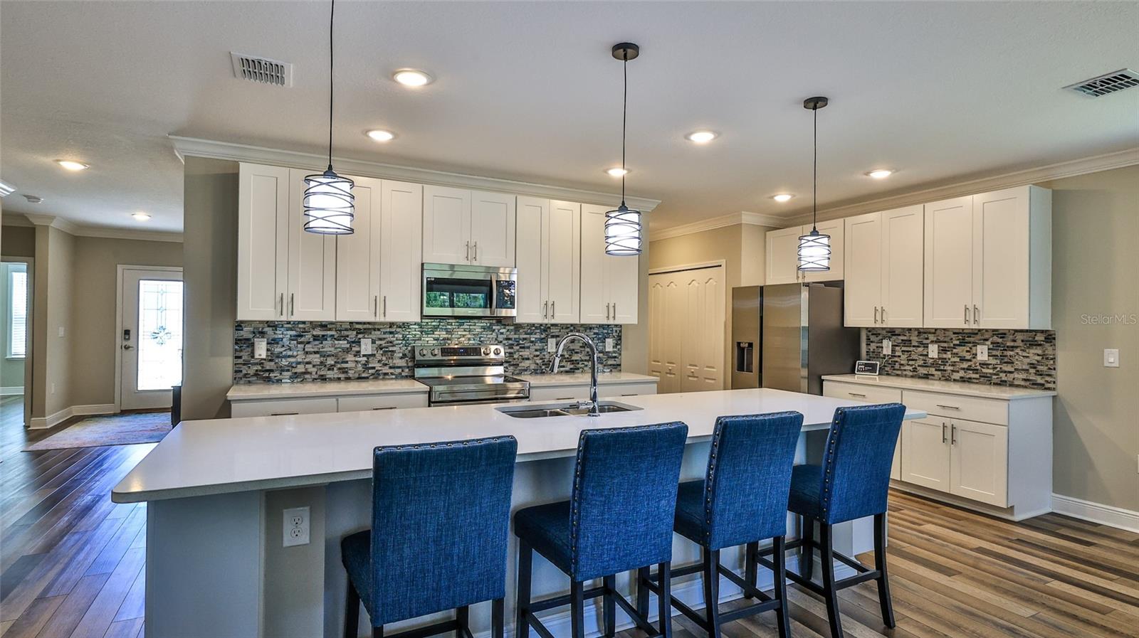 Maintenance free living in the 55+ community of Huntington Green at Hunter's Ridge. This home was finished in late 2022 and features 3 bedrooms, 2 baths, kitchen with large center island overlooking great room and dining area. Other upgrades including deluxe kitchen cabinetry, quartz counters, Samsung stainless appliances, crown molding, designer vinyl flooring throughout, ceiling fans and blinds on all windows. Large primary suite with walk in closet and primary bath with tile flooring, double vanity, large shower with 3 shower heads, glass doors. Bonus/flex room and screened porch overlook large back yard with views of lake. Two car garage. Huntington Green also has a private pool and club house with fitness plus owners can use two other clubhouses in Hunter's Ridge Community. Main and Sub HOA fees total $352 / month.